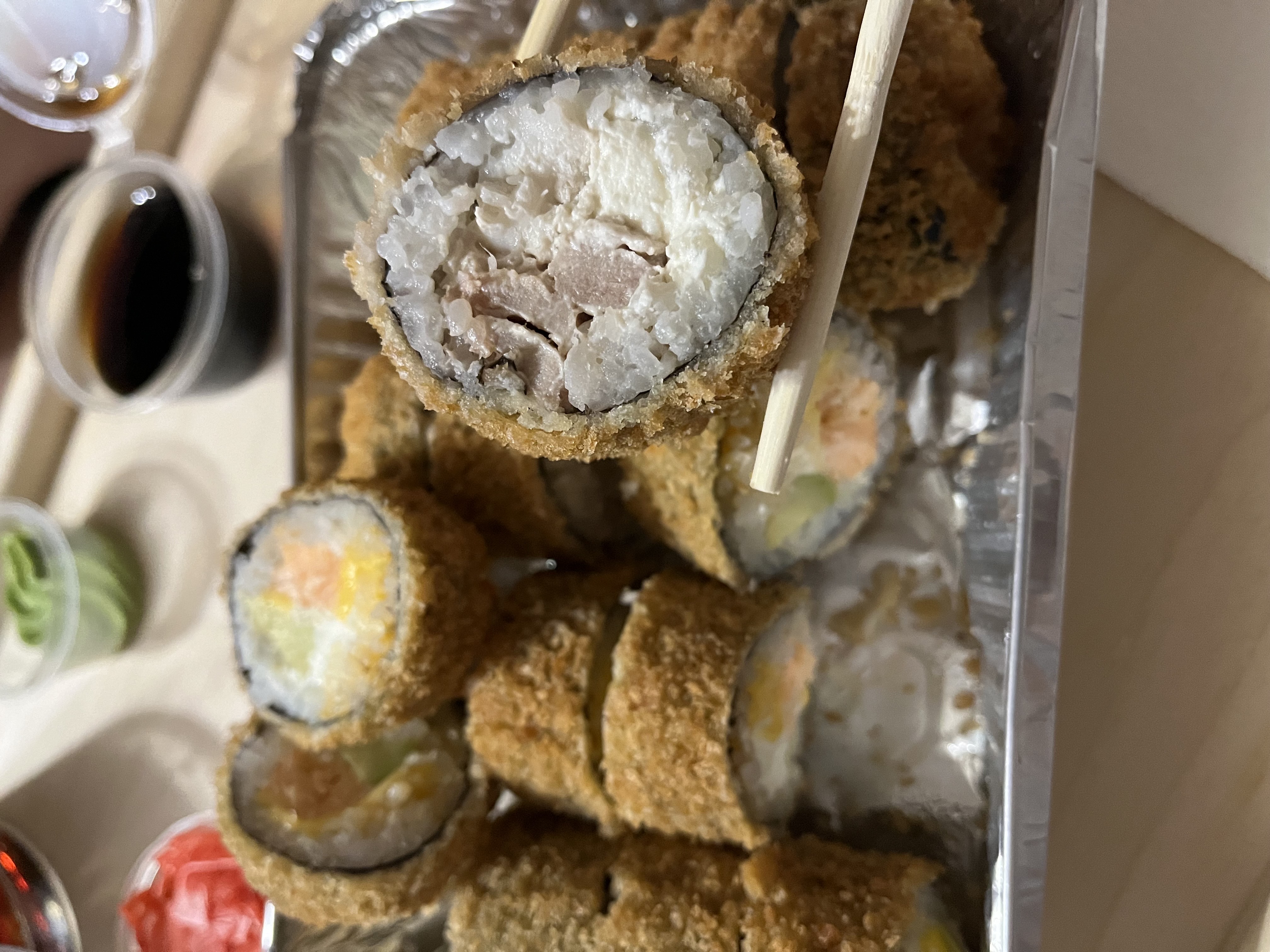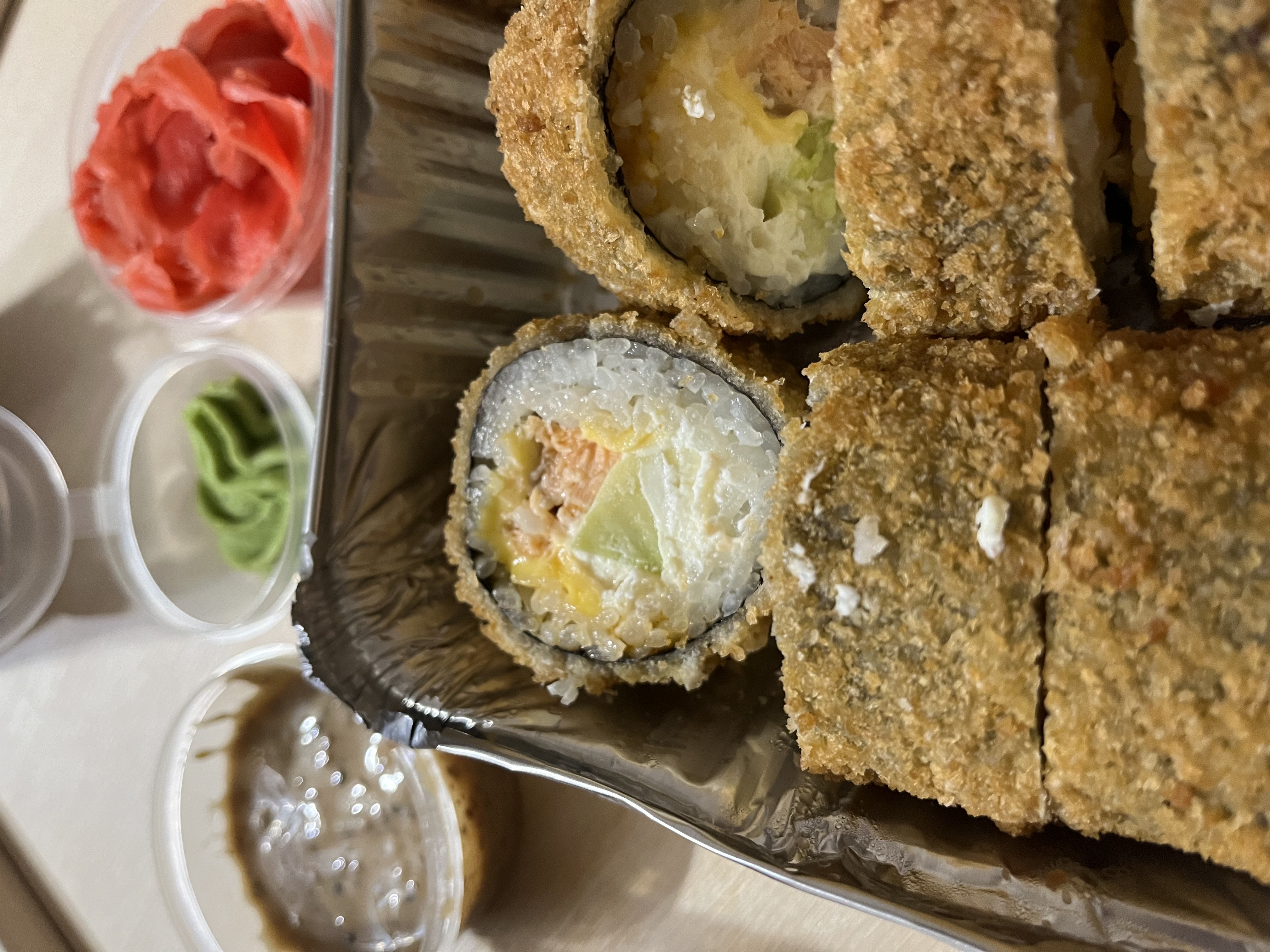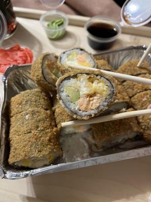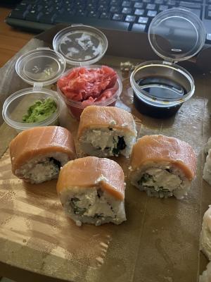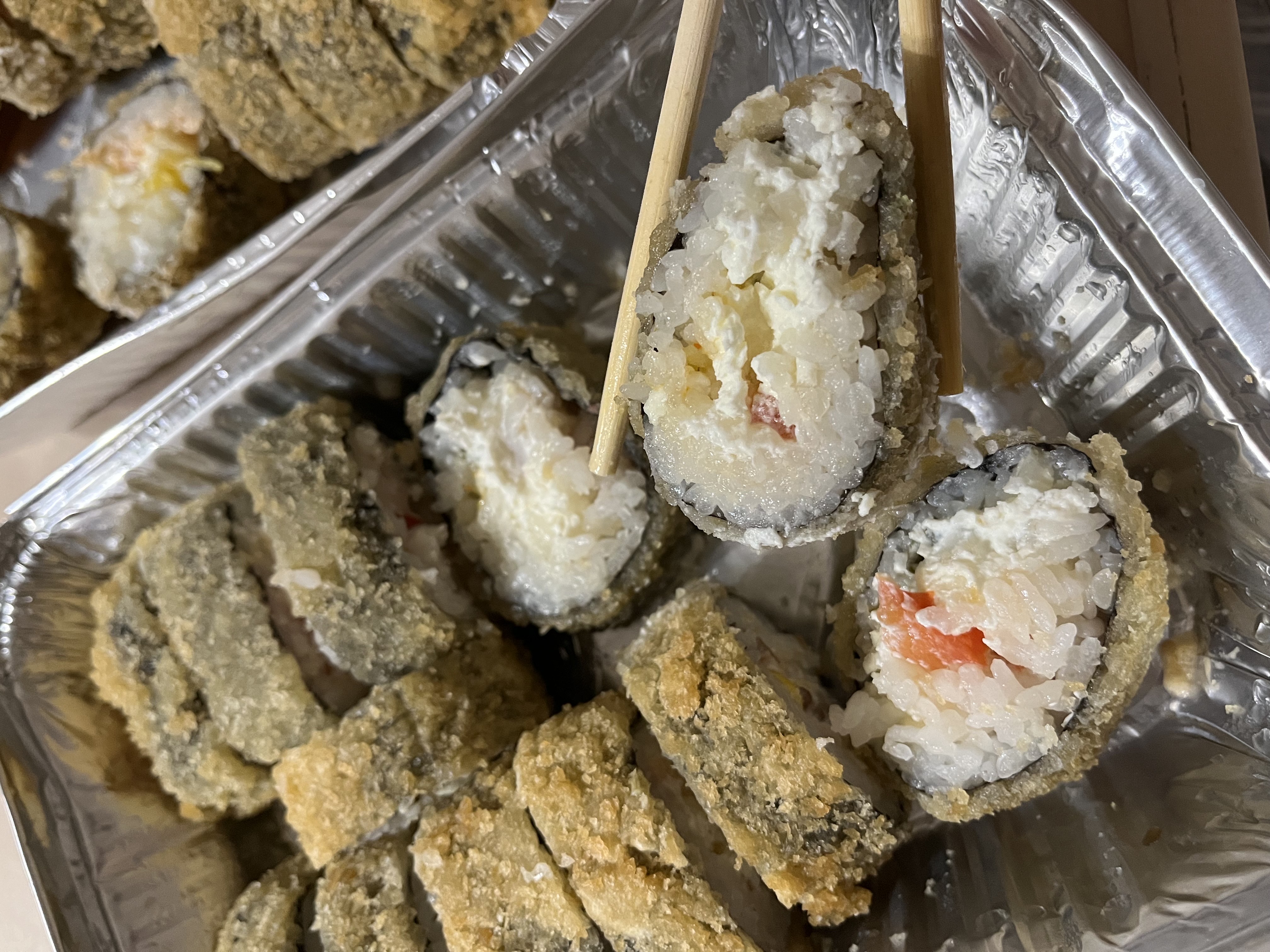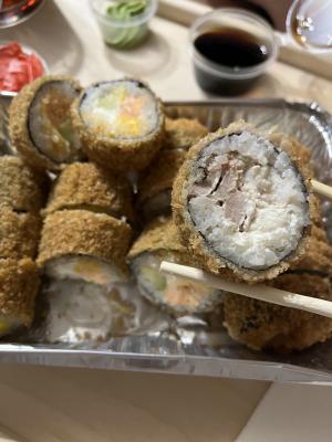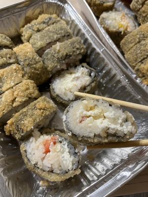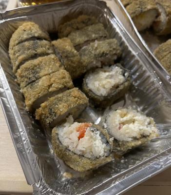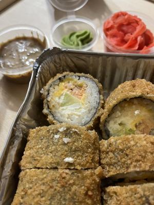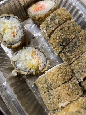 - В теплых ролла крайние кусочки отдаются запечатанными, так как большинству нравится дополнительная панировка на роллах!
