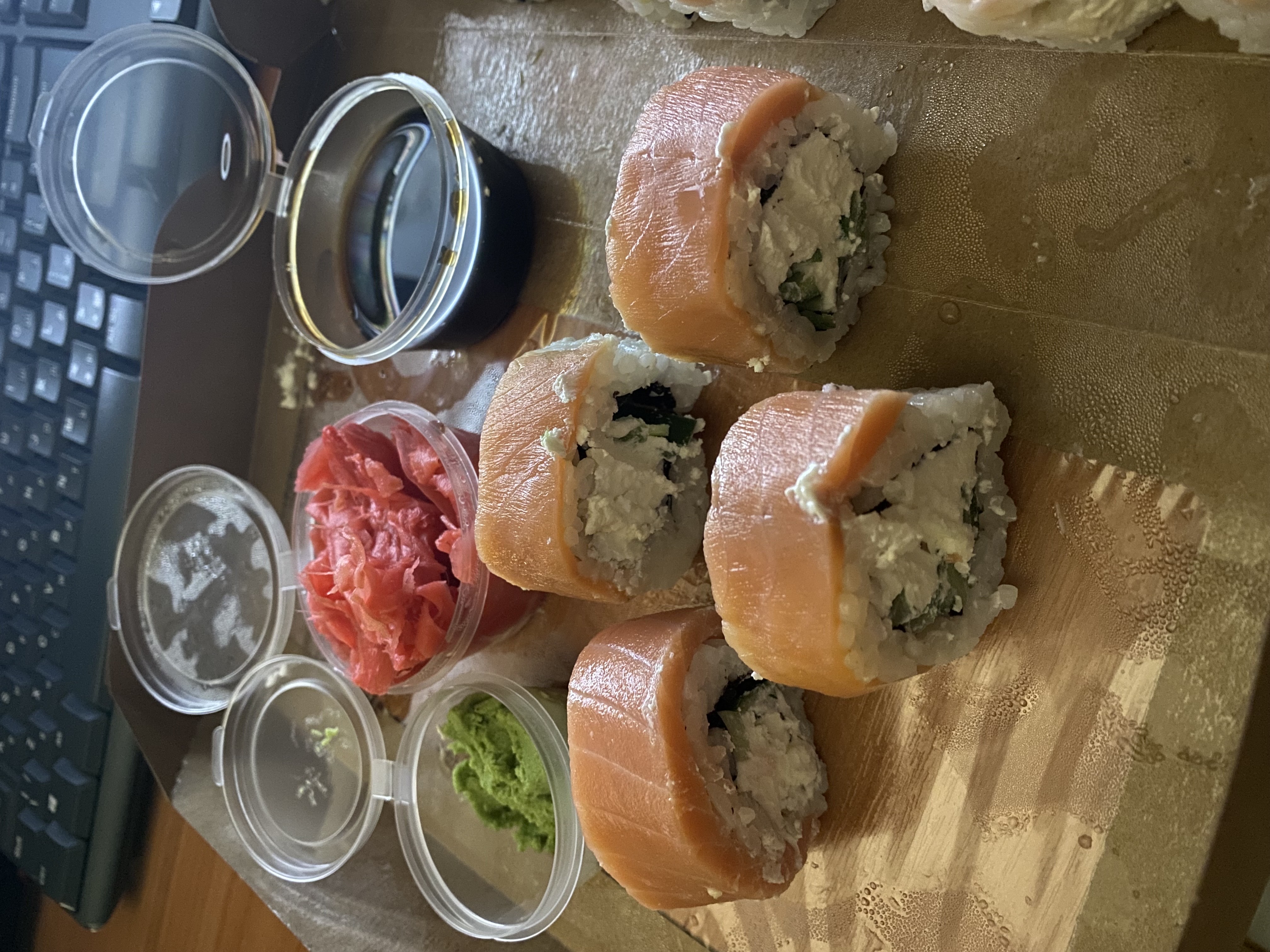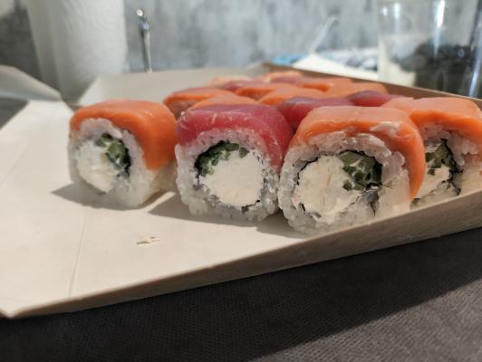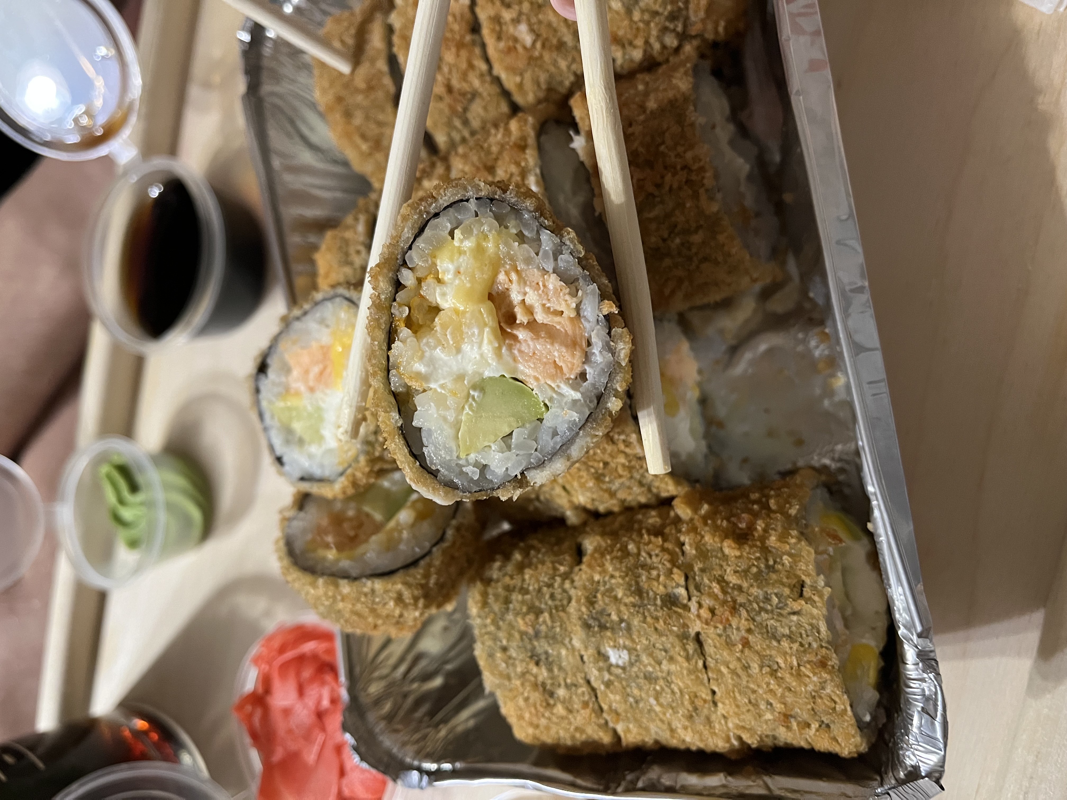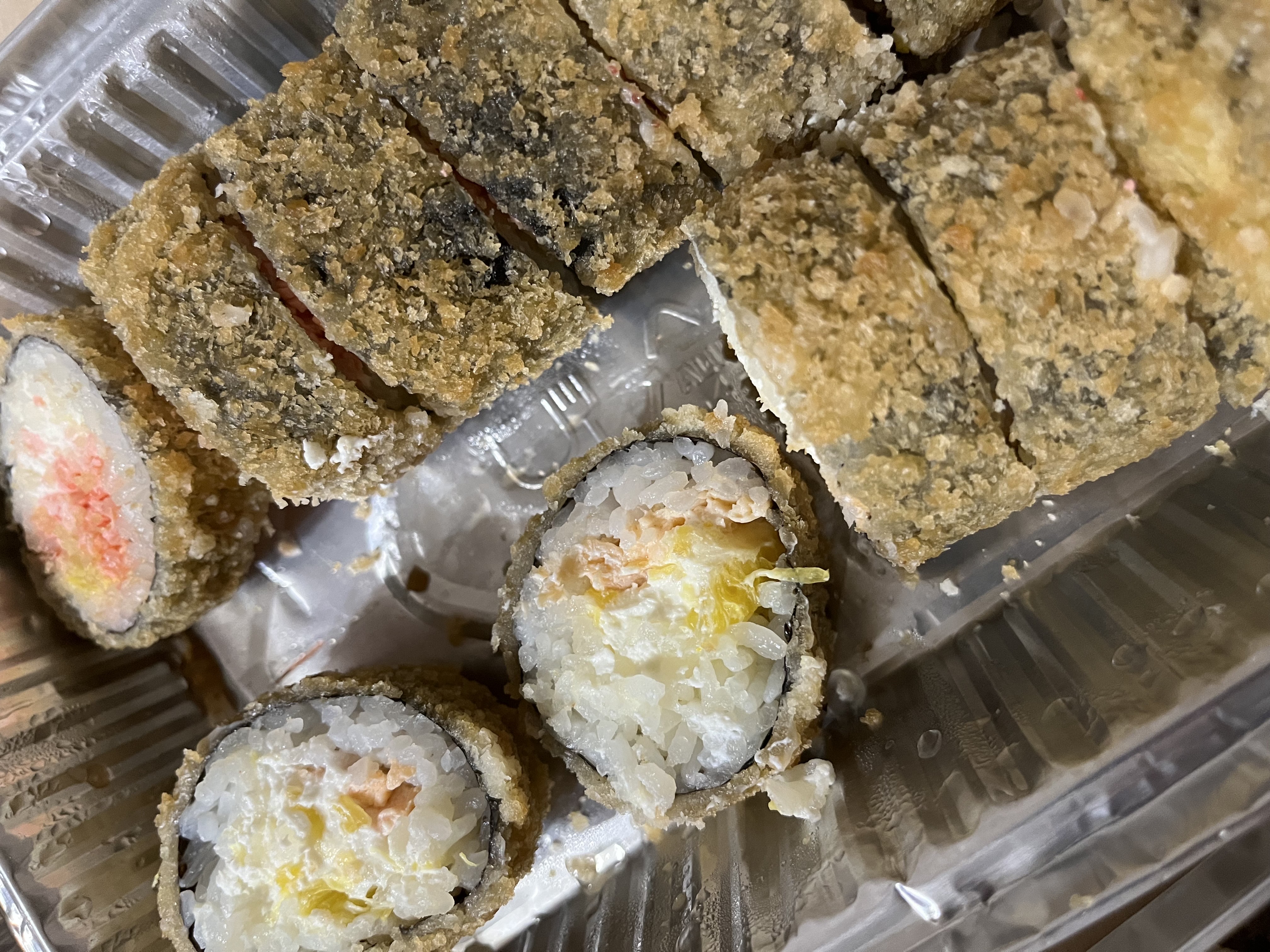 - В теплых ролла крайние кусочки отдаются запечатанными, так как большинству нравится дополнительная панировка на роллах!