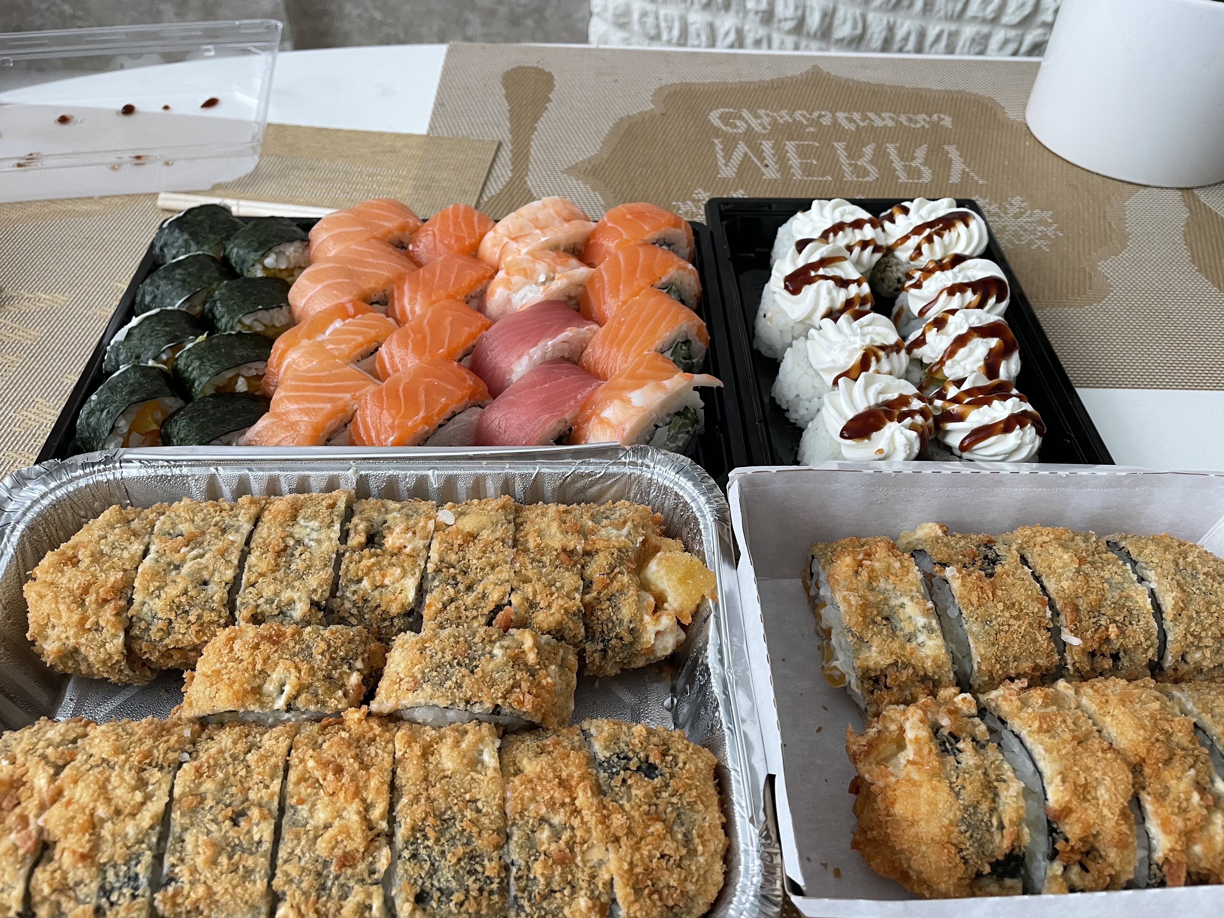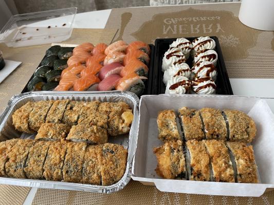 - В теплых ролла крайние кусочки отдаются запечатанными, так как большинству нравится дополнительная панировка на роллах!