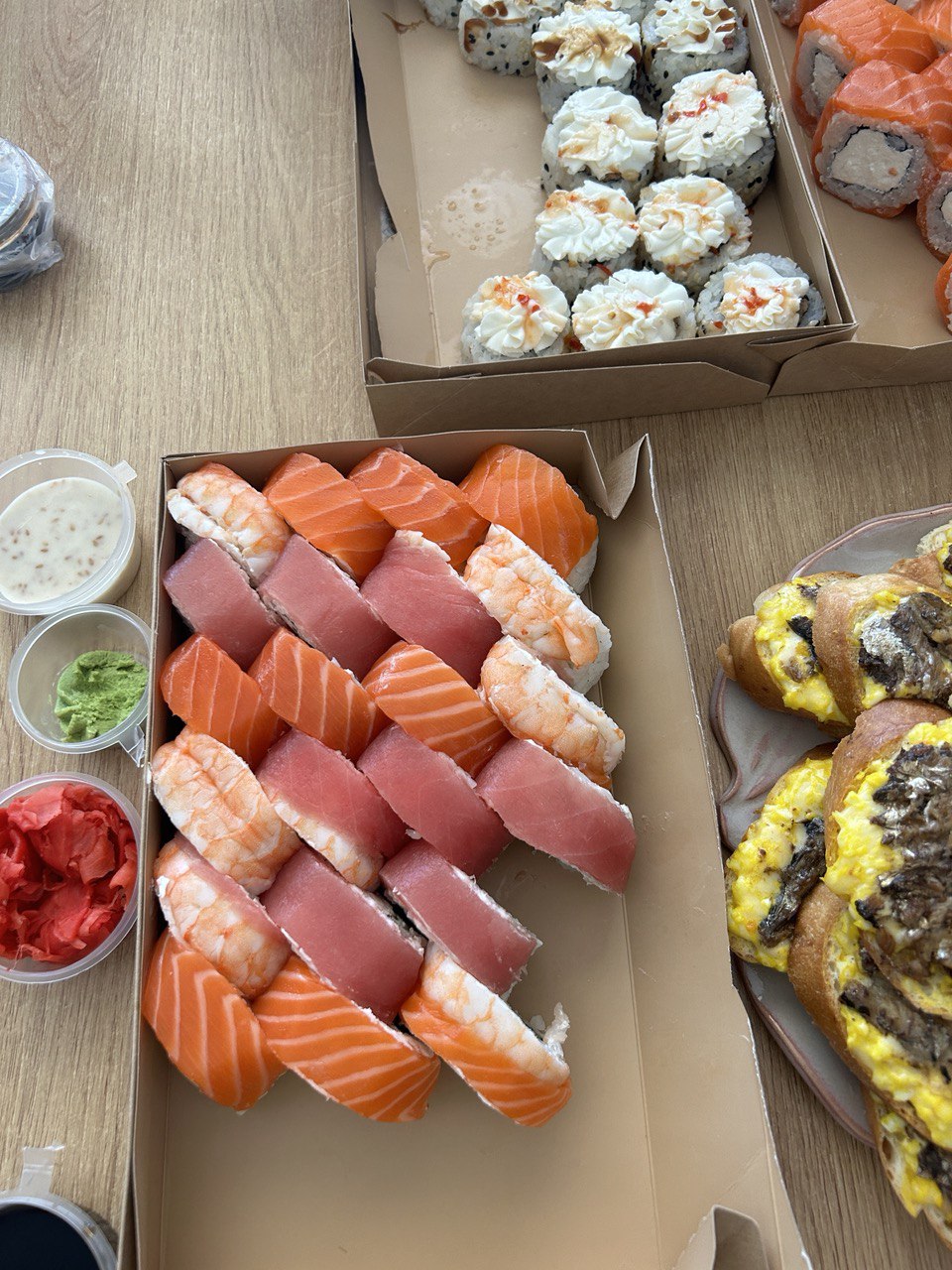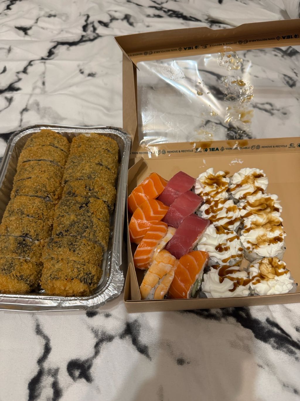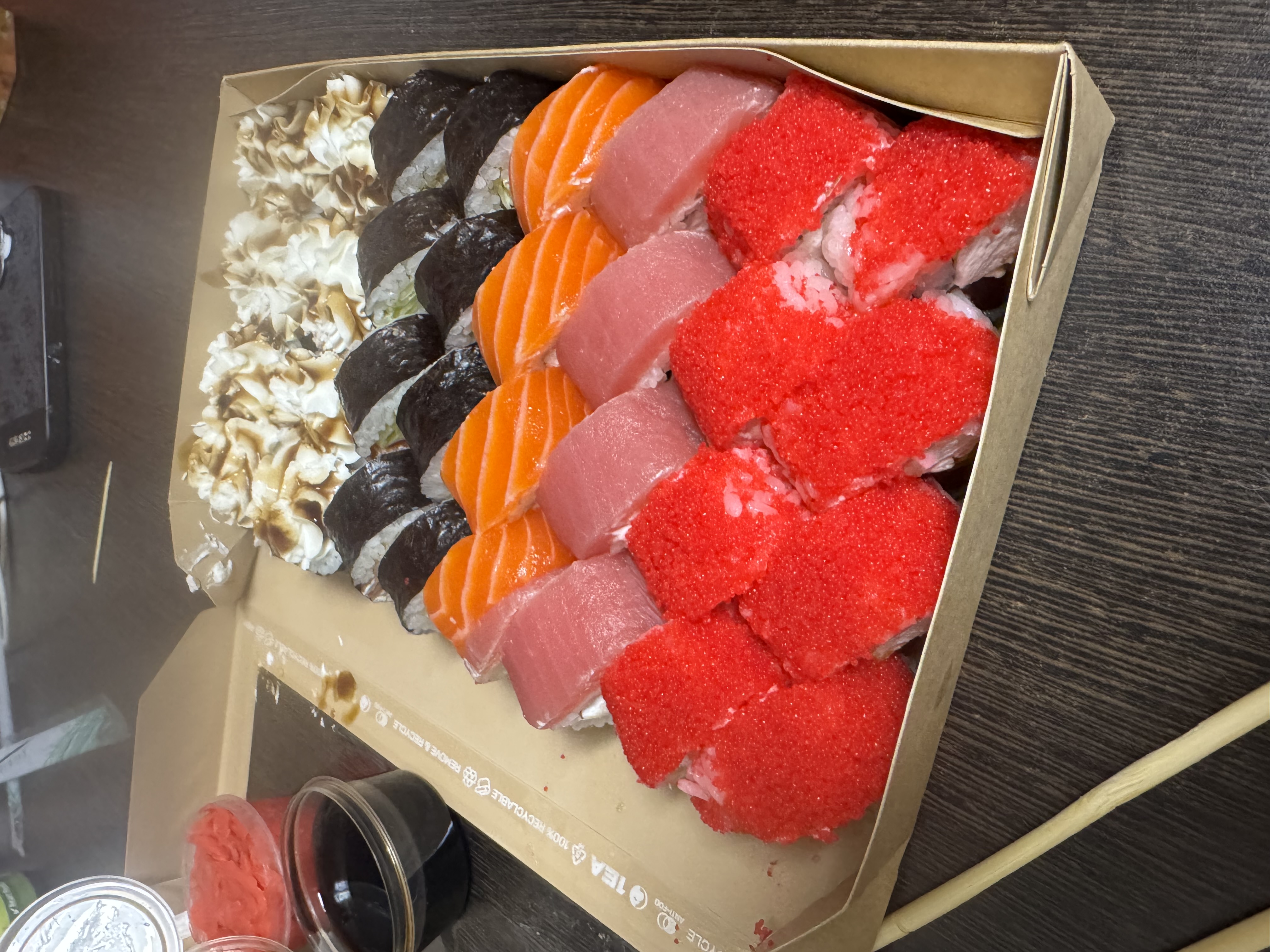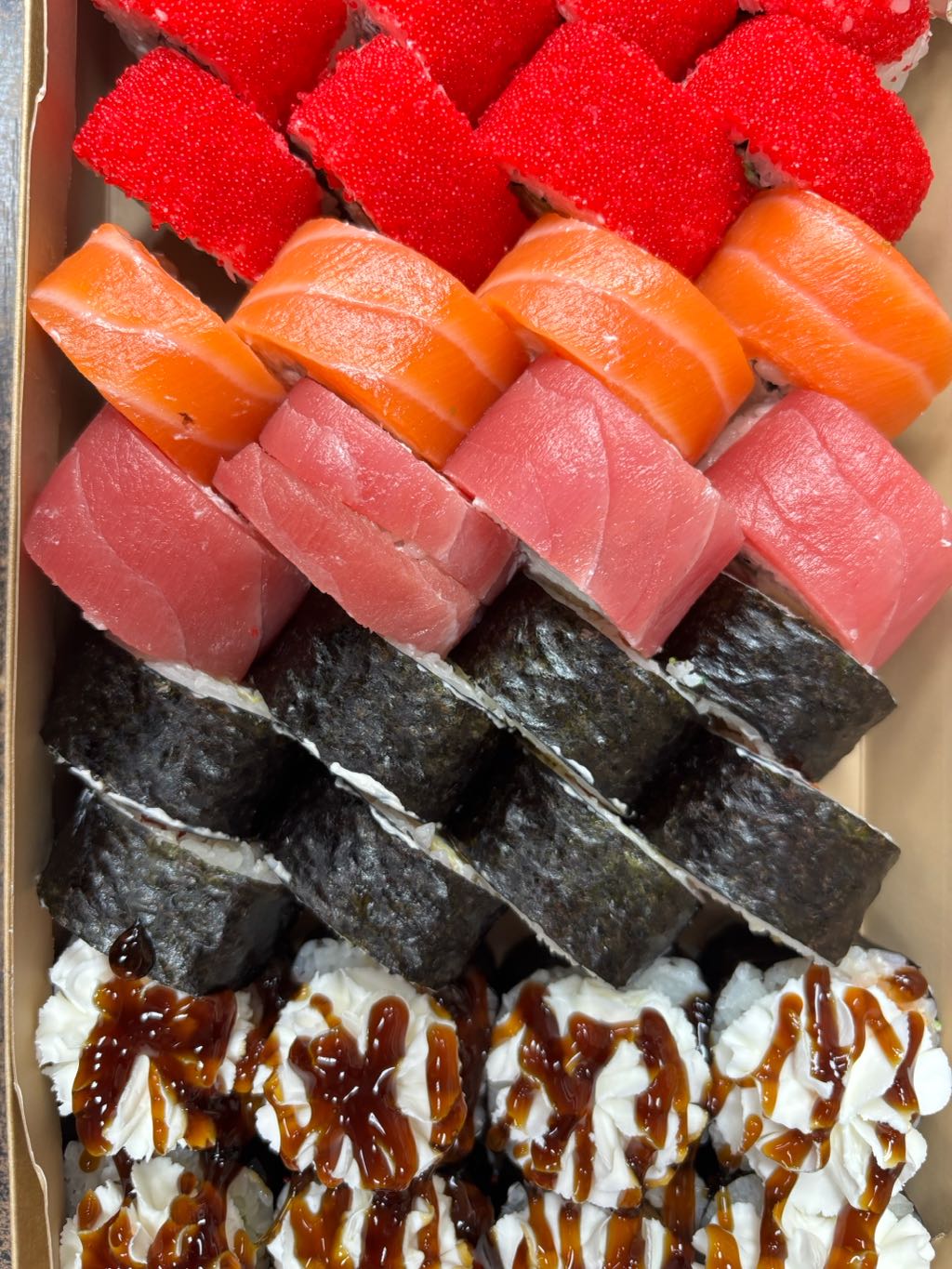 - В теплых ролла крайние кусочки отдаются запечатанными, так как большинству нравится дополнительная панировка на роллах!