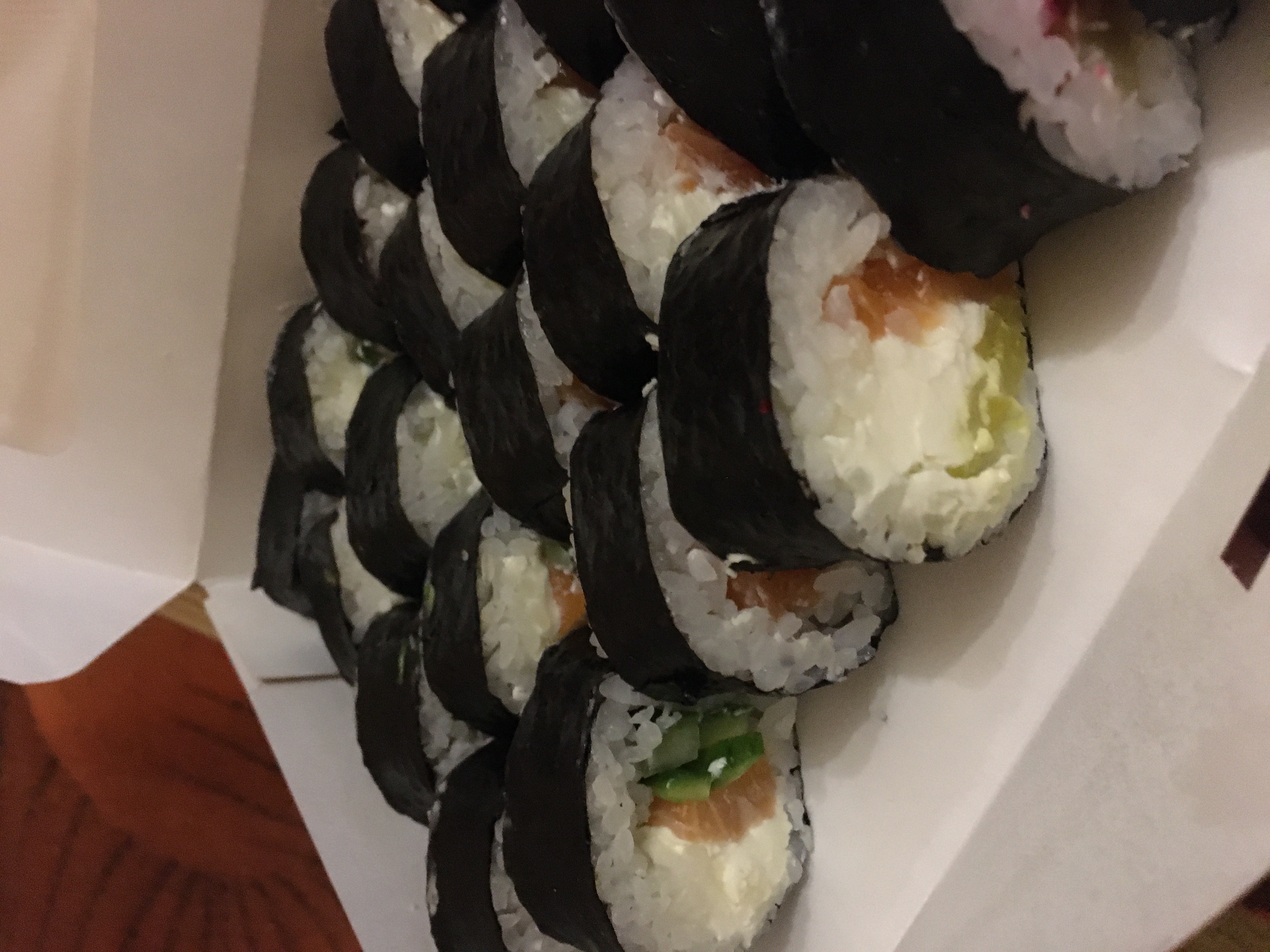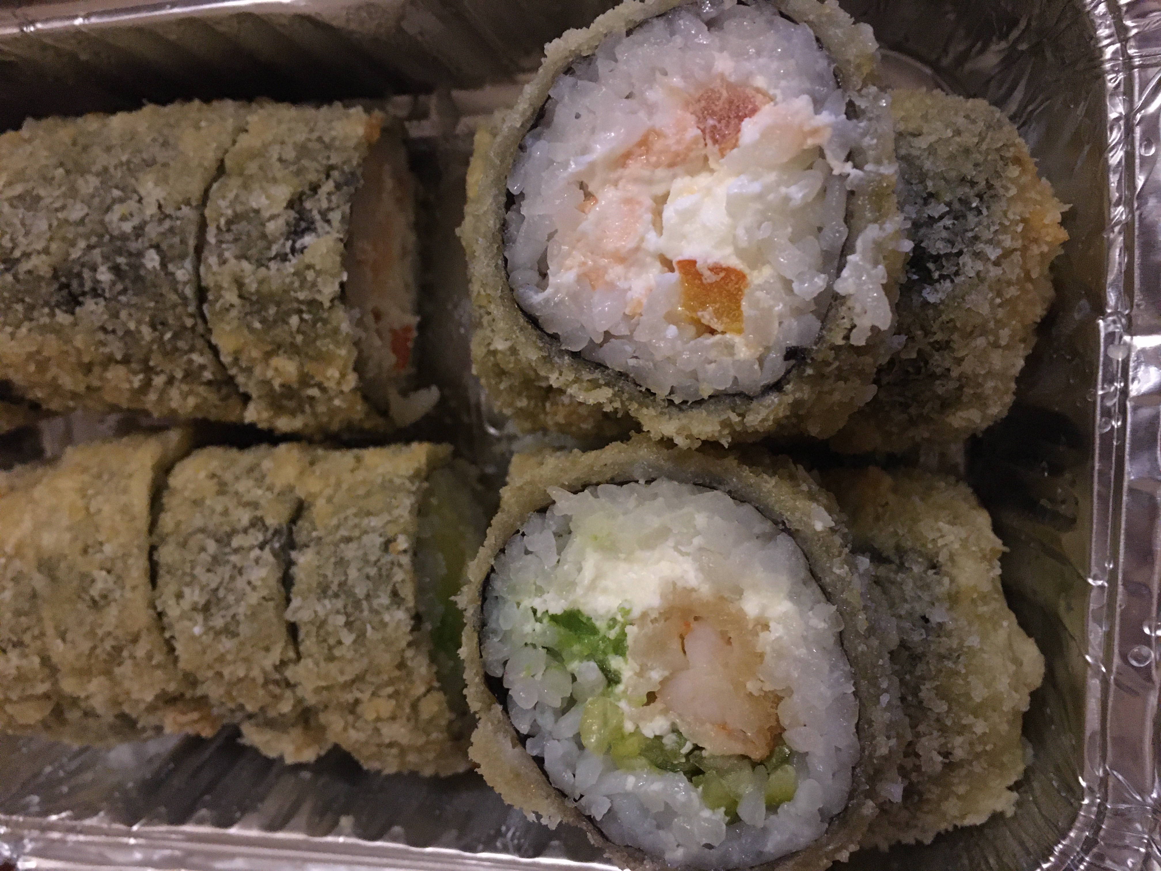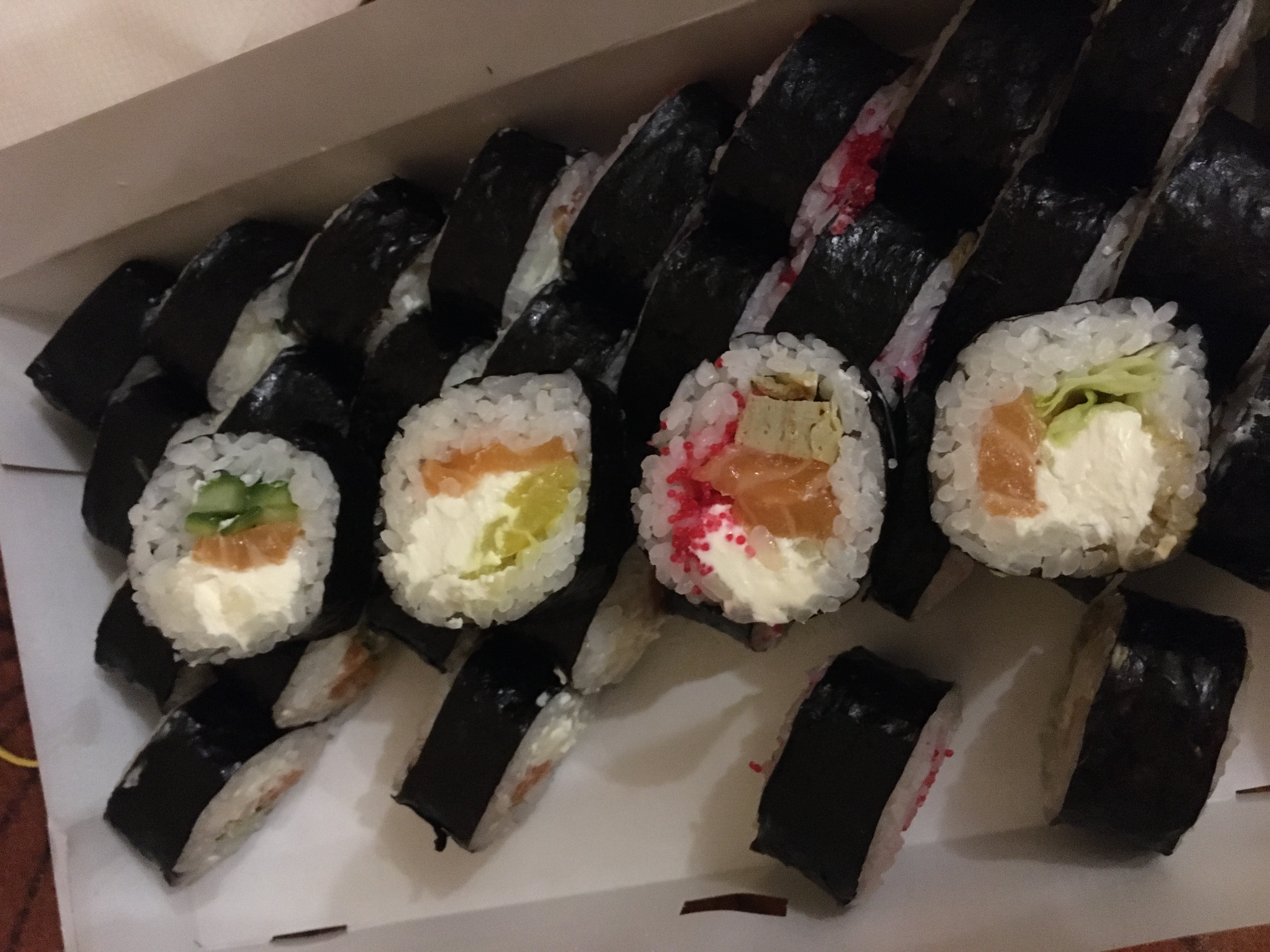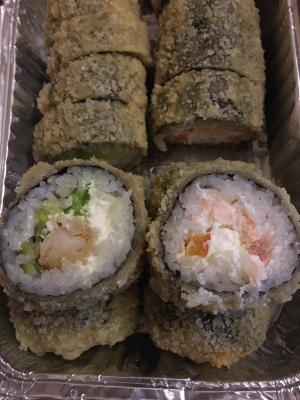 Не понравился вкус( Он был не то чтобы плохим, скорее - никаким. Начинка вроде есть, и на вид достаточно, а на вкус непонятно: что креветка, что лосось, что окунь - почему-то не разобрать - в основном пресный рис, нори и сыр. В обжаренных вообще чувствовался только кляр, рис.