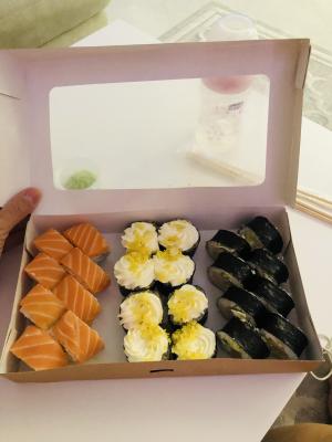 Вкусные суши, все свежее и порадовала доставка, оператор сказала, что доставку ждите через 2 часа, т.к. заказывали в пятницу вечером. Но приехали через час. Будем заказывать еще