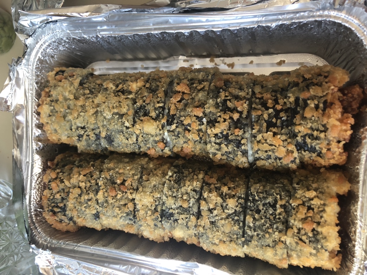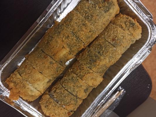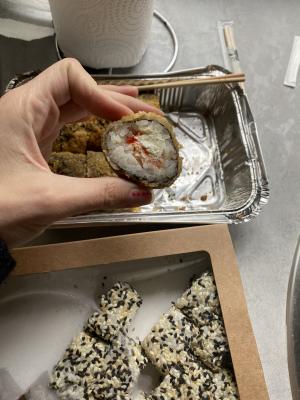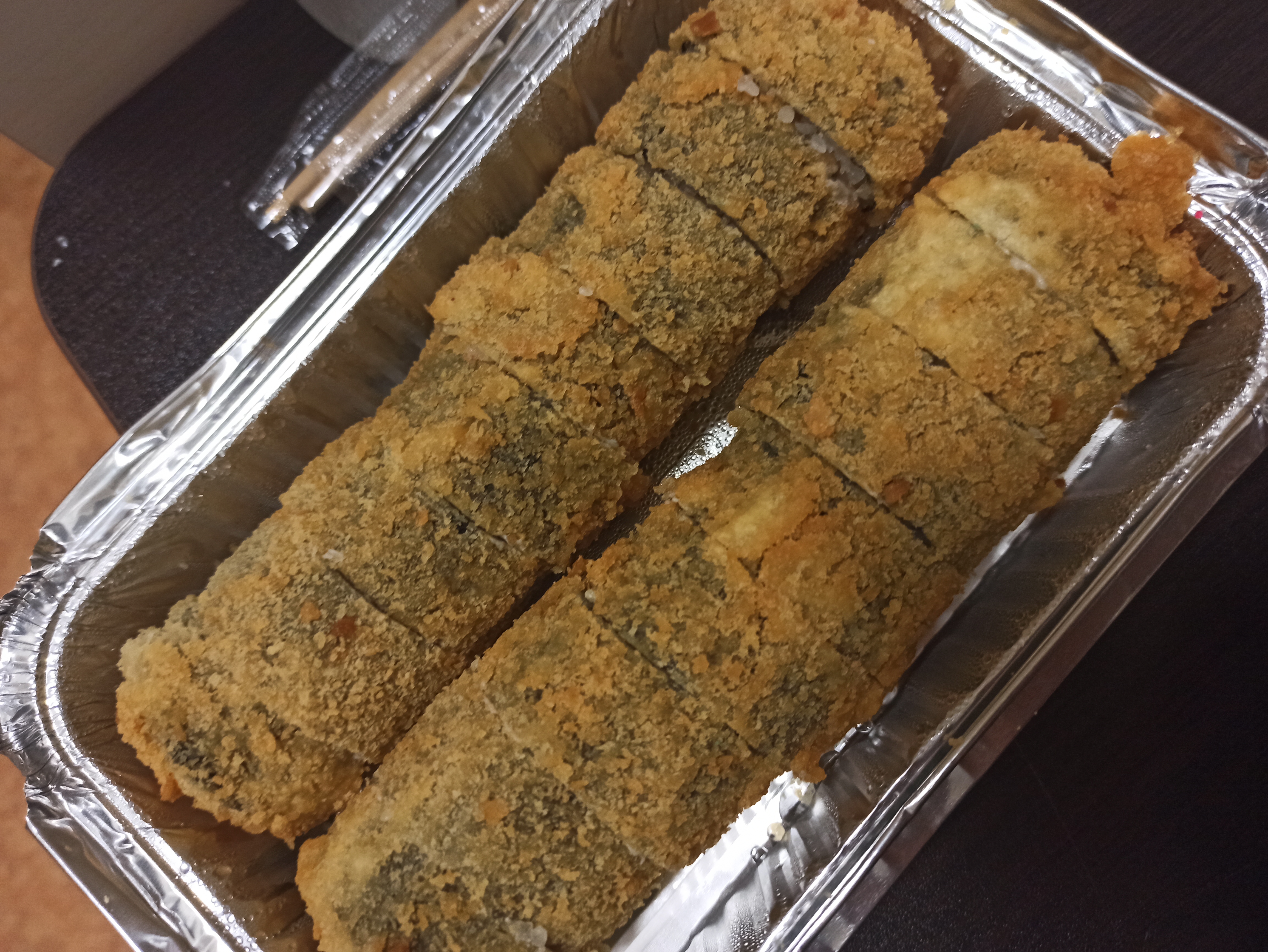 - В теплых ролла крайние кусочки отдаются запечатанными, так как большинству нравится дополнительная панировка на роллах!
