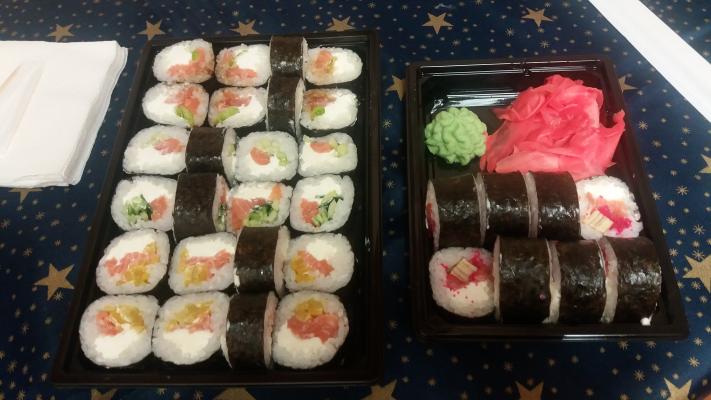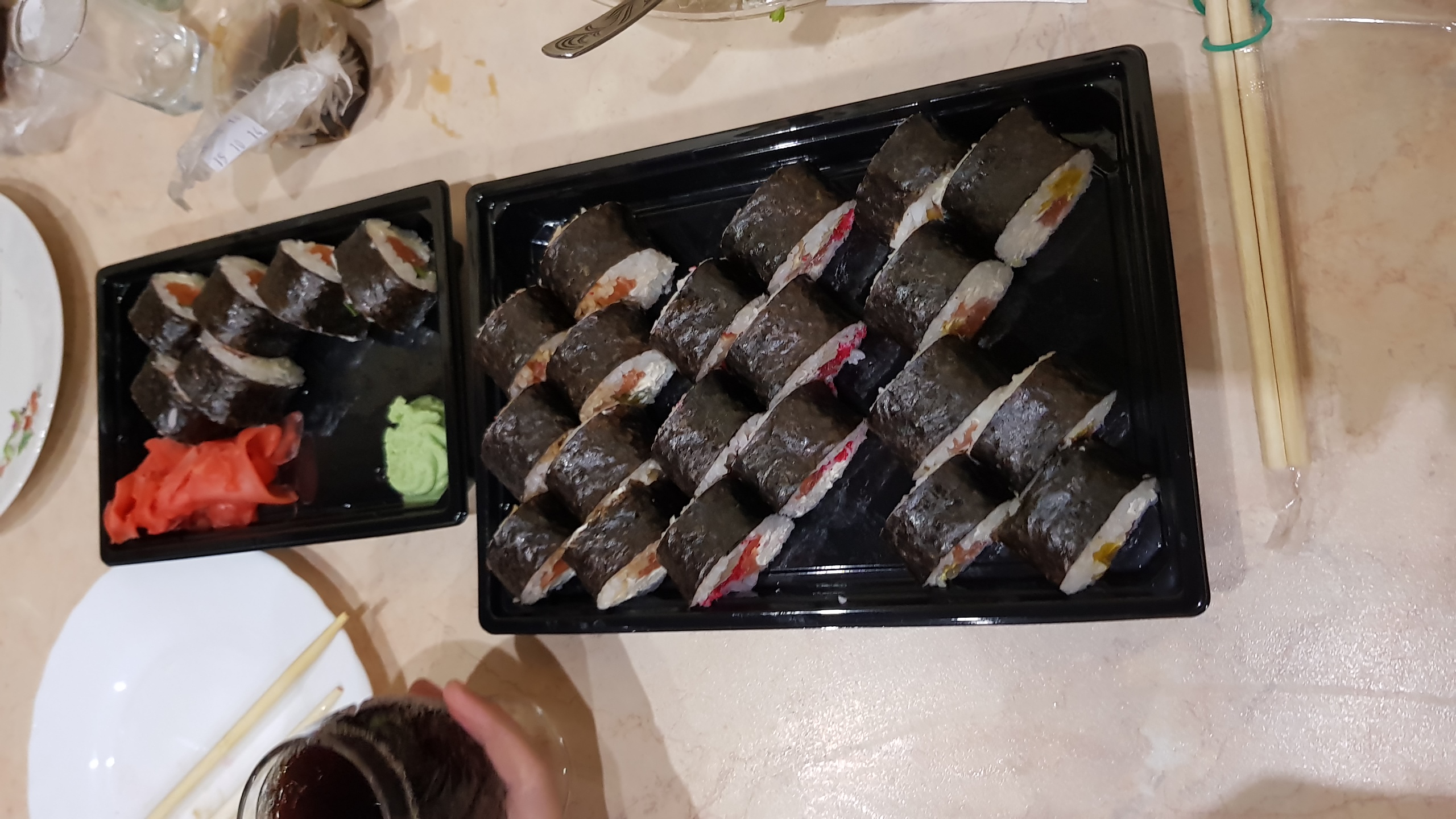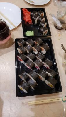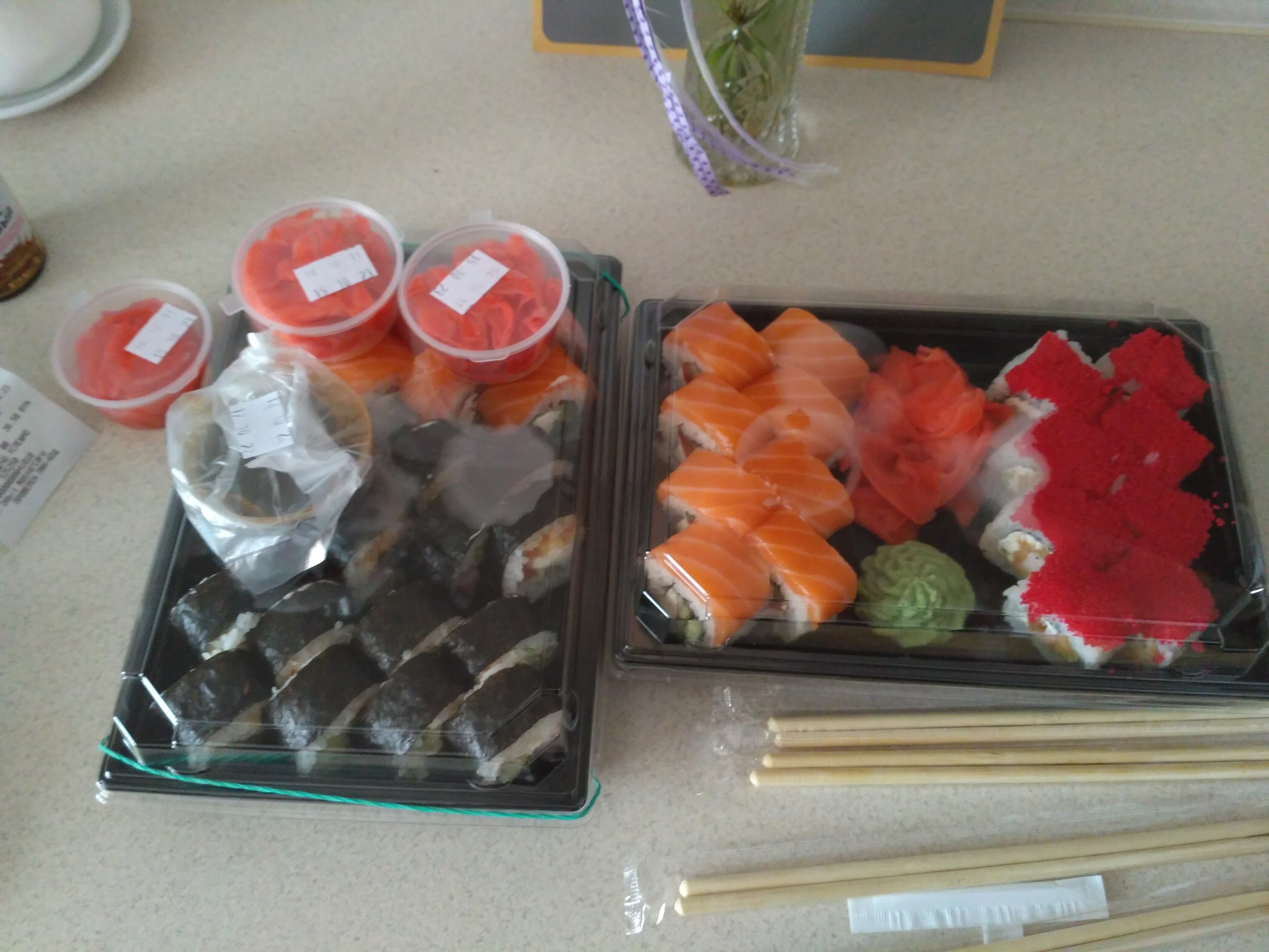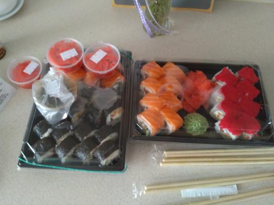 Заказывали суши в пятницу вечером. Порадовала быстрая готовность 25мин (забирали сами) Суши были вкусные. Есть пару замечаний! Брали сет №3, некоторые разваливались, и упакуйте вы их лучше в 2 больших контейнера, а то слипшиеся между собой сидеть и аккуратно расклеивать не очень радостное занятие :)))