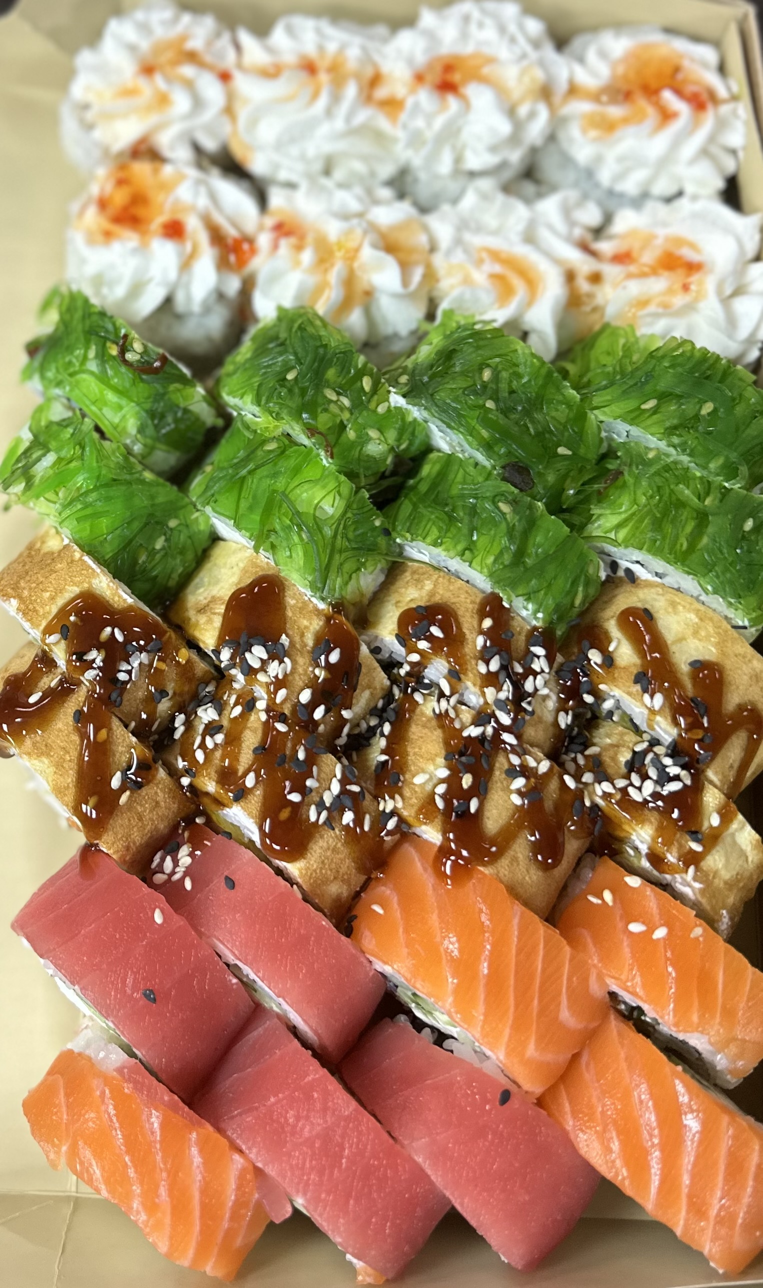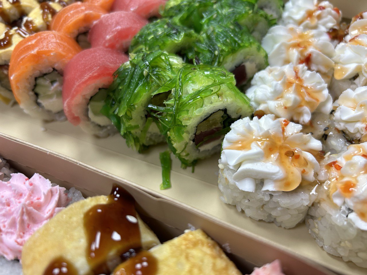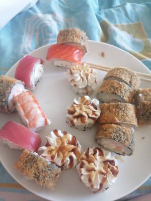 - В теплых ролла крайние кусочки отдаются запечатанными, так как большинству нравится дополнительная панировка на роллах!