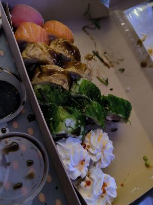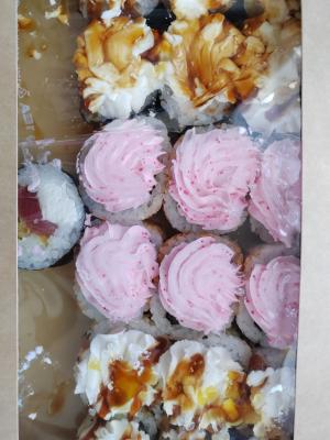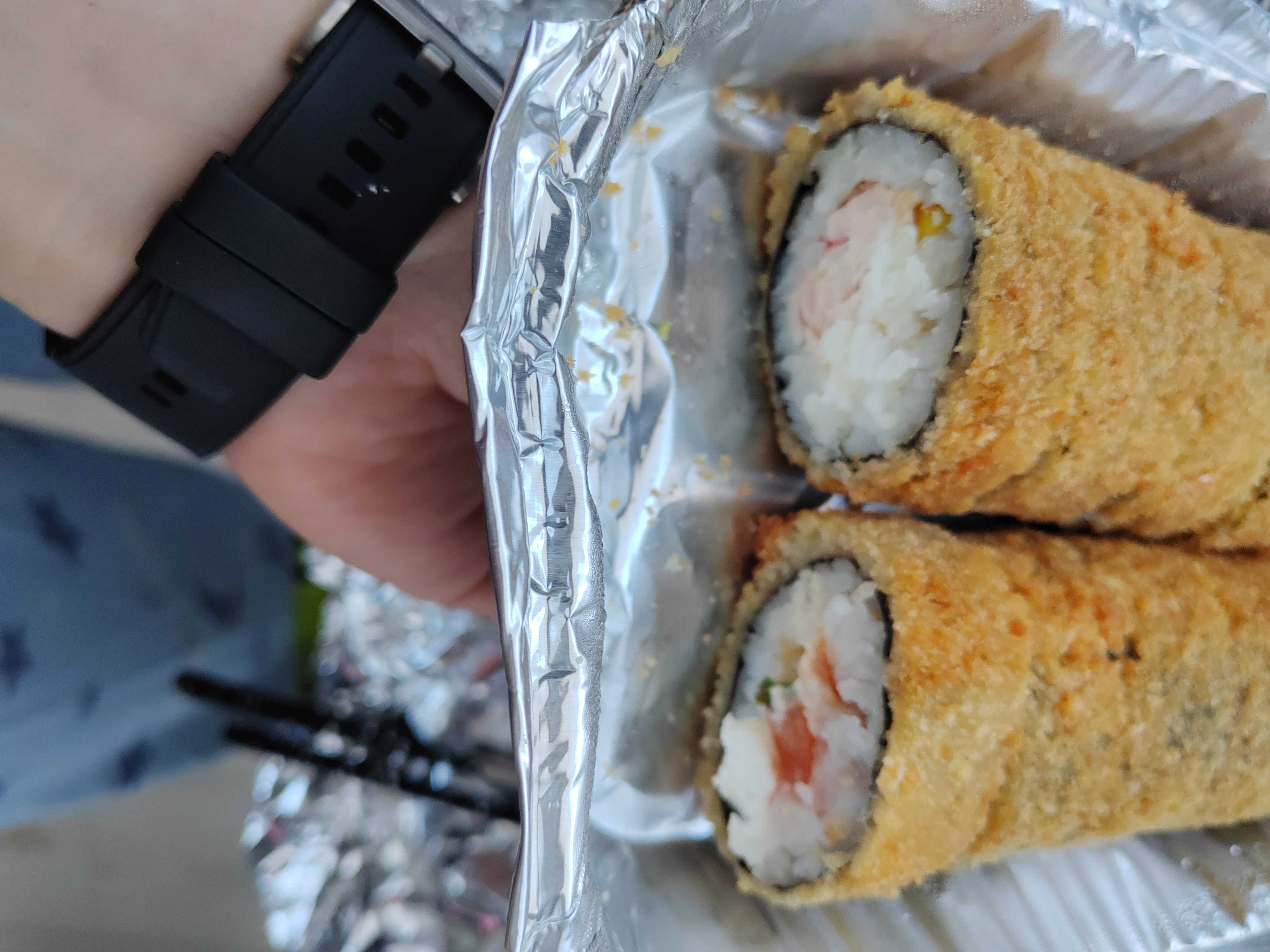 Брали 2 сета: одни - обычные роллы, вторые - жареные. Оставлю своё субъективное мнение о жареных роллах: нет вкуса, от слова совсем, начинки очень мало, риса много, панировка толстая; всё время брали в другом месте, просто решили попробовать здесь, рейтинг заведения высокий, но они никакие. Обычные роллы вкусные, но без восторга.