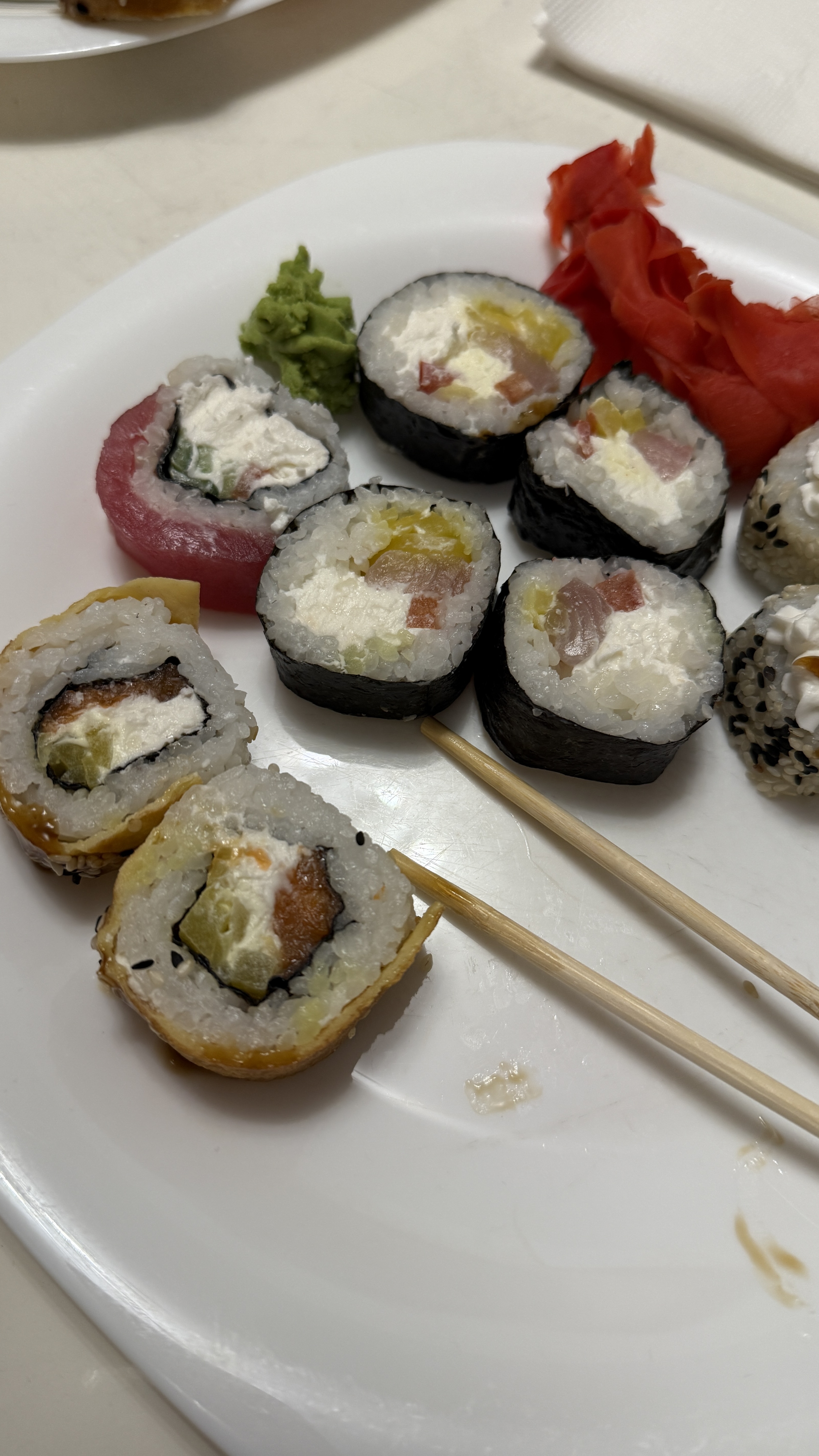 Вкусные суши, достаточно начинки. Только вот тоже хотелось бы, чтобы не так заметно отличались по ширине, берём сет не на одного человека, хотелось бы, чтоб дети не подрались, выбирая 😄