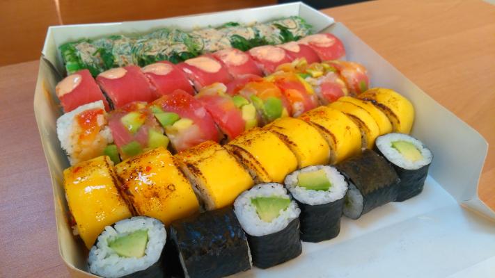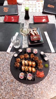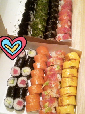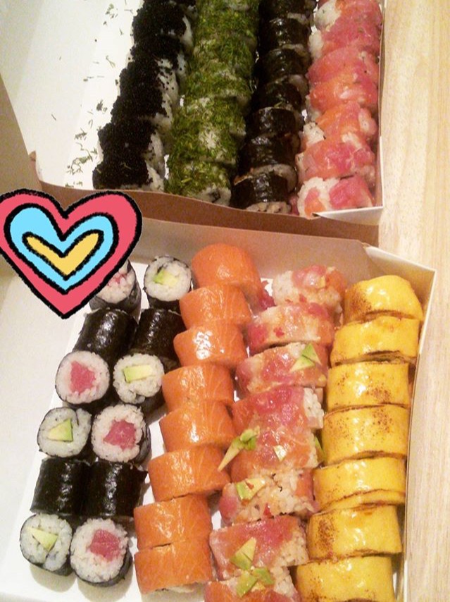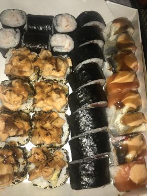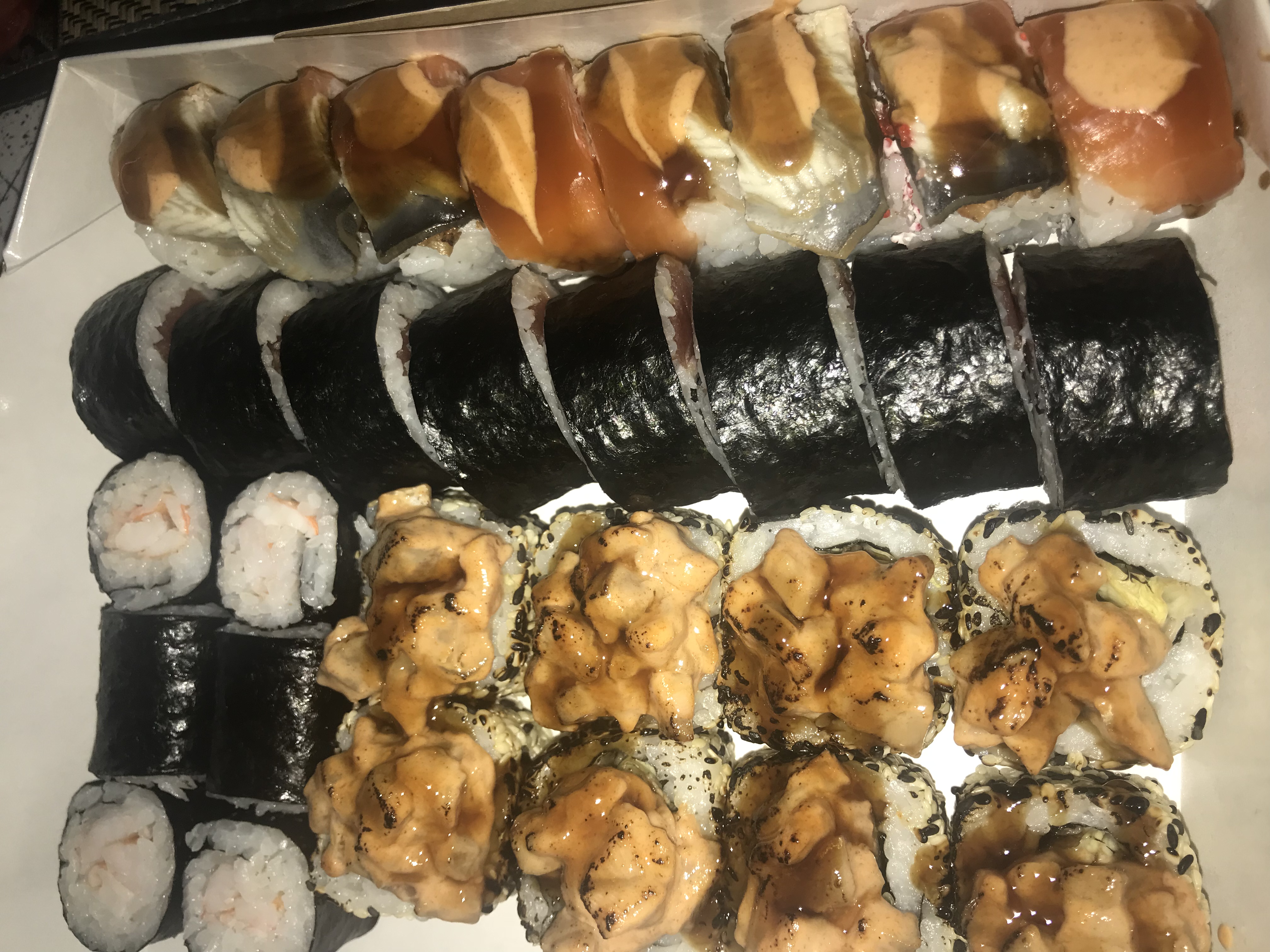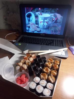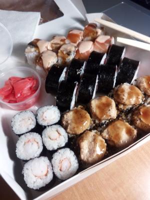 Заказывали в декабре 2 сета с доставкой, не смотря на то , что опоздали на час суши были великолепны-в счете была порция горячих...и они были еще тепленькие. На 6-х еле осилили 2сета(Макси, №3).