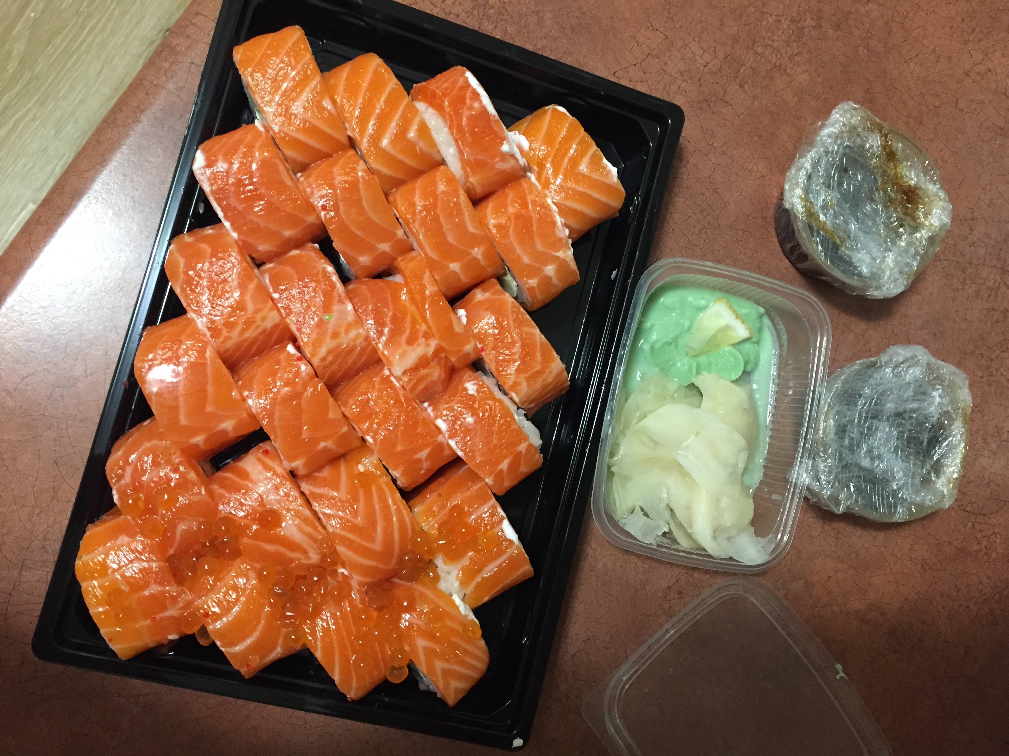 Забирала самовывозом, маленькое помещение, где стоит не очень приятный запах. Сами суши большие, ничего не пожалели. Понравилась "Филадельфия". А сладкие такое ощущение, что немного вобрали запах обычных суши. Не уверена, что буду снова заказывать.