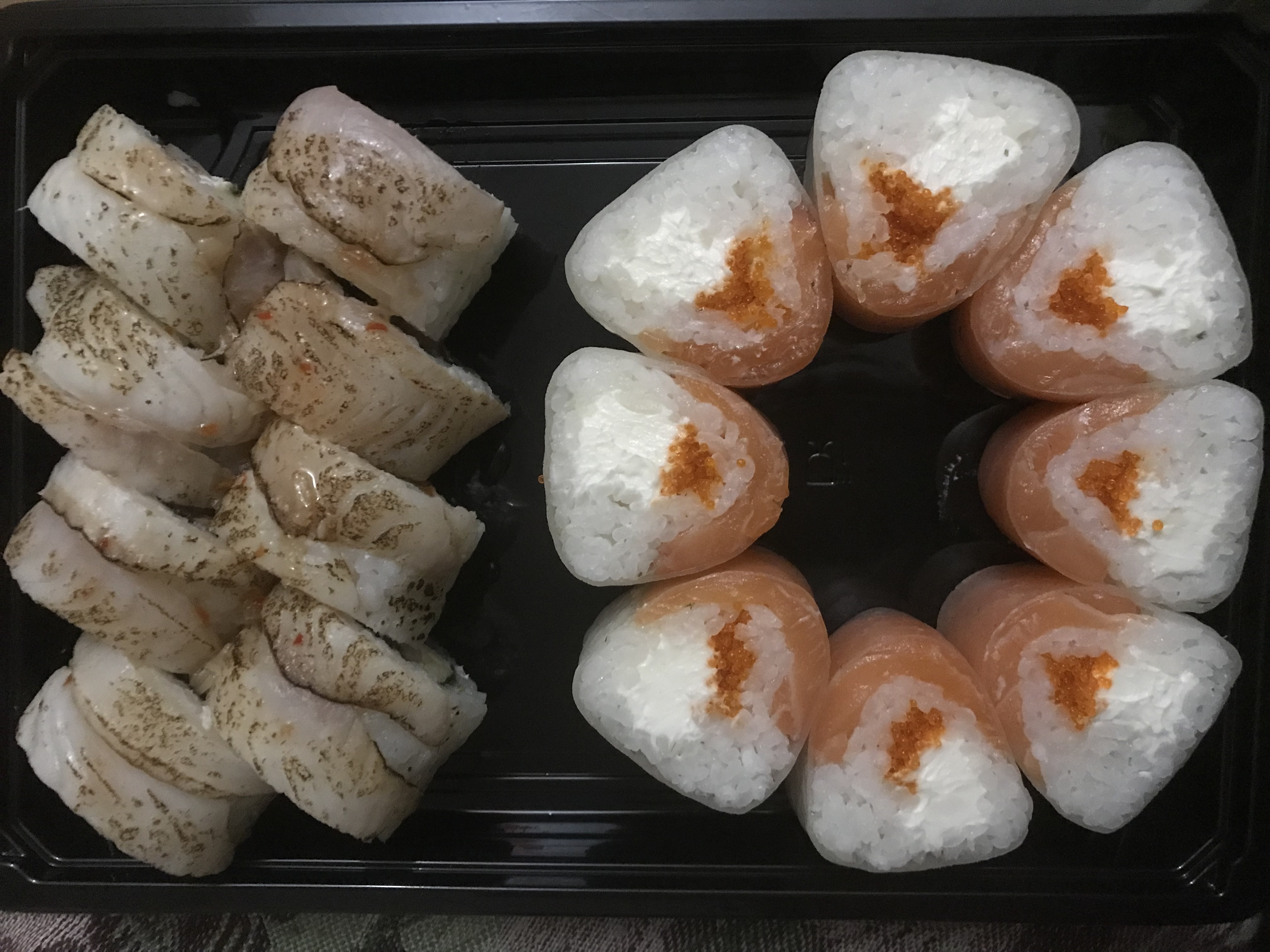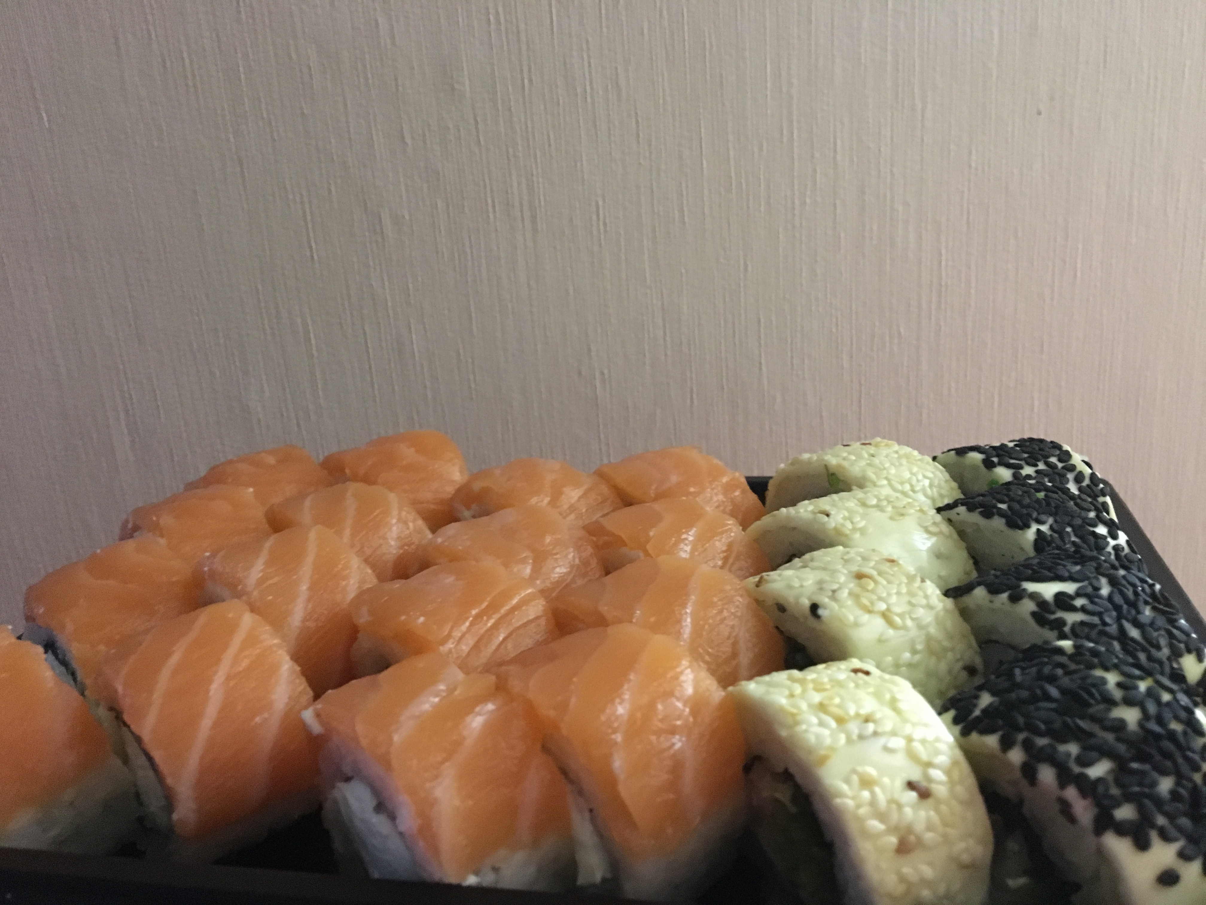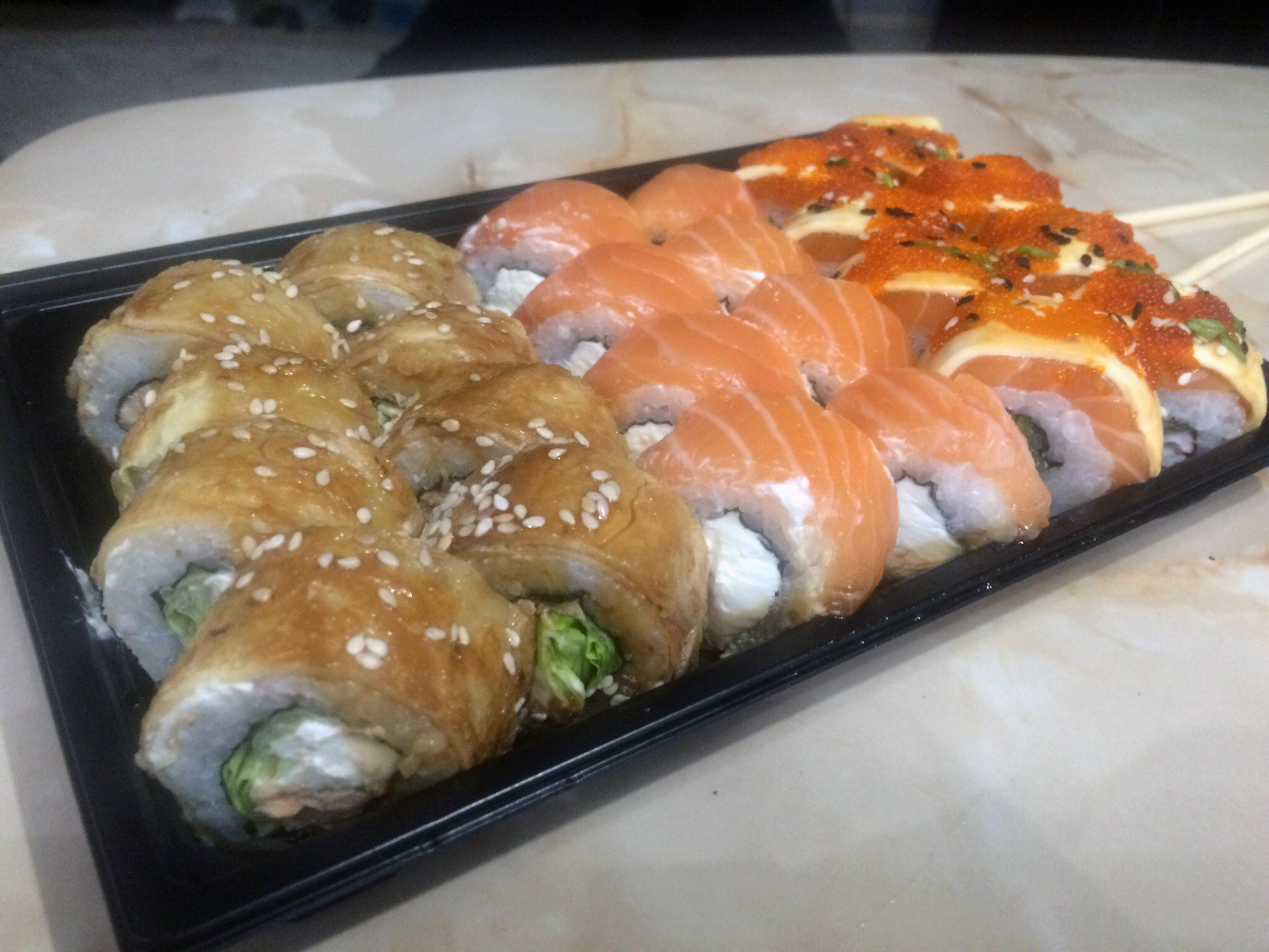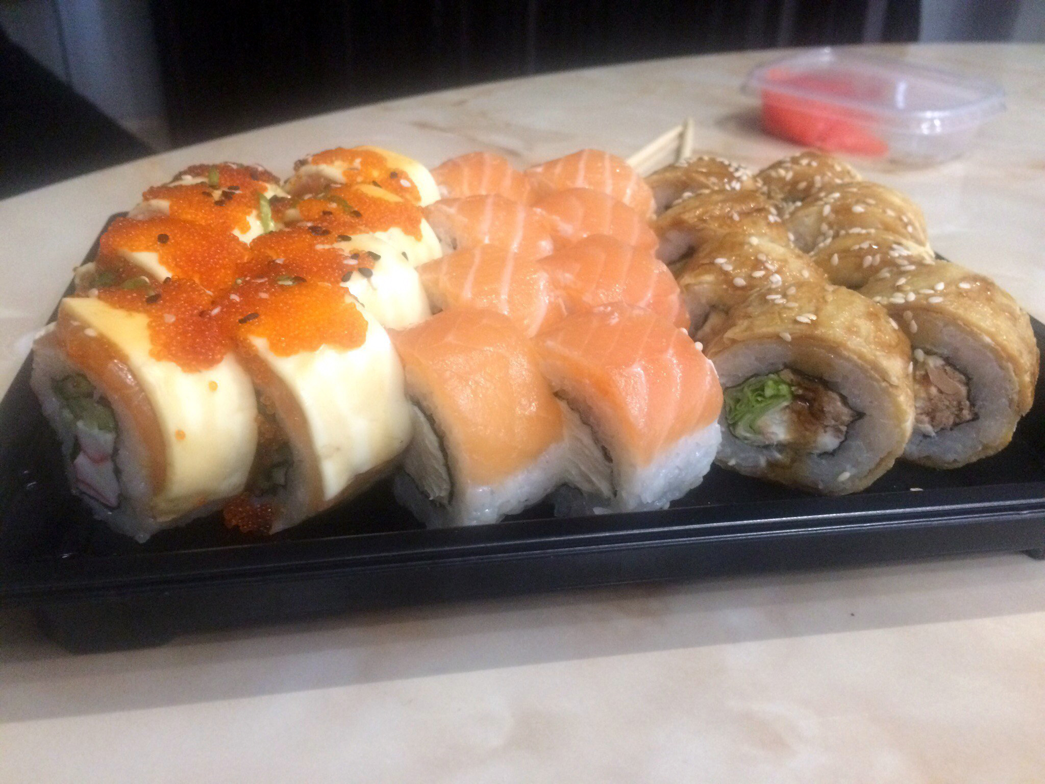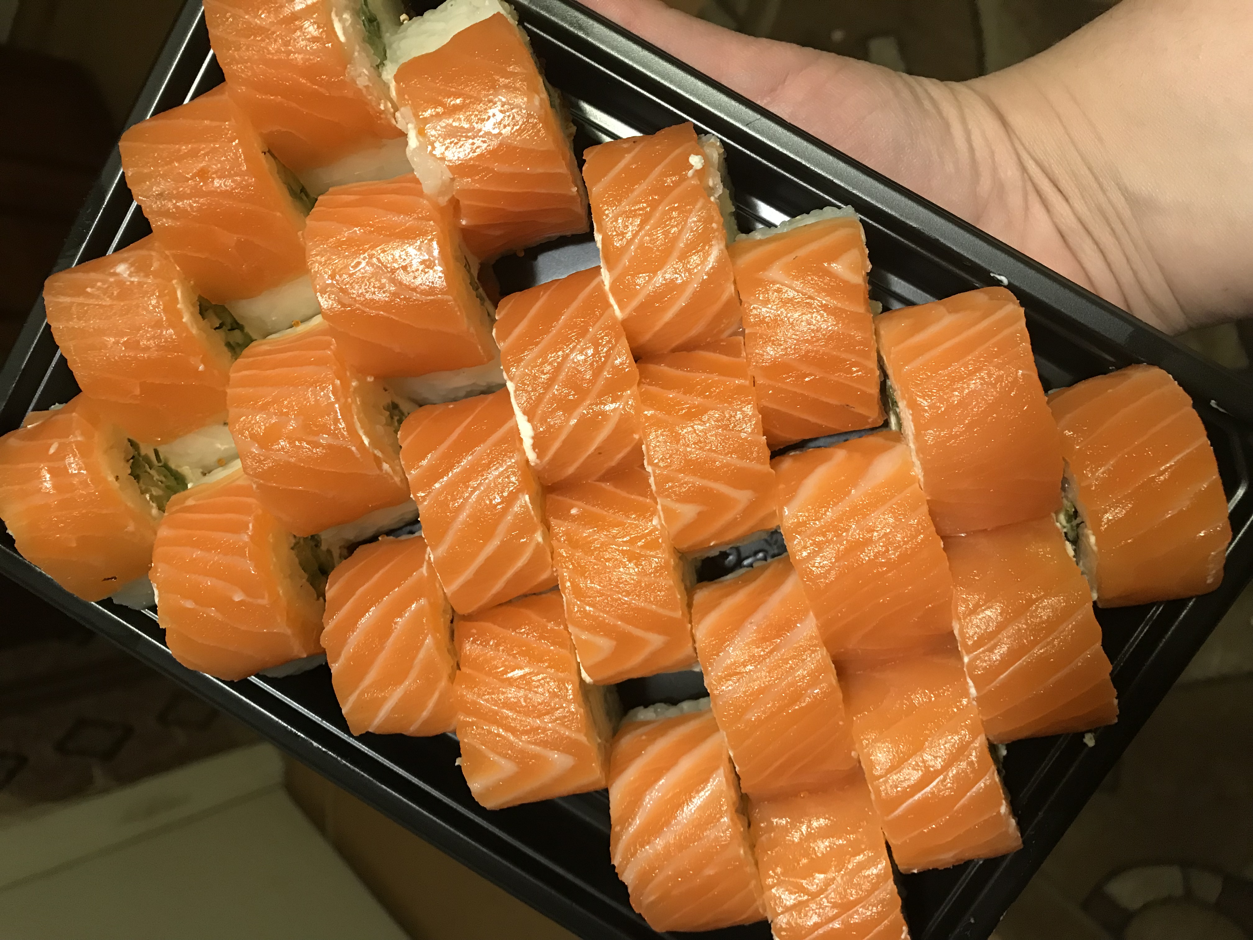 Очень вкусно! Заказывали 3 порции "Филадельфия класс." дали в подарок сладкие роллы, пробовали впервые очень понравились.