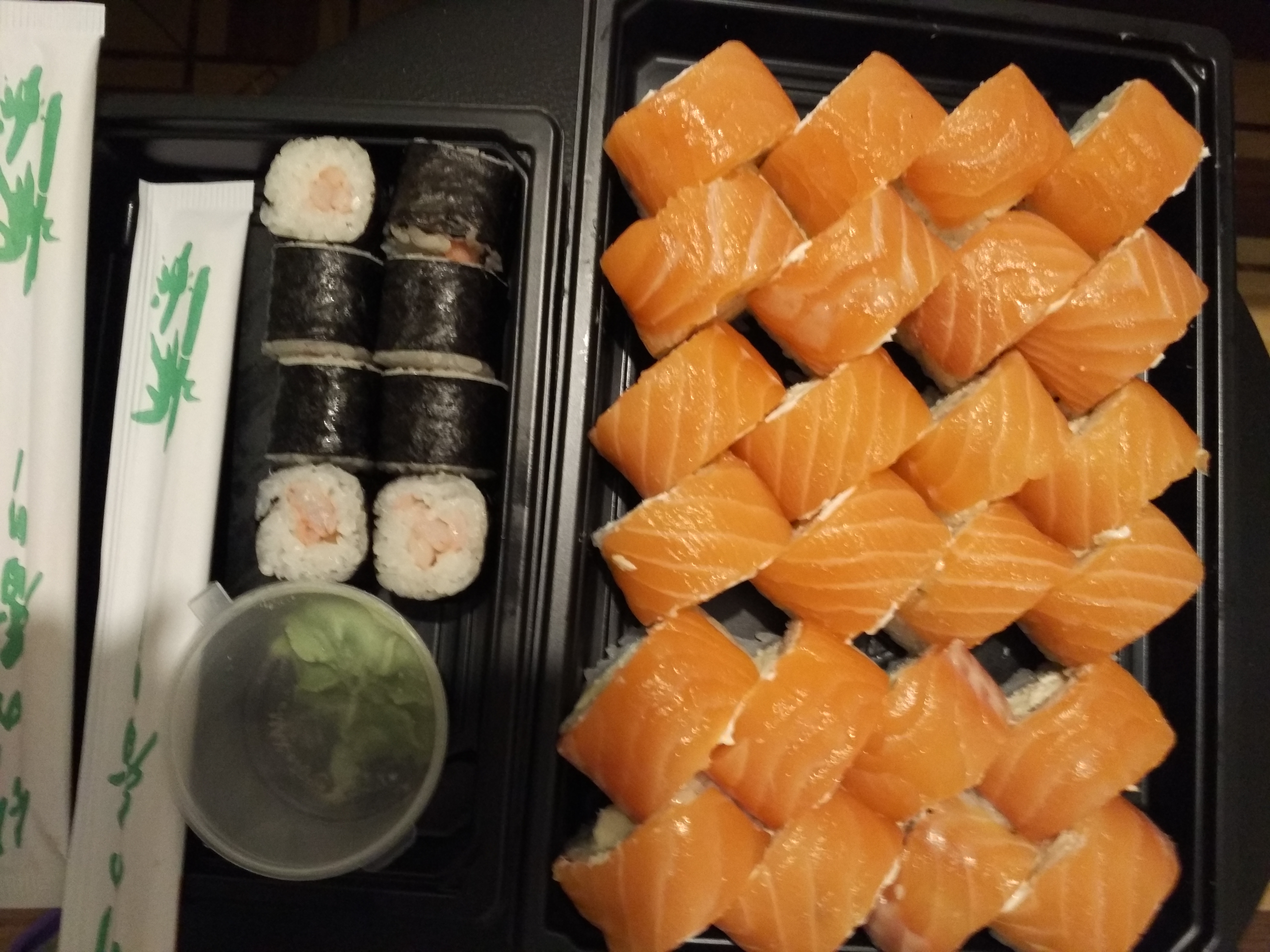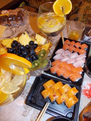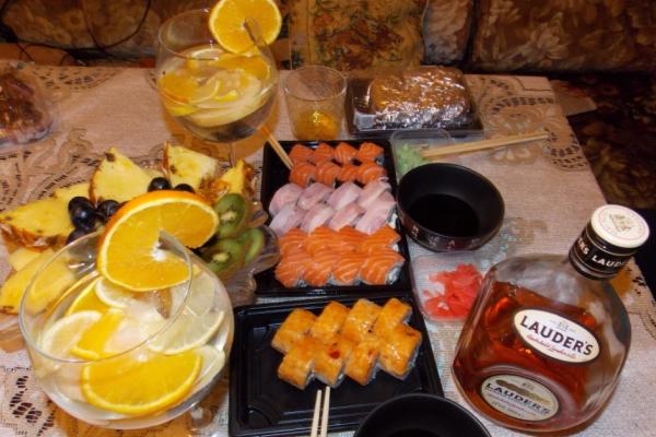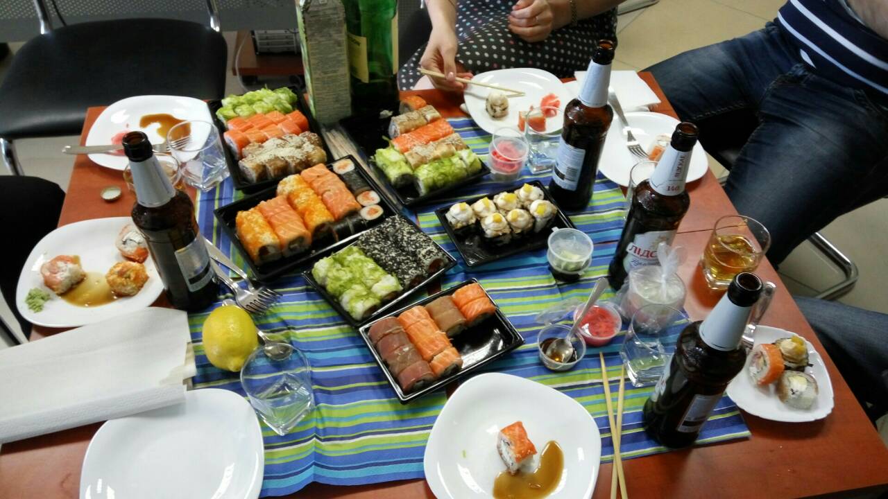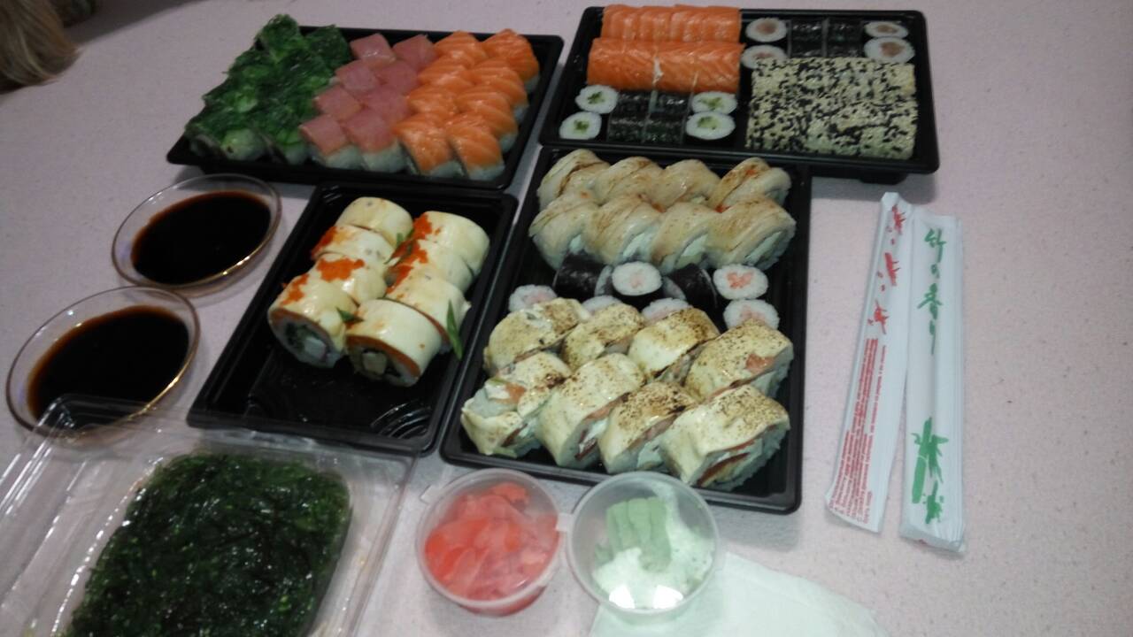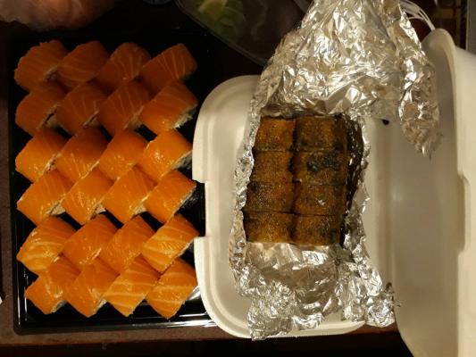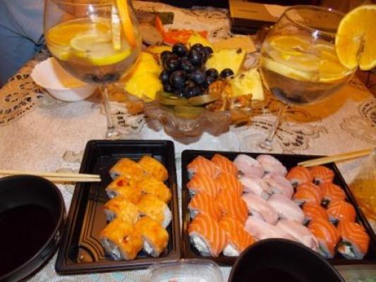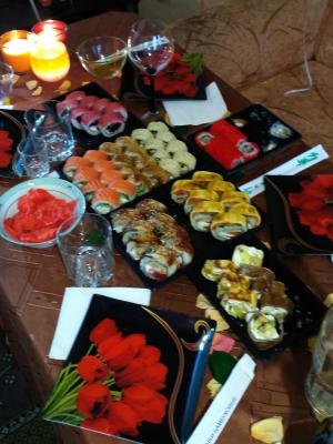 Заказывали суши. Очень вкусные и большие. Правда в акции написано, что при заказе от 20р в подарок 1л коктейля, а нам дали ролл с креветкой. Но все равно, спасибо)