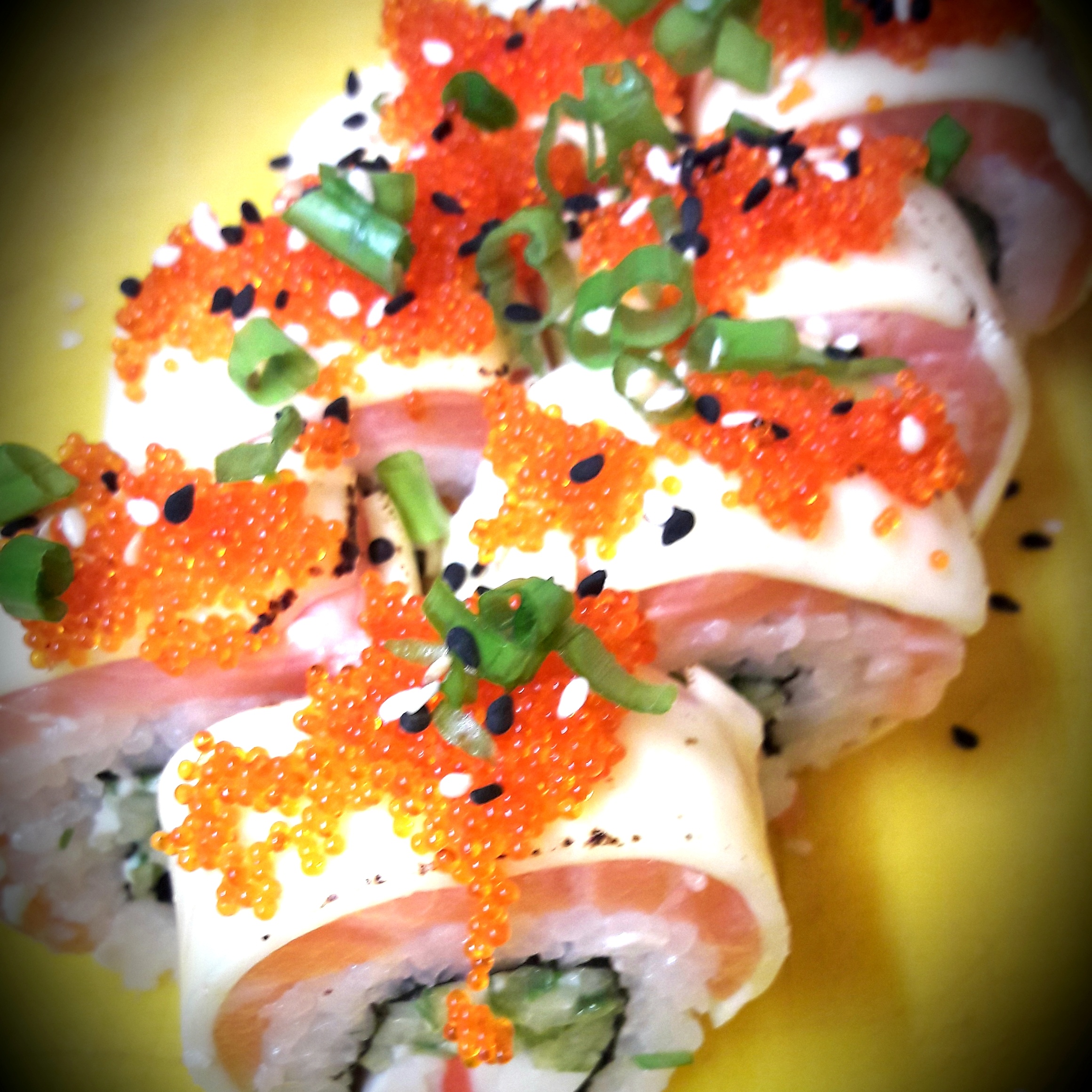 (лосось, тобико, огурец, сыр сливочный, рисовая бумага, рис)