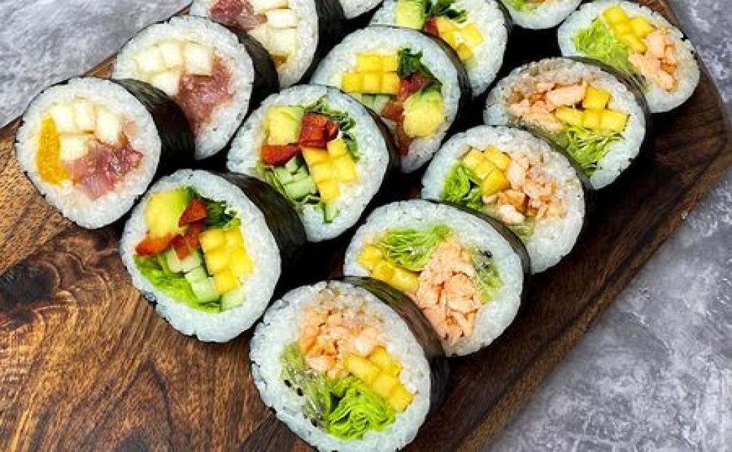 - ролл вегетарианский - апельсин, салат, перец, помидор, чука салат, зеленый лук, рис, маменори, сыр творожный
