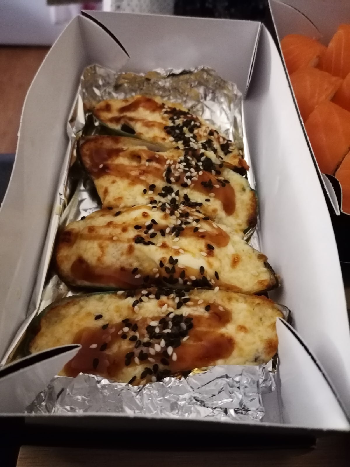 Состав: мидии "KIWI", сырный микс, соус терияки, кунжут