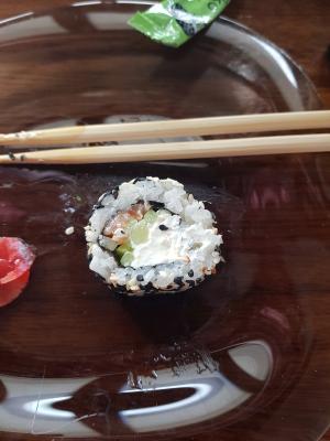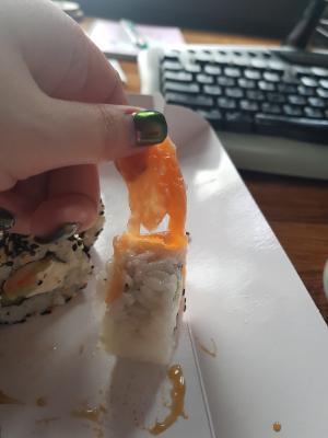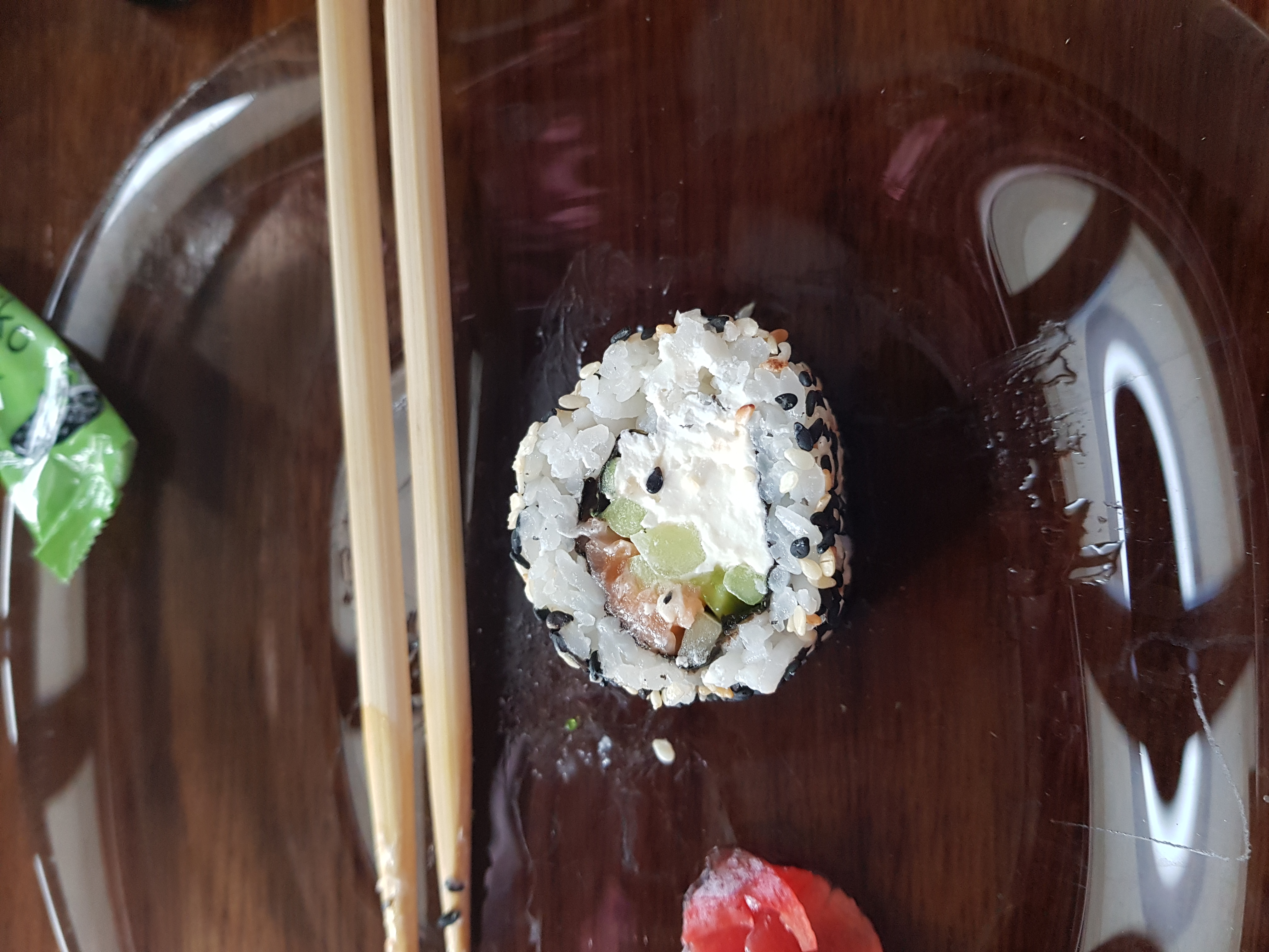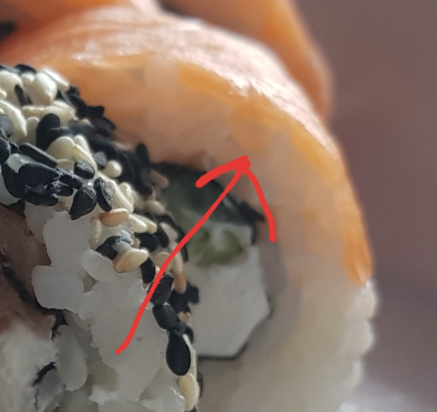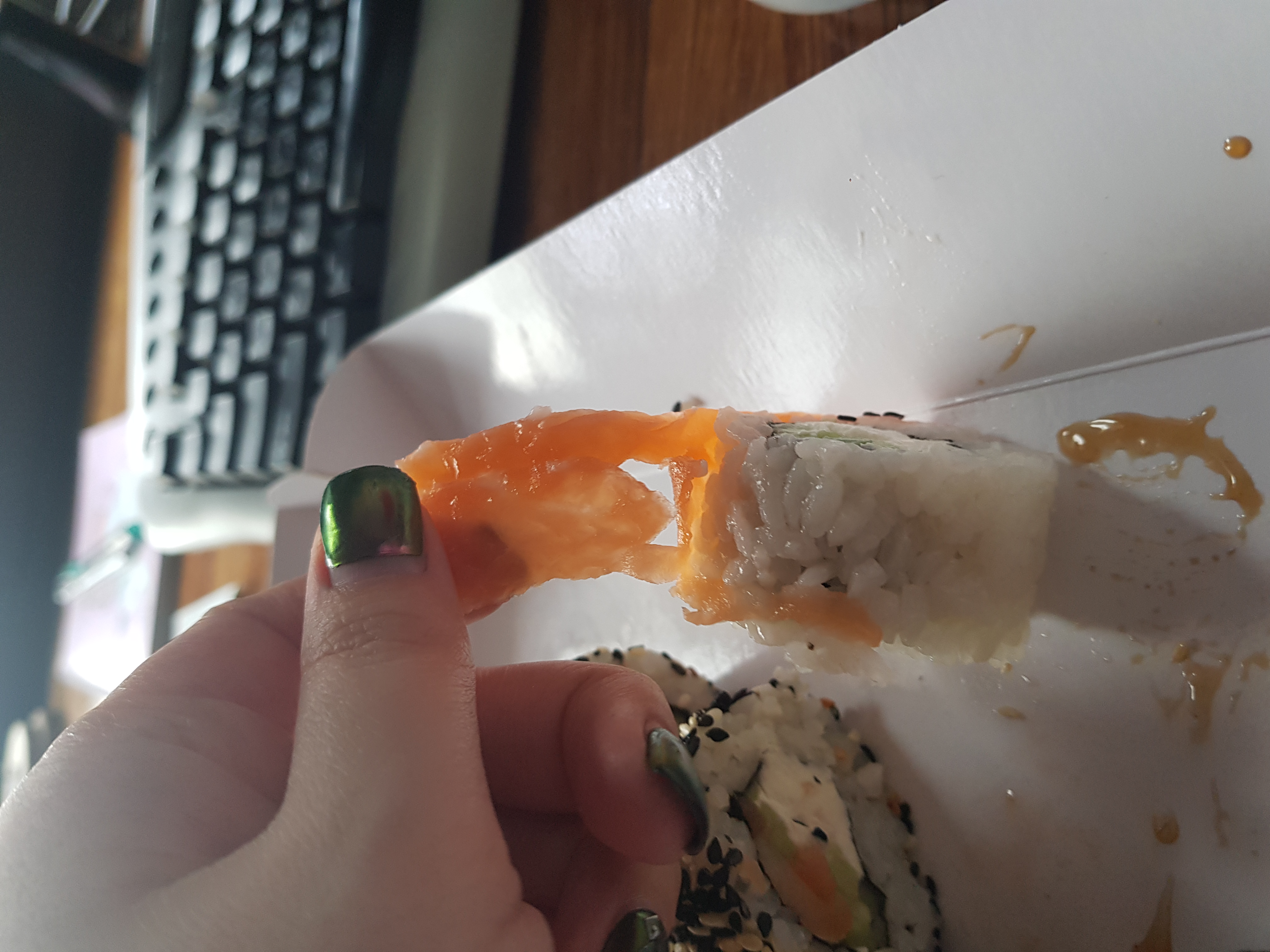 Вы только посмотрите на этот кусочек рыбы на Филадельфии за 15 р, мой ноготь просвесивается через него))