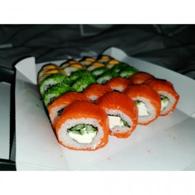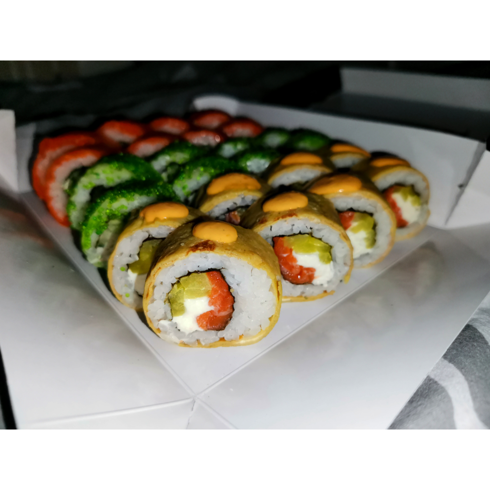 Рис, нори, сыр, огурец, терияки лосось, бонито