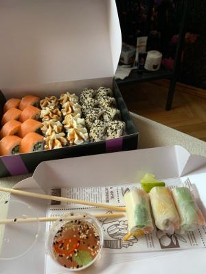 Привезли ровно за час. Упаковано все хорошо, аккуратно сложено. Видно, что ребята только начинают свой путь и работают на хороший результат. Старайтесь так и дальше. Роллы вкусные, скручены отлично, много сыра и рыбки. Брала сет номер 2 и спринг роллы.