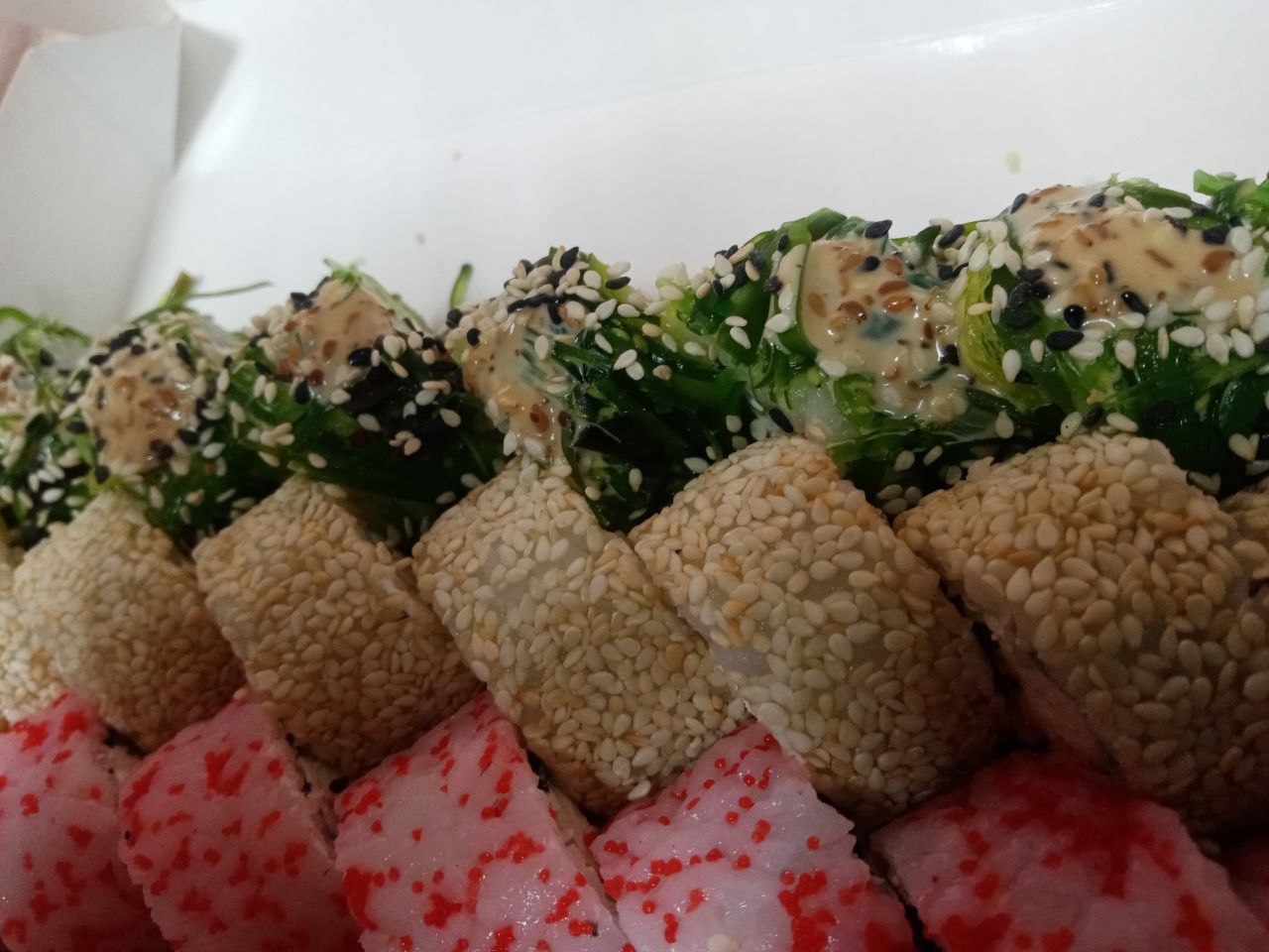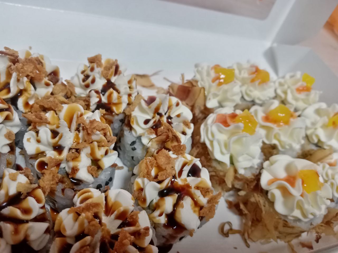 - ролл "Deyua Do" (8 шт): микс тунец-лосось, рис, нори, сливочный сыр, авокадо, огурец, соус спайси, лук во фритюре