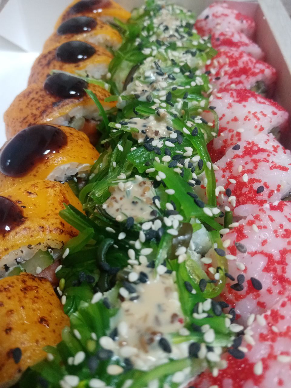 - ролл "Токио Маки" (8 шт): чука, рис, нори, сыр, лосось, огурец