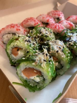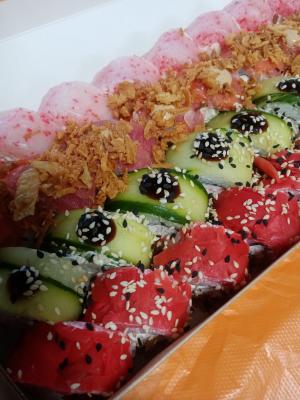 - ролл "Sunshine" (8 шт): чедр, рис, нори, лосось, сливочный сыр, огурец