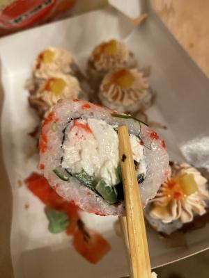- ролл "Юджинкрабс" (8 шт): тобико, рис, нори, сливочный сыр, снежный краб, огурец