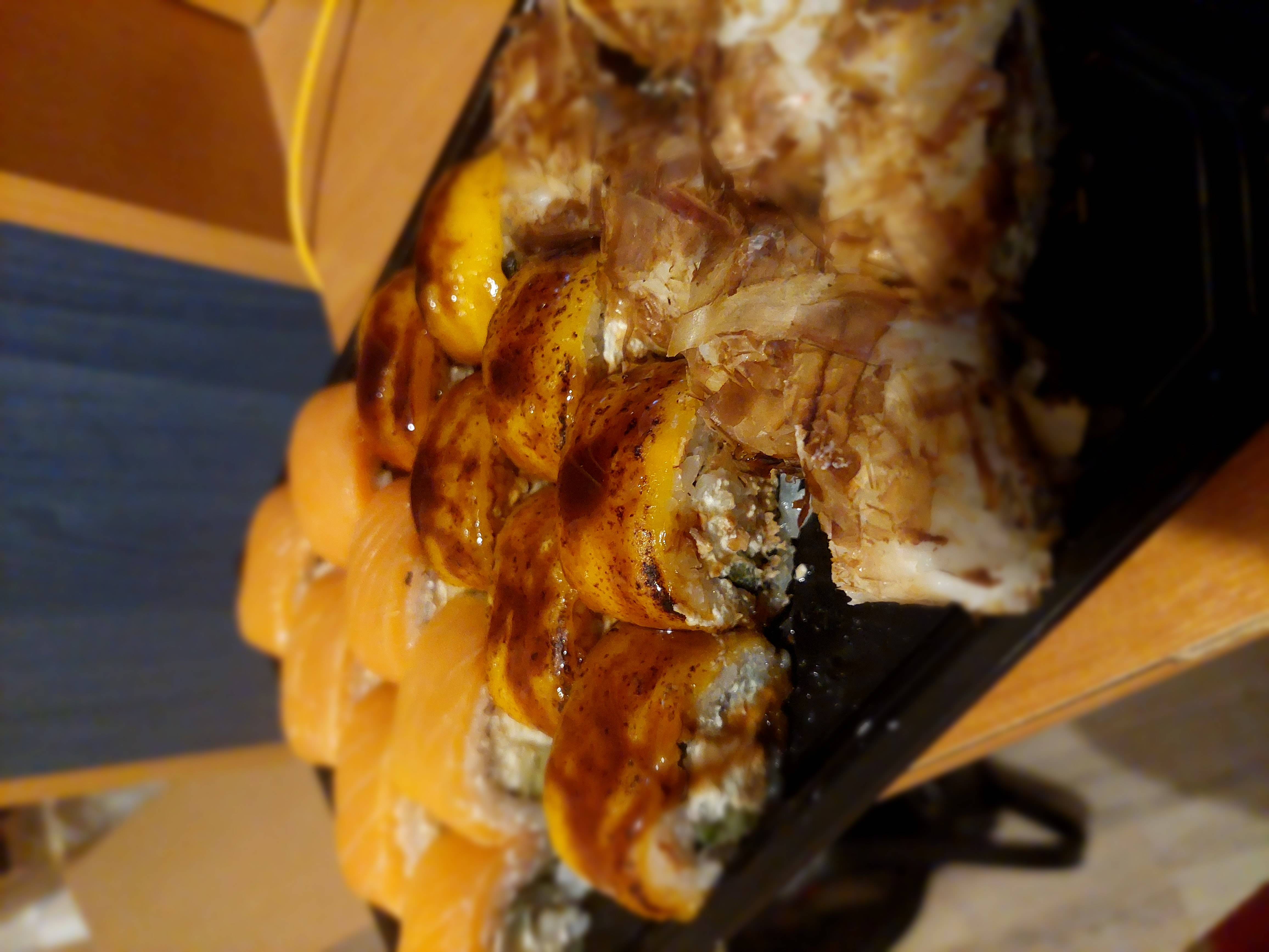 - ролл "Deyua Do" (8 шт): микс тунец-лосось, рис, нори, сливочный сыр, авокадо, огурец, соус спайси, лук во фритюре