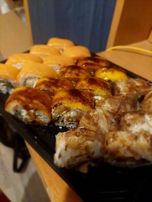 - ролл "Рокфор" (8 шт): чедр, рис, нори, жареный лосось, сливочный сыр, огурец