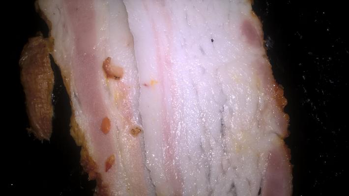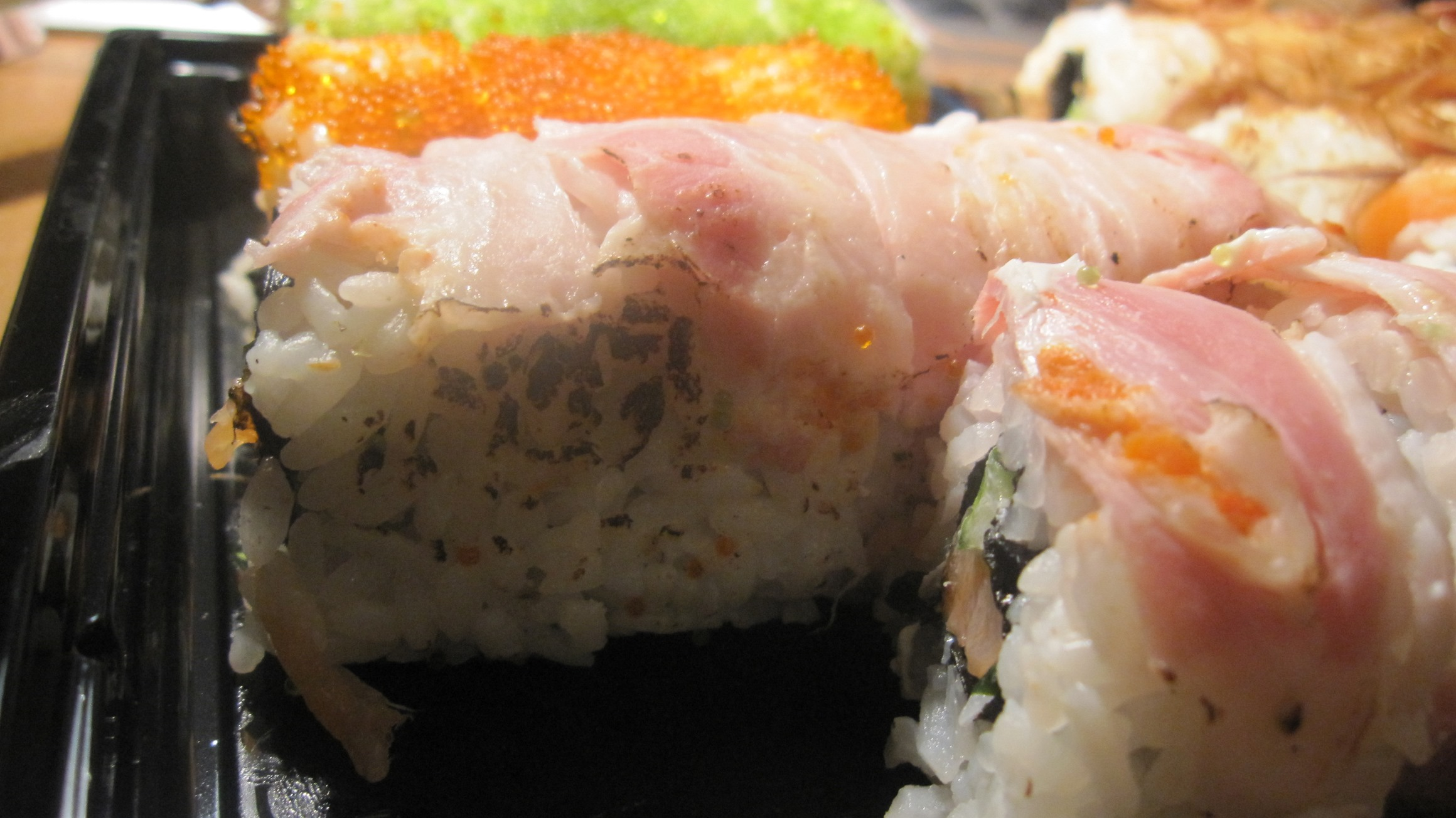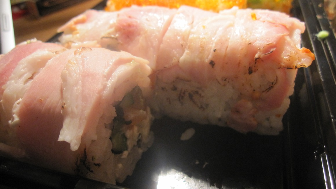 А почему тогда вместо бекона вы обжарили ещё и суши...при том все 8 роллов имели чёрный рис....а это знаете ли не очень приятно на вкус