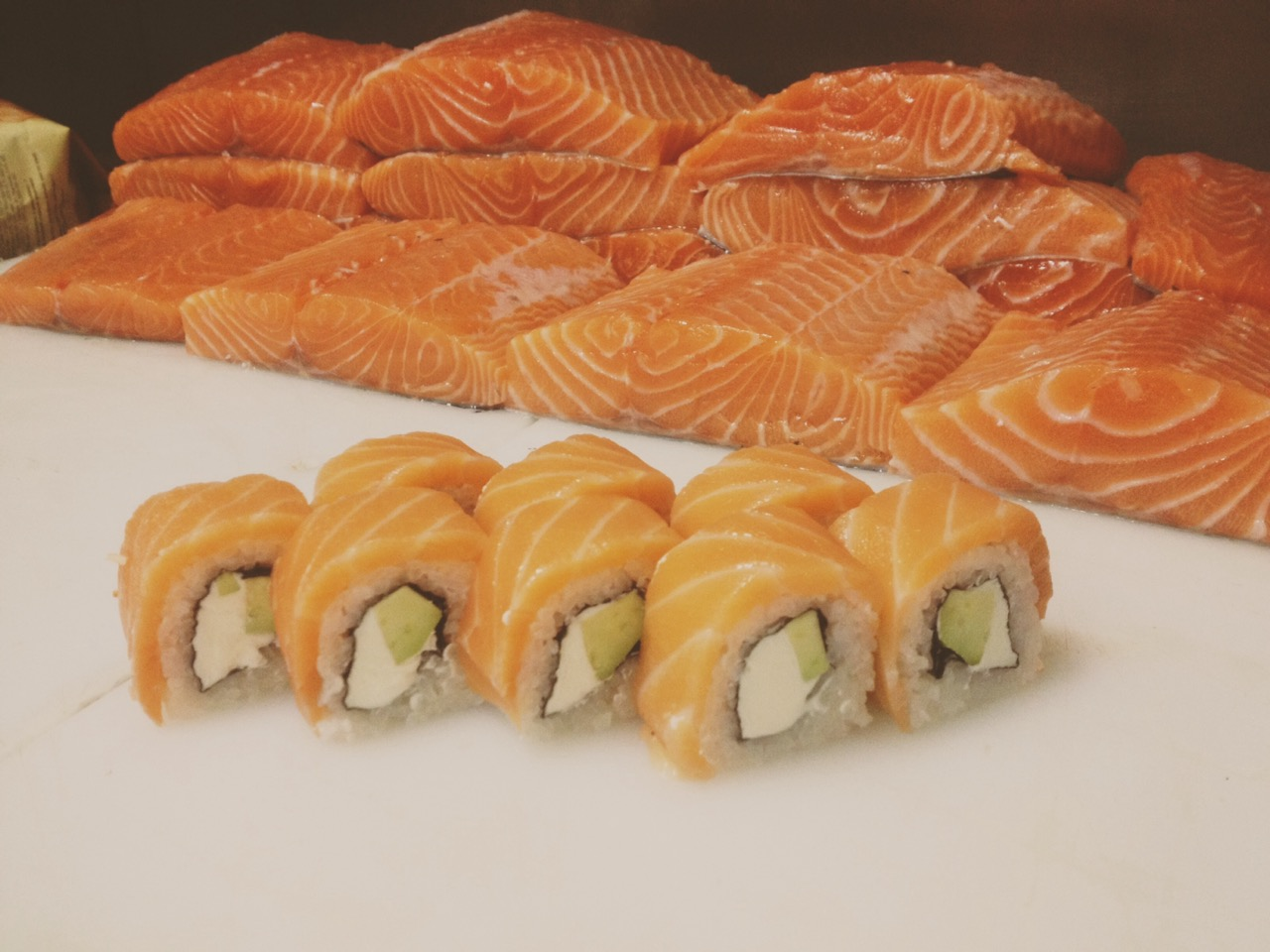 - ролл с лососем свежим сверху, сливочный сыр, авокадо, нори, рис (8 шт)