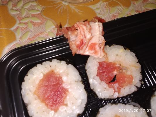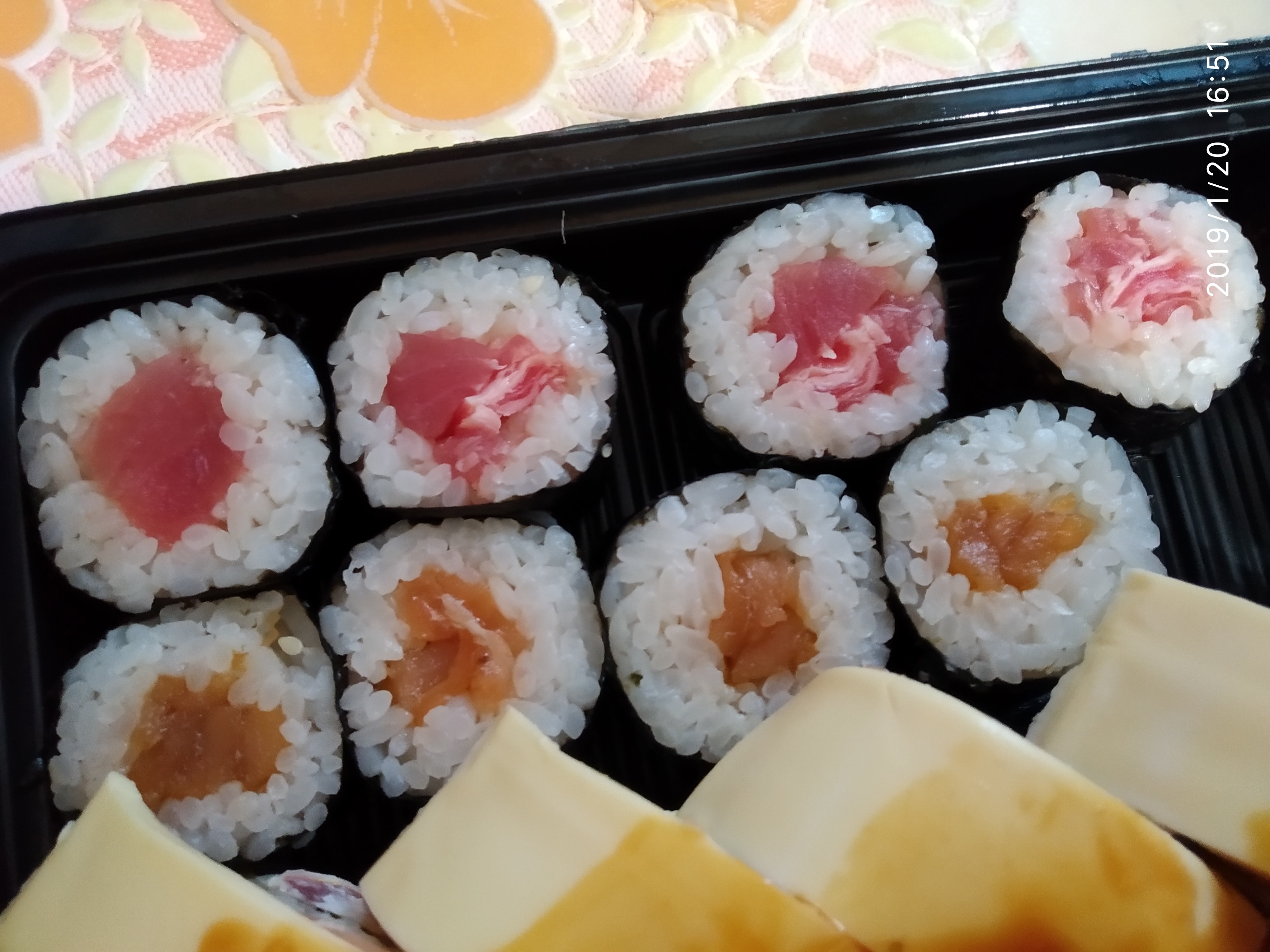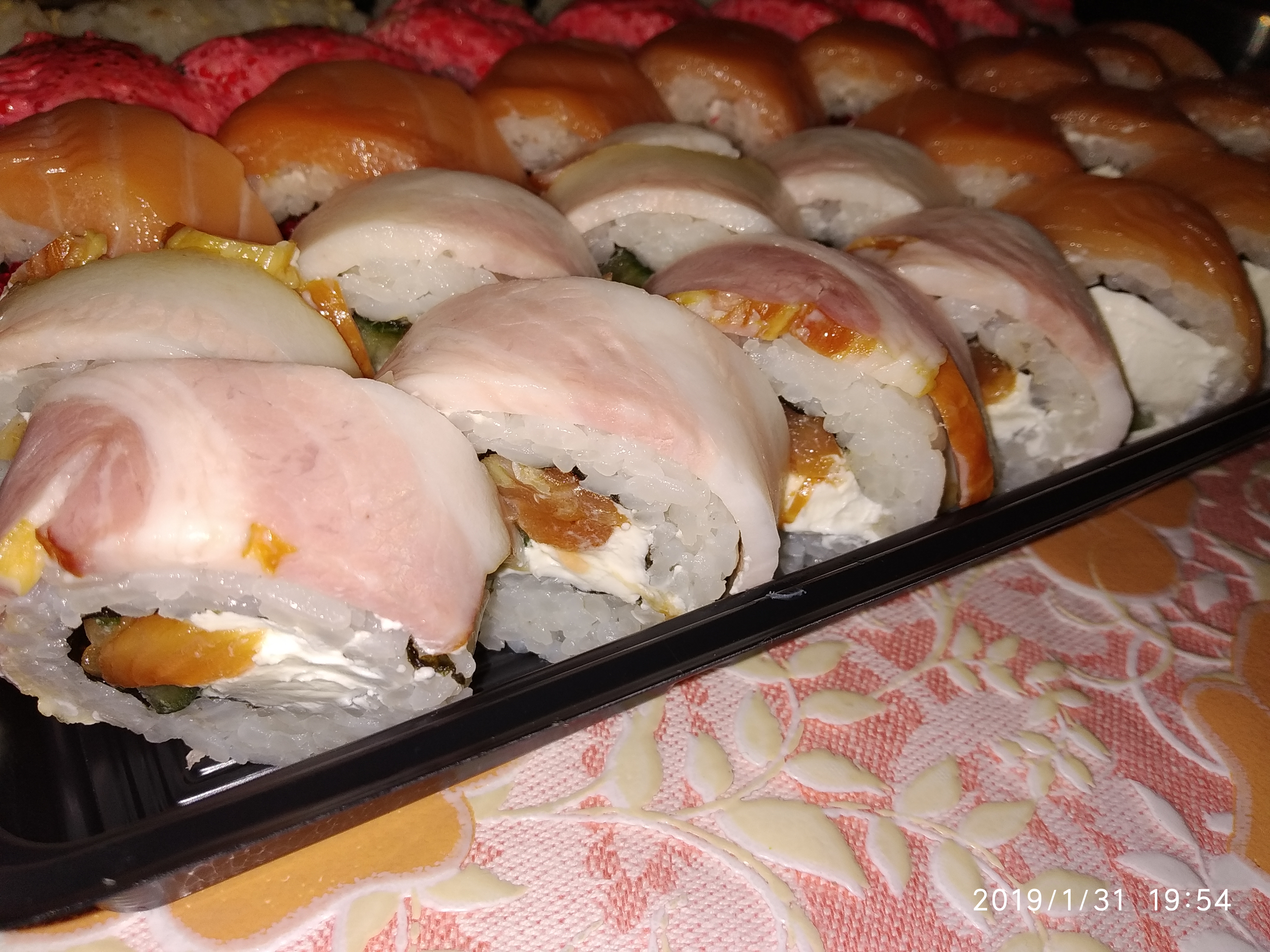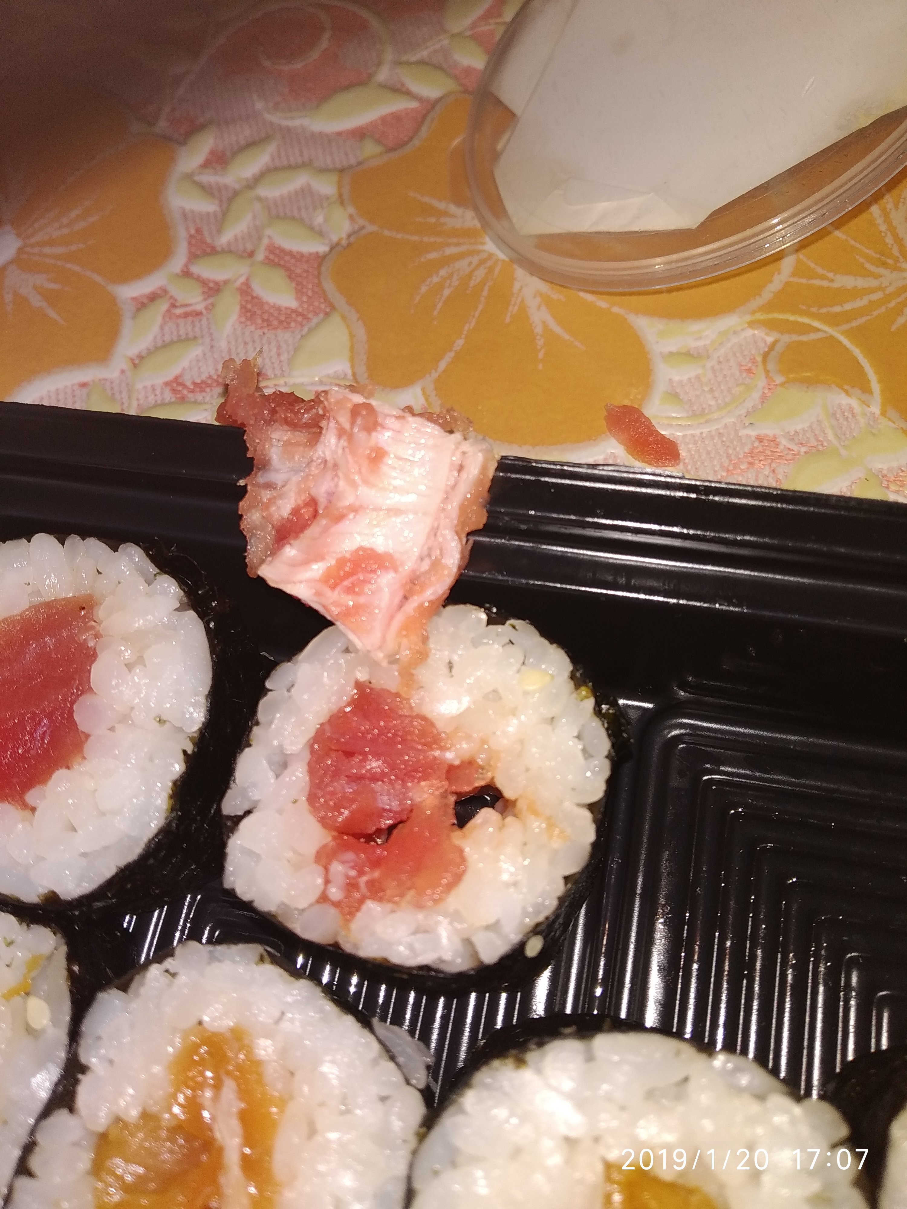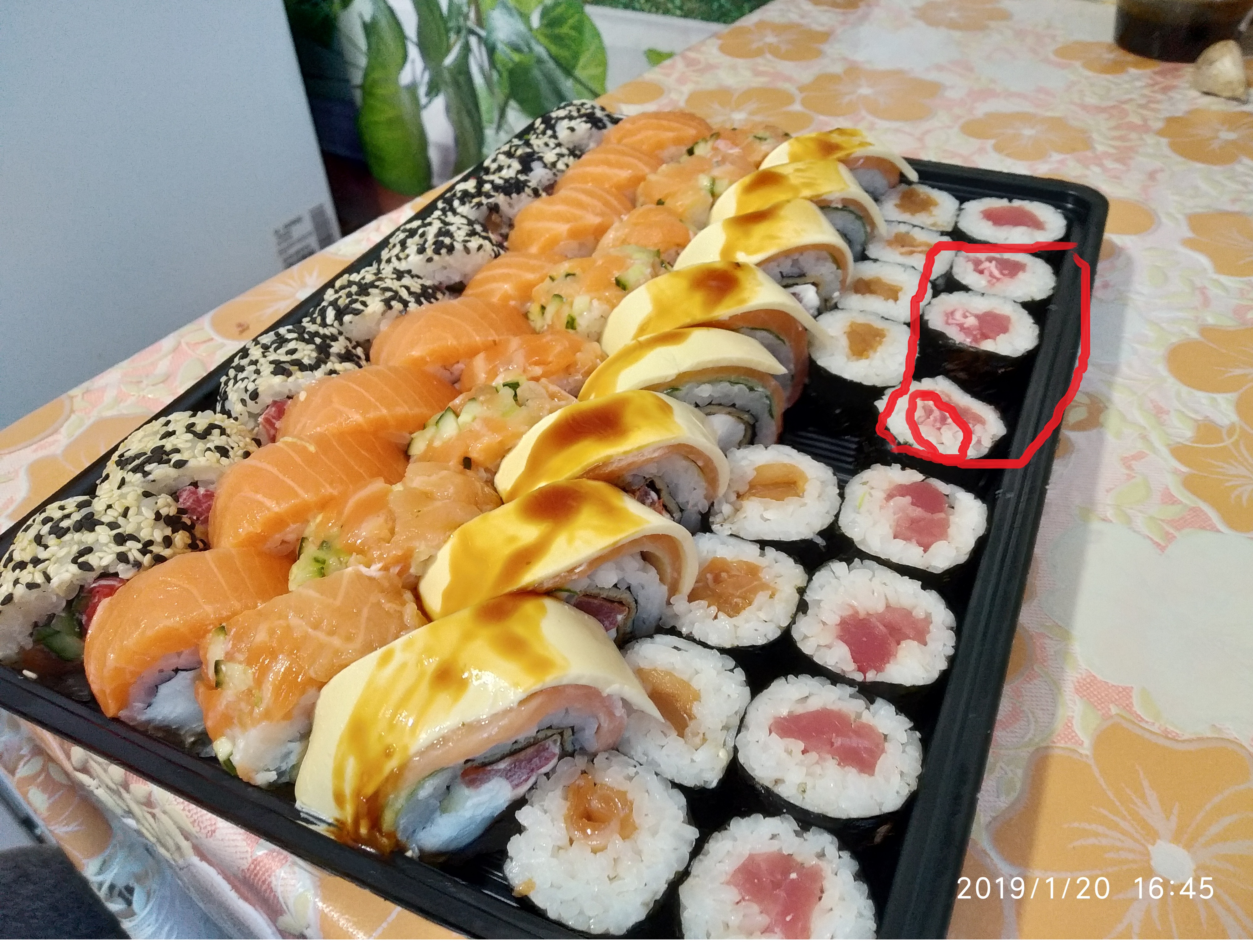 Заказали Сет "Раз два"  +филадельфия классик+подарок 20.01.19г...Вопросов сразу не было,почти,ни к качеству ,ни к виду роллов,казалось все идеально,учитывая ситуацию с прошлого раз,но не тут то было....я,конечно,все понимаю,может рыба(тунец) заканчивалась,хотя это врятли,может еще чего там случилось у поваров,но....все на фото четко видно,сразу обратили на этот момент внимание,подумали,что к тунцу доложили бекон,посмеялись и все,но когда ролл попал в рот,это просто ужас...положили плеву с мяса,(на фото очень хорошо видно).Ребятааааа,ну думайте головой!!!!мы ваши постоянные клиенты,и вкусы большинства ходовых роллов знаем(отличить рыбу от мяса,а тем более плевку,которая не жуется,может каждый ).Лучше бы вообще не чего не положили в середину....