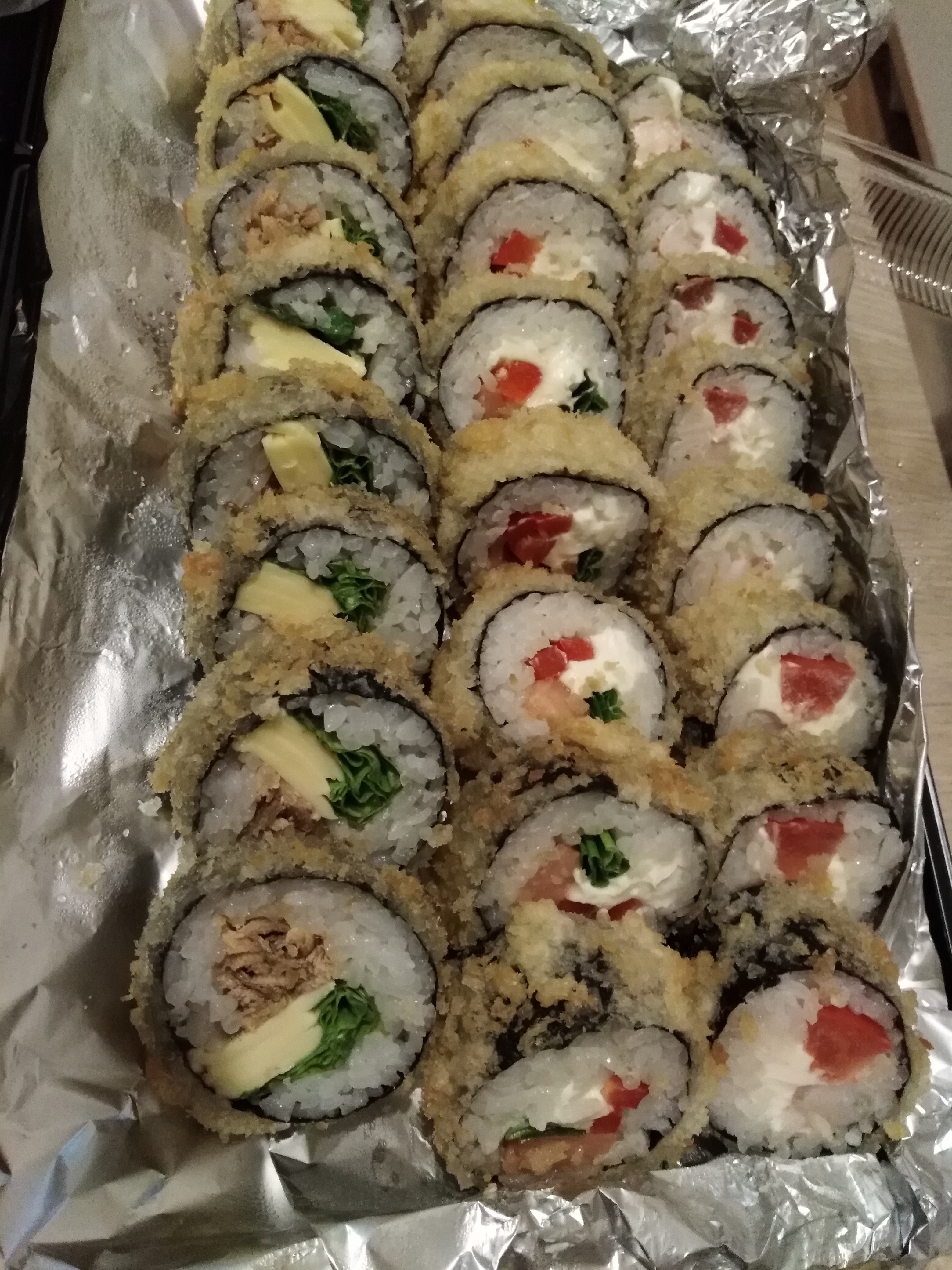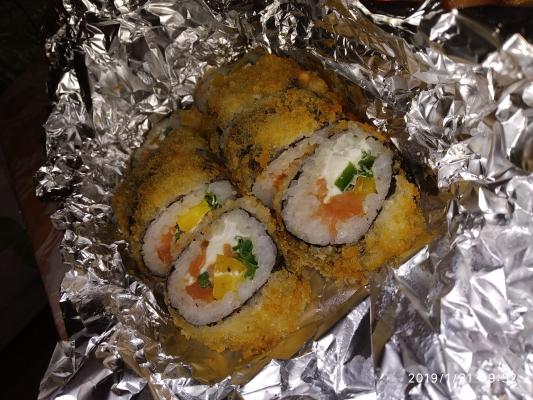 - ролл с лососем терияки, сыр чеддер, сухари темпурные, нори, рис, спайси соус (8 шт)