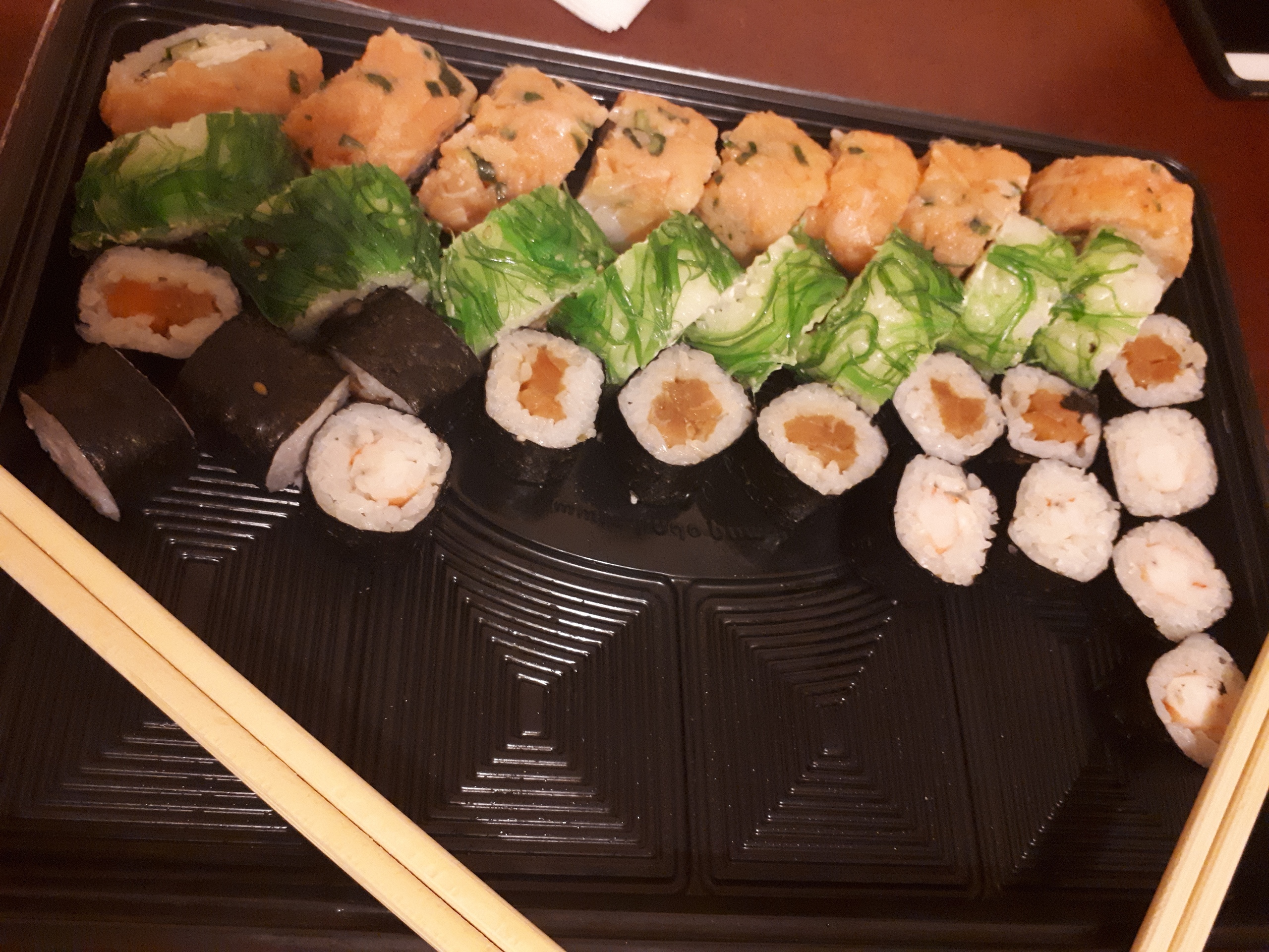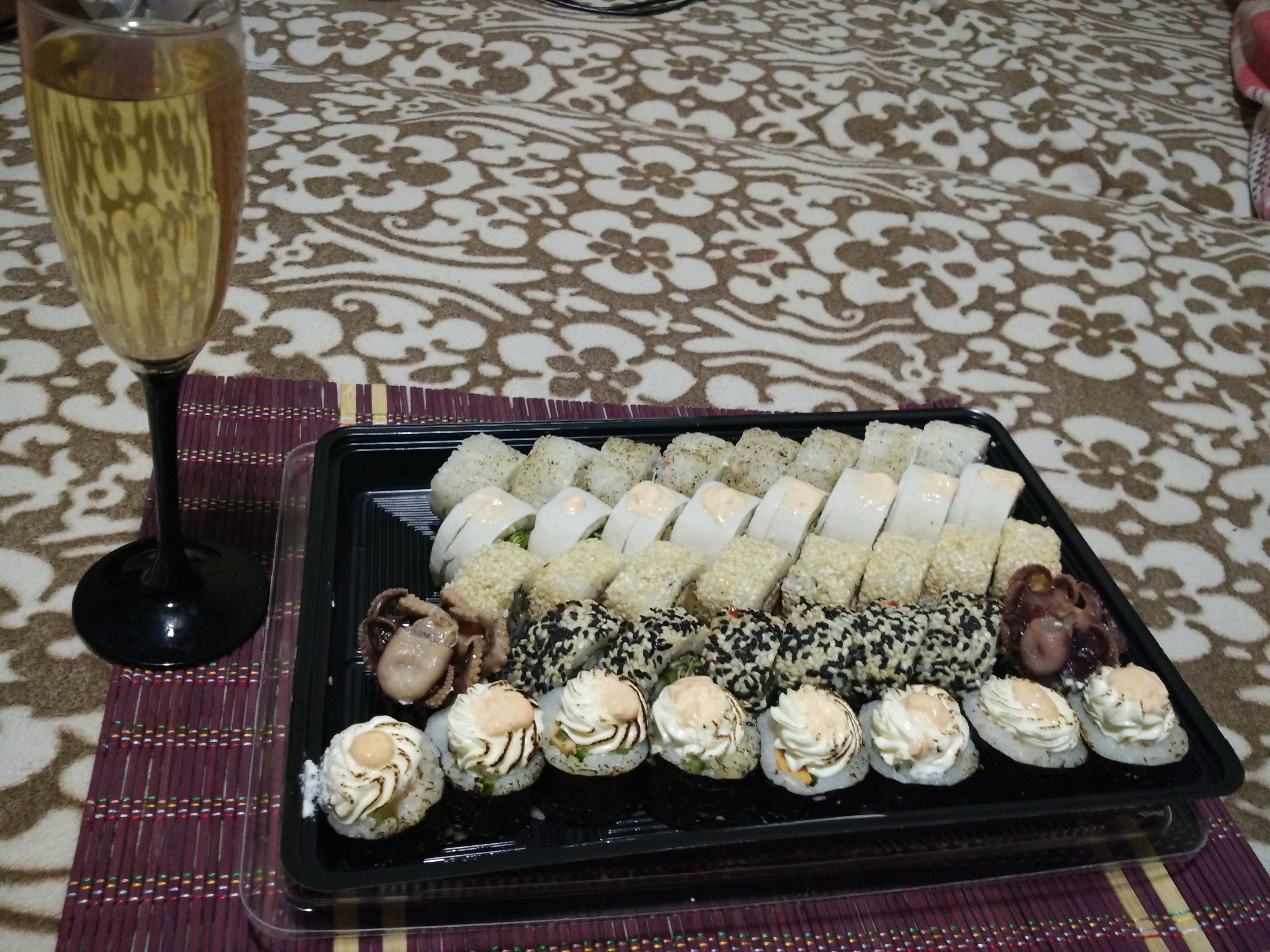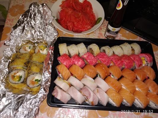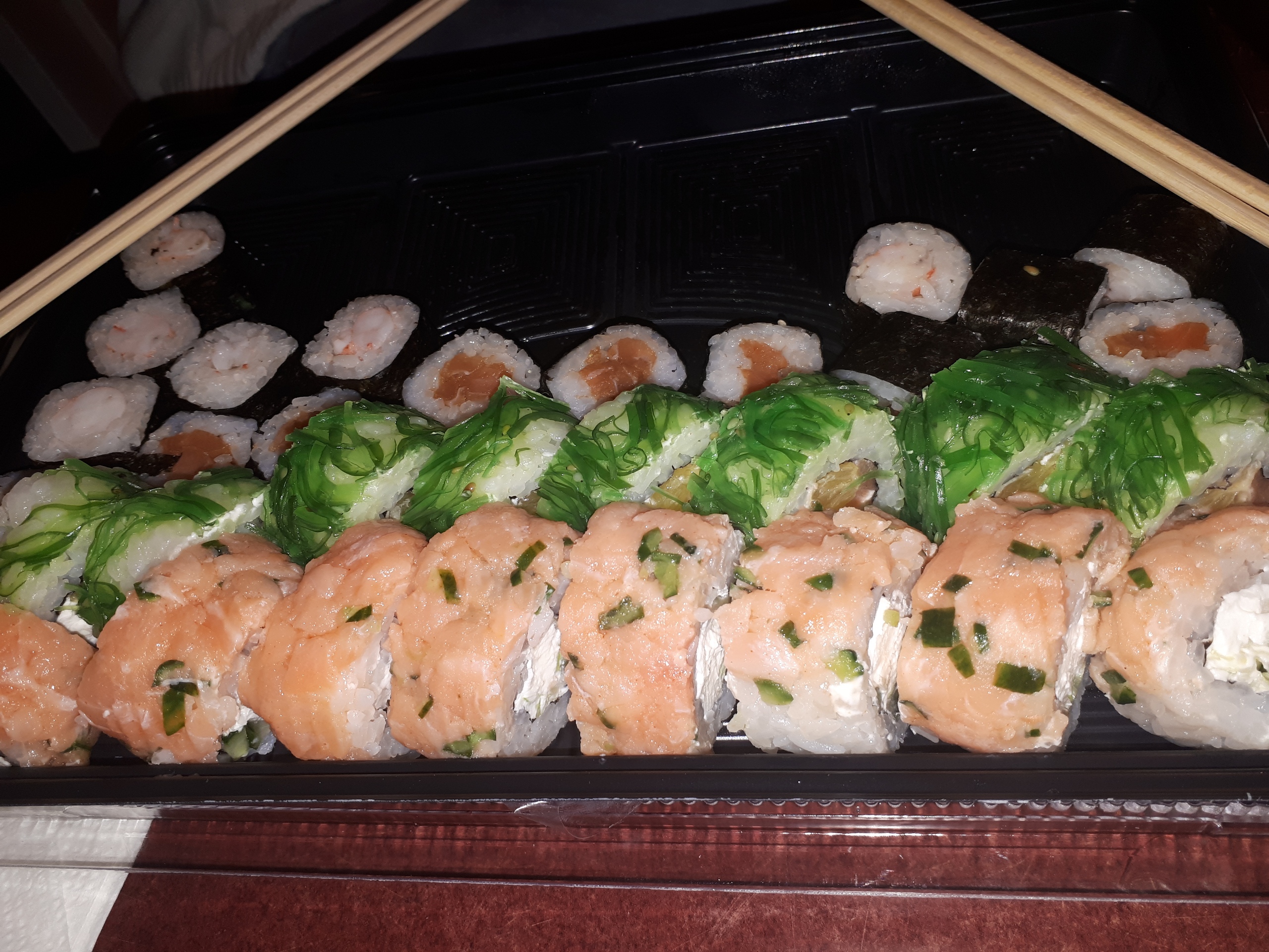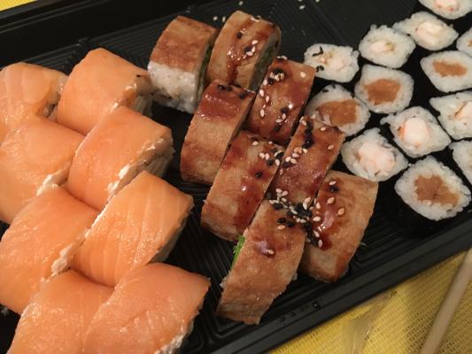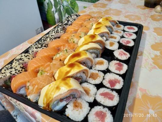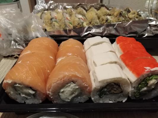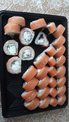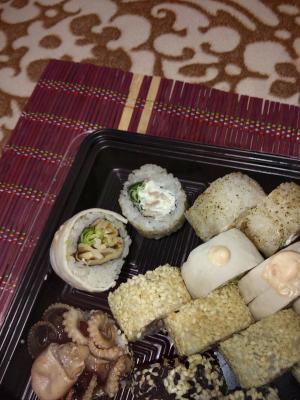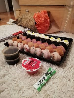 Заказывала суши в пятницу вечером на самовывоз, пришла в назначенное время, все было уже готово. Сет Посейдон. Суши очень вкусные, особенно понравились зелёные "гейша ролл" (они с апельсином, необычный вкус). Советую)