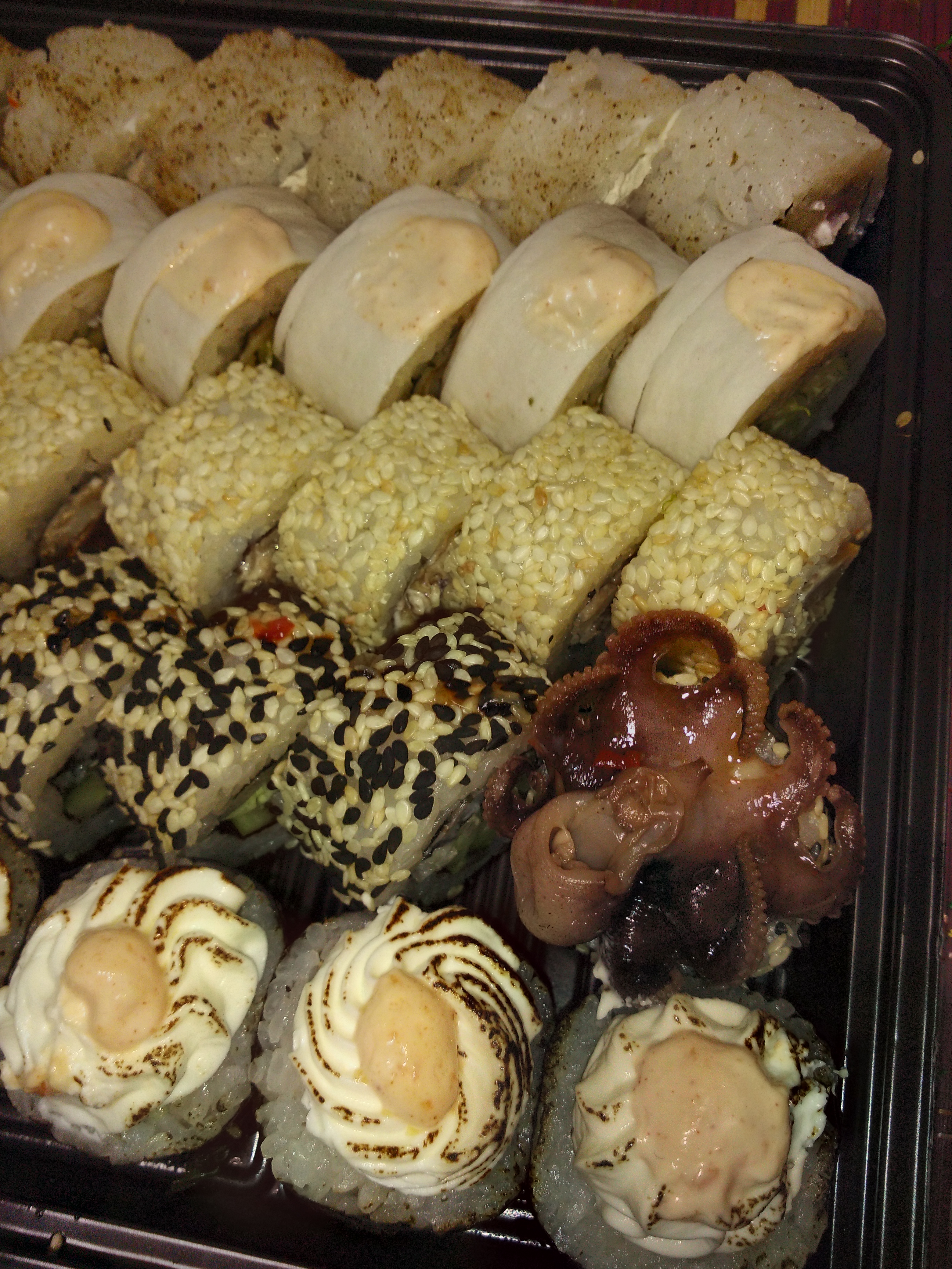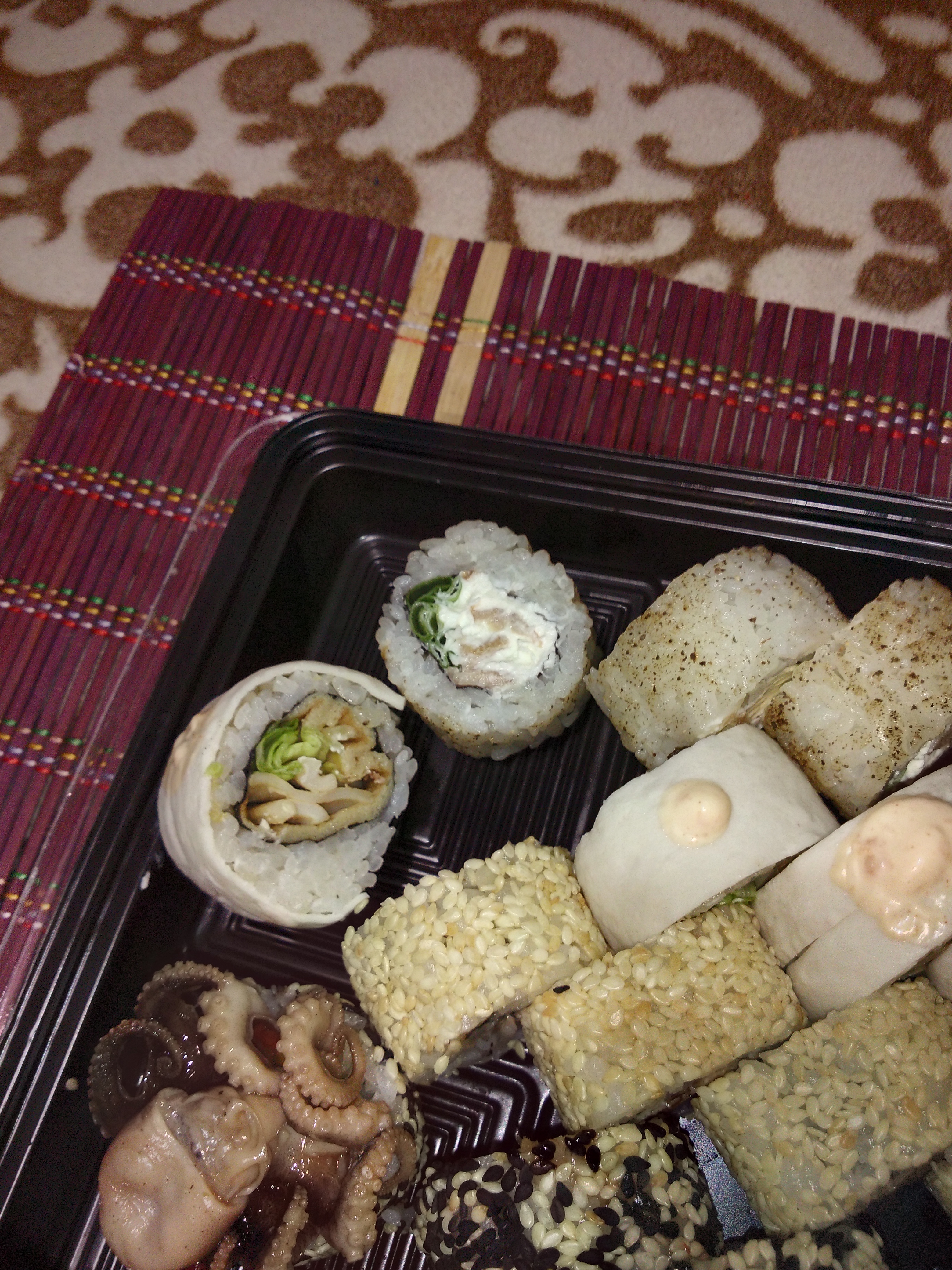 На фото наше новое открытие - сет Мореман, уже несколько лет балуем себя вкусняшками  от Сушиленд и почти не экспериментируем. Но в этот раз захотелось чего-то новенького. Итак, "отдыхающие" на роллах осьминожки смотрелись очень мило (и вкусно), ролл с крем-сыром сверху отличный... В общем, неплохой сет на морскую тематику. Единственное, что нам не зашло - это ролл  "Тако", кажется. С осьминогом, огурцом, в кунжуте чёрно-белом. Кроме огурца ничего не почувствовала, пресно и скучно. Может быть, если бы кунжут был поджарен, то хоть какая-то изюминка присутствовала. Я бы пересмотрела рецептуру. Ну и такое очевидное несоответствие фотографии на сайте впервые вижу :) Друзья даже предположили, что перепутали сет.
