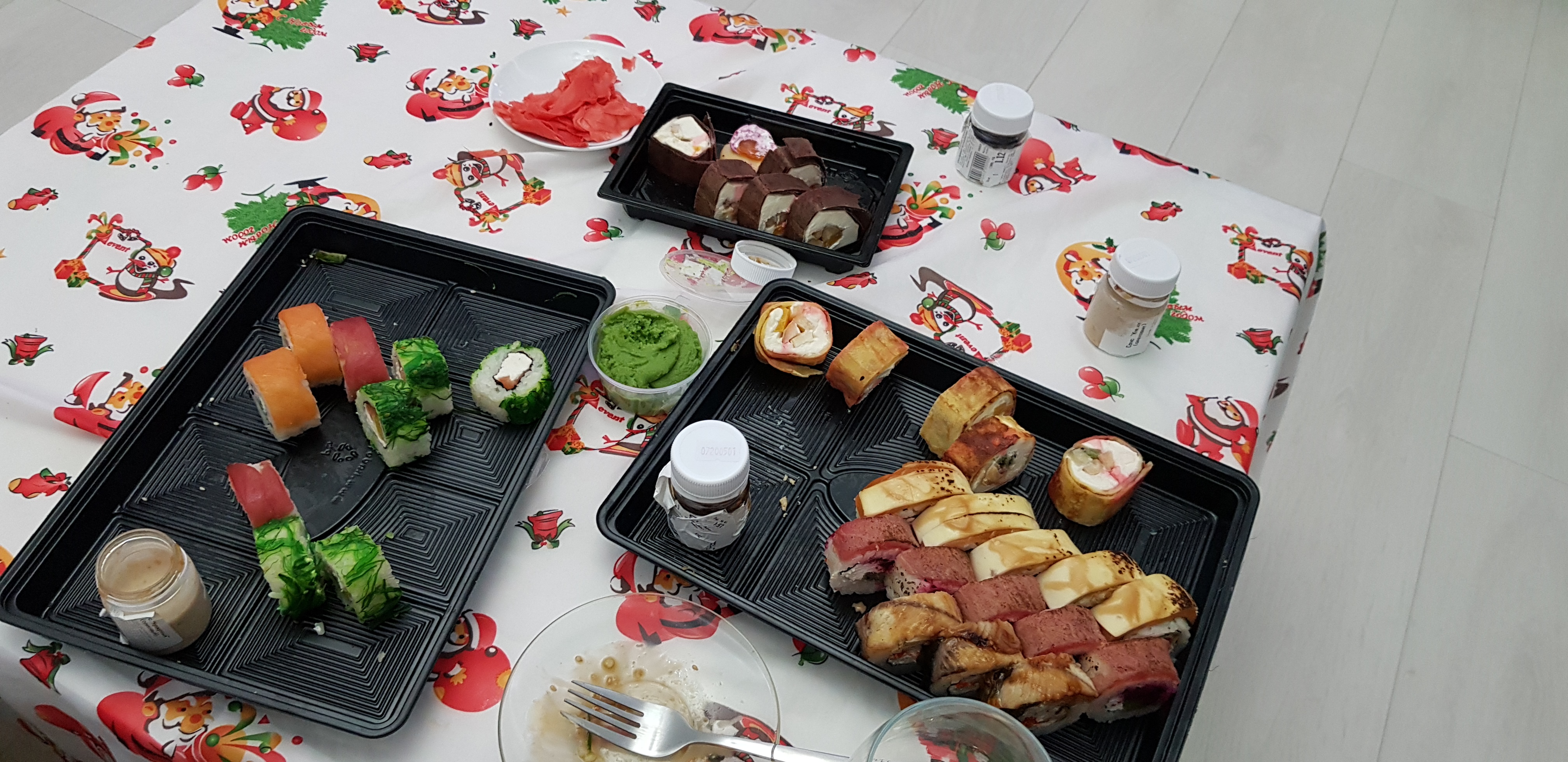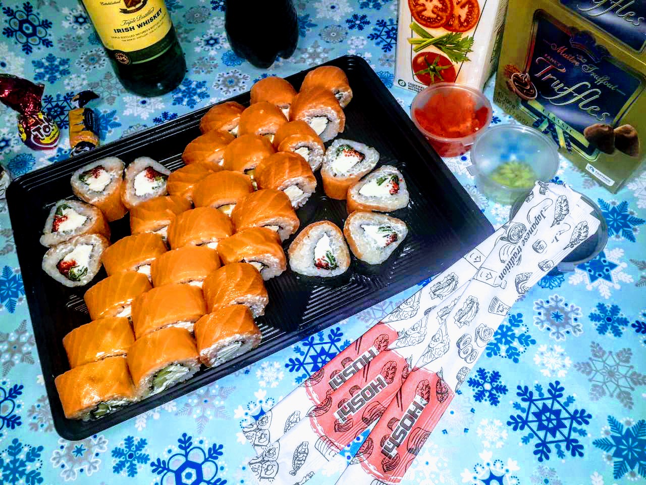 И все остались очень довольны, кроме суши практически на стол сильно и не накрывали, поэтому оценили их все и даже Дедушка Мороз!!Вкусные и нежные роллы под шампанское одно удовольствие!!!)