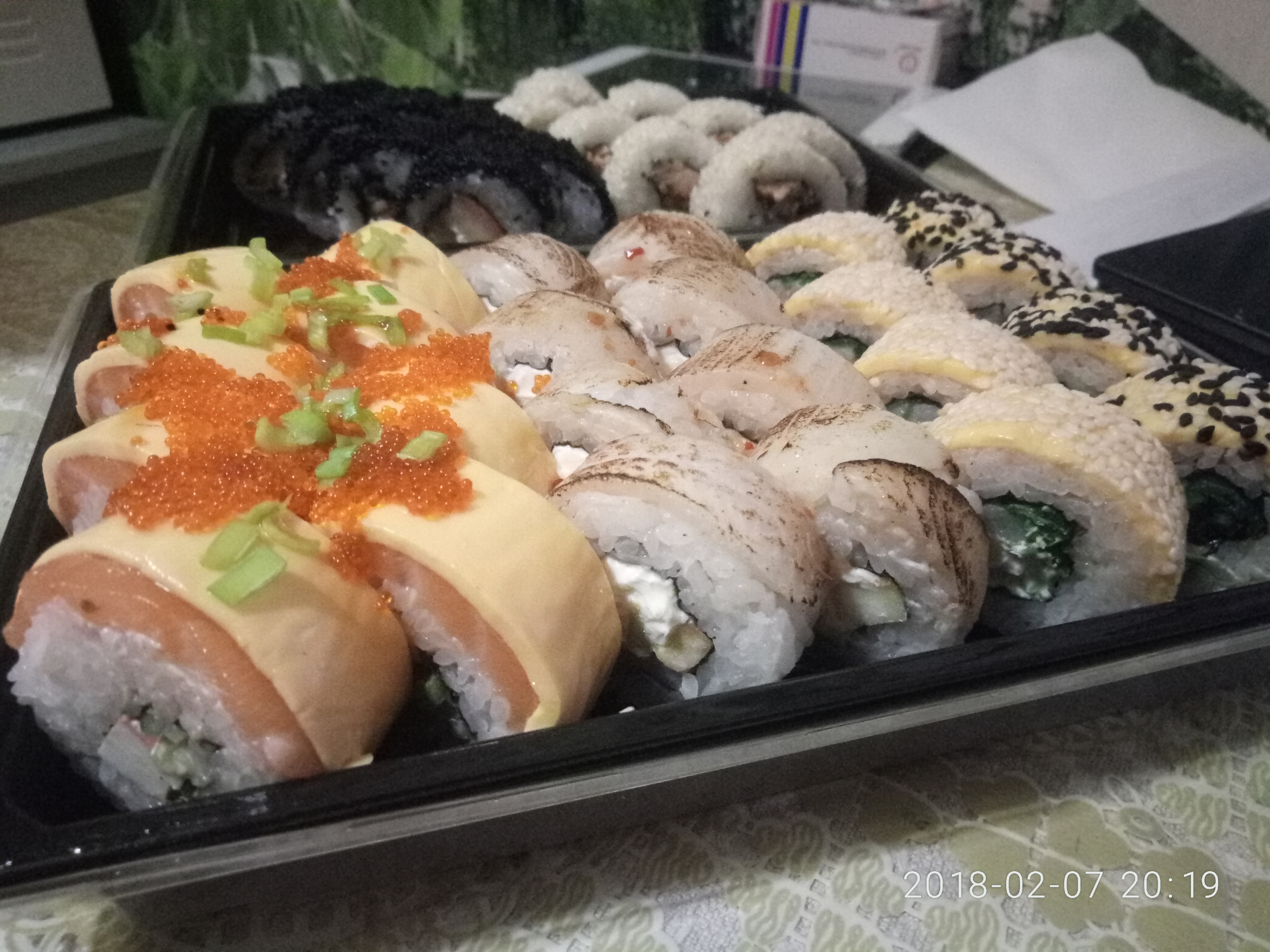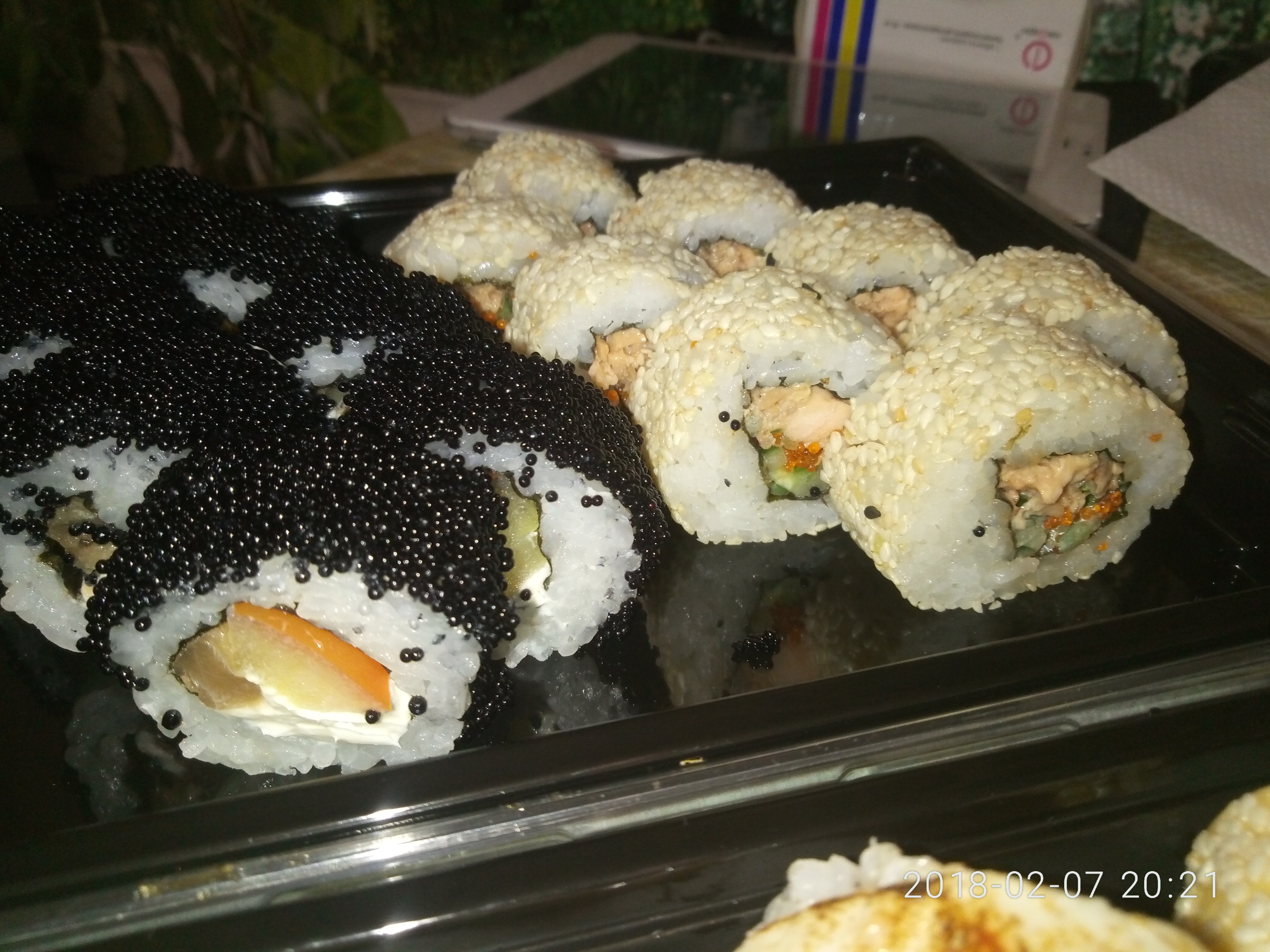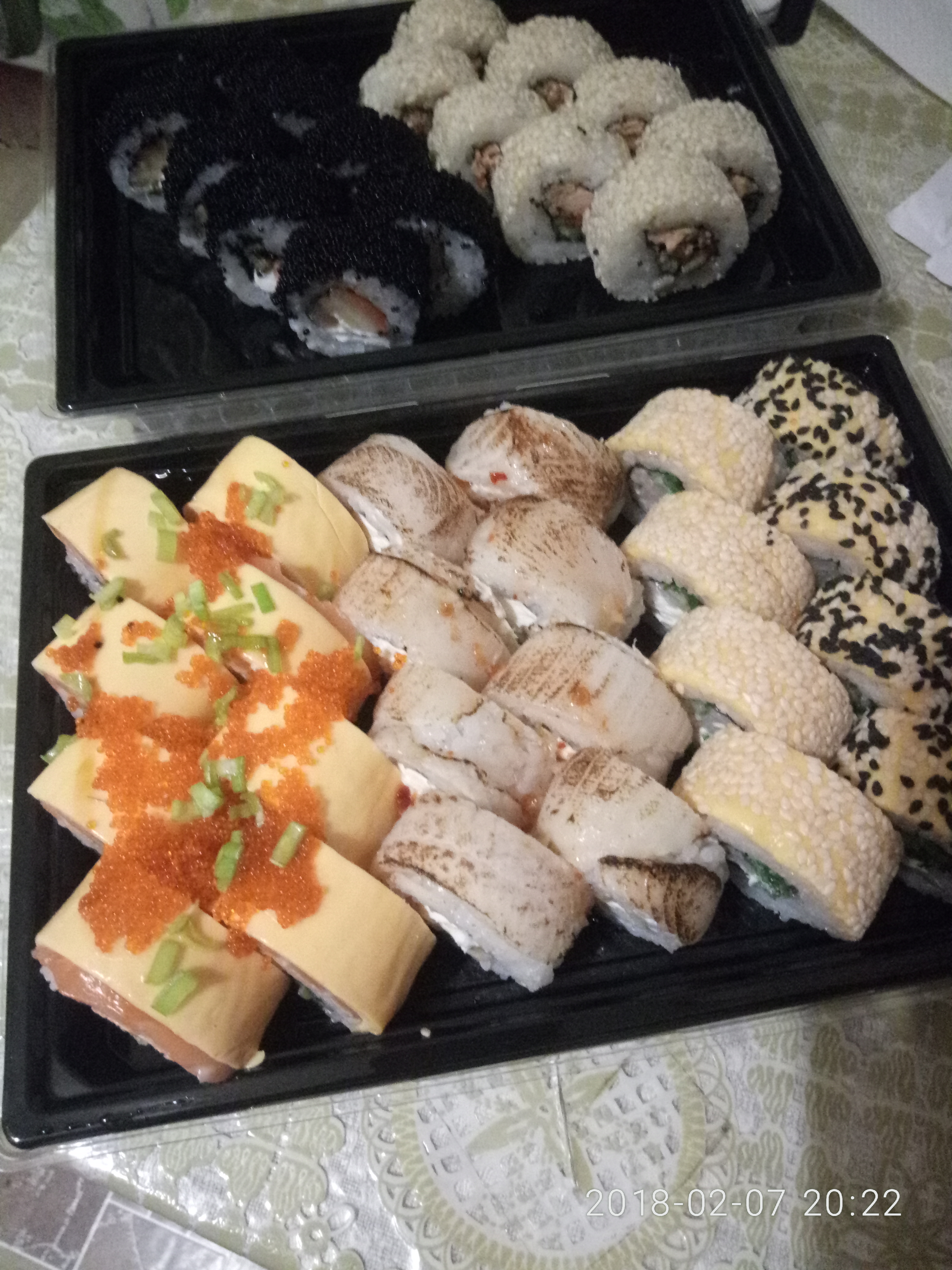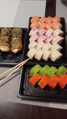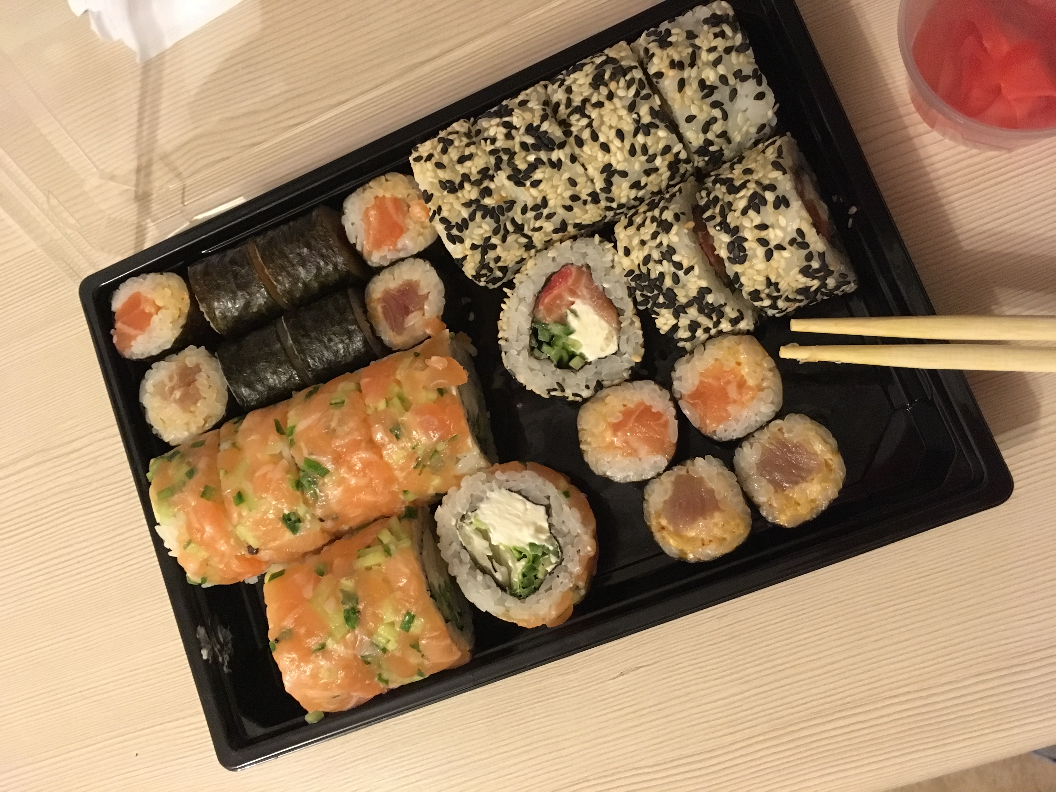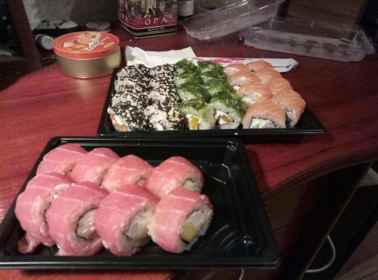 Суши очень вкусные. Еще порадовало, что даже после 22.00 можно сделать заказ. А то мы, часто бывает, только ближе к такому времени понимаем, что хотим что-то пожевать на ночь)
