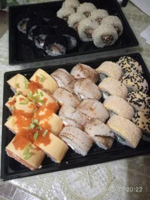 Суши очень вкусные, но доставка слишком долгая. Обещали доставить через 1,5 часа, а привезли через 2.10, и это был не праздничный день