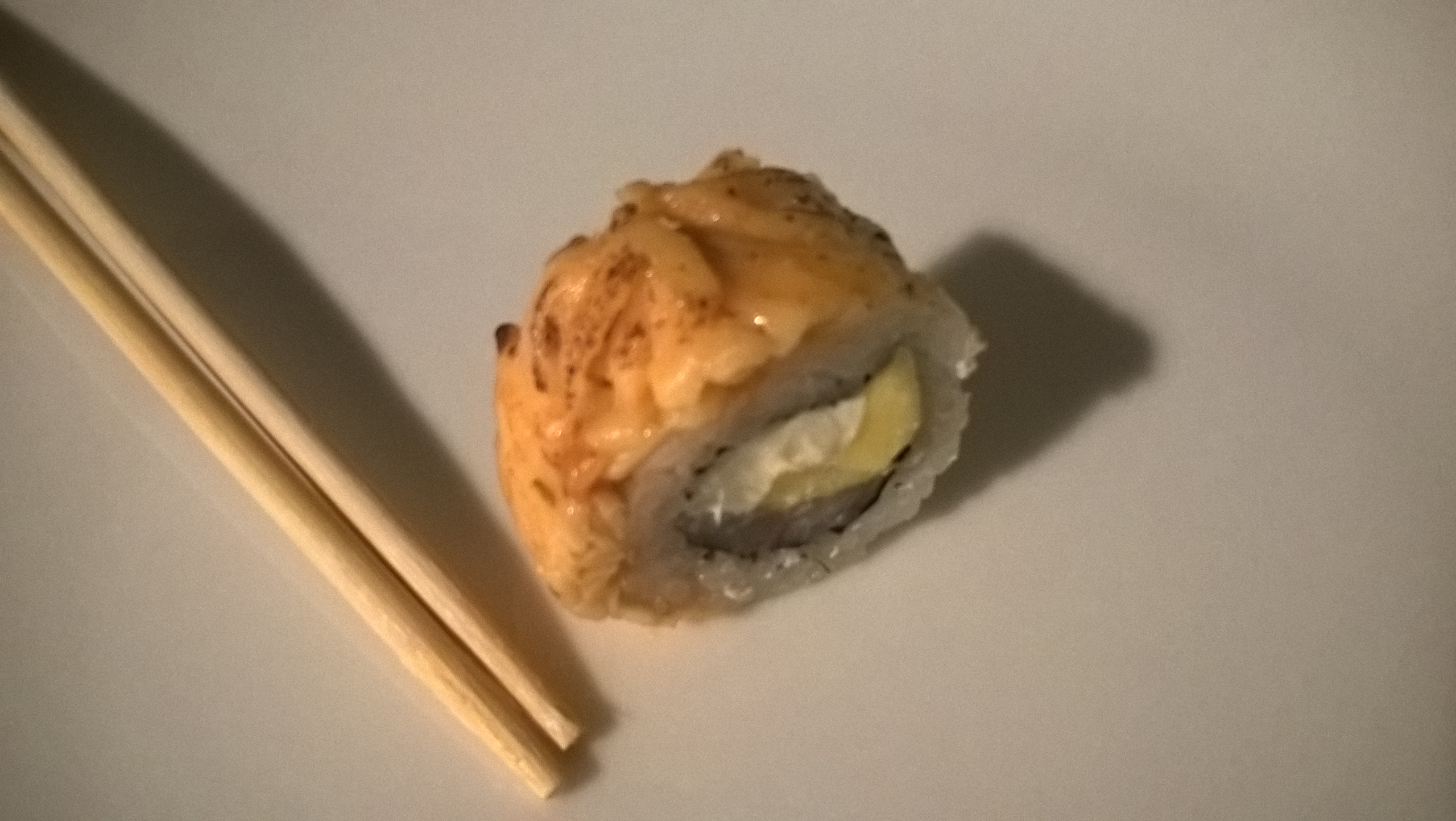- ролл с лососем терияки, сыр чеддер, сухари темпурные, нори, рис, спайси соус (8 шт)