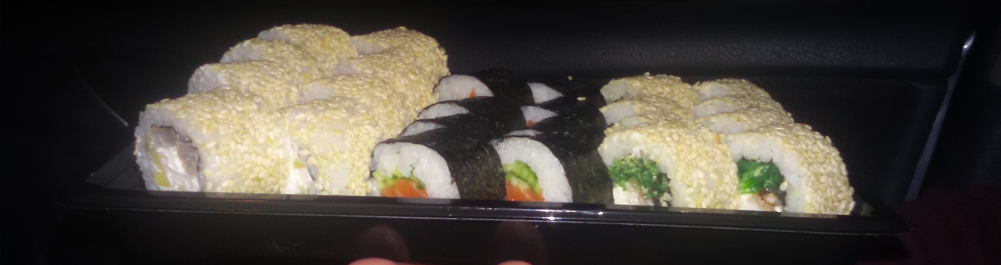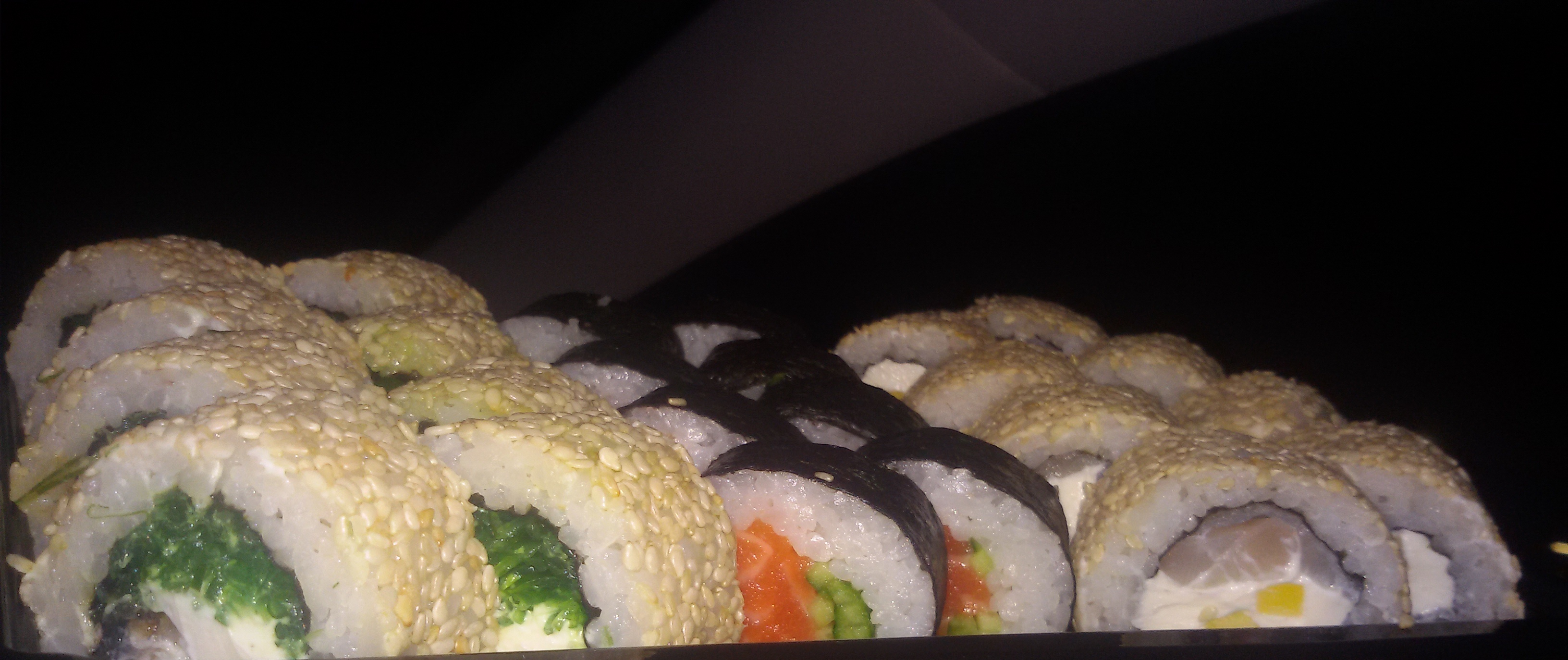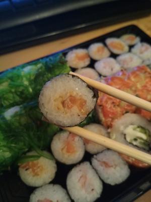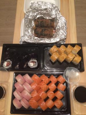 В итоге наш заказ я держала в руках в 22:52. Ладно, вечер мы нашли чем занять и без роллов, пока томились в ожидании, но... Сет приехал, а обещанного приятного дополнения нет. А некоторые роллы выглядят так, словно у вас очень много лишнего риса, но совсем не осталось рыбы.