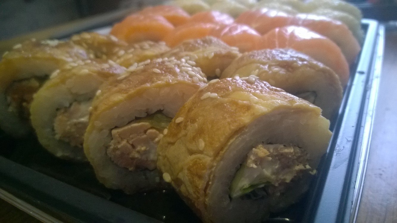 - ролл с лососем терияки, сыр чеддер, сухари темпурные, нори, рис, спайси соус (8 шт)