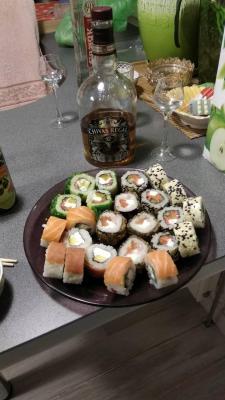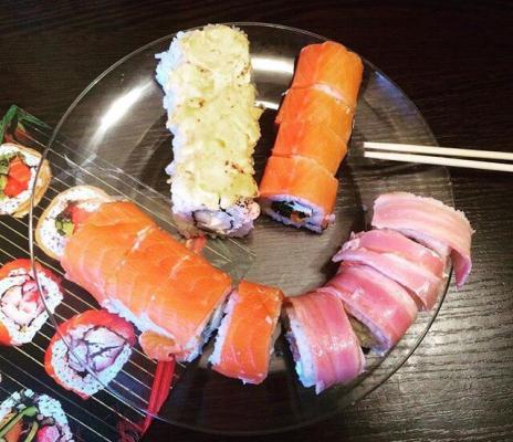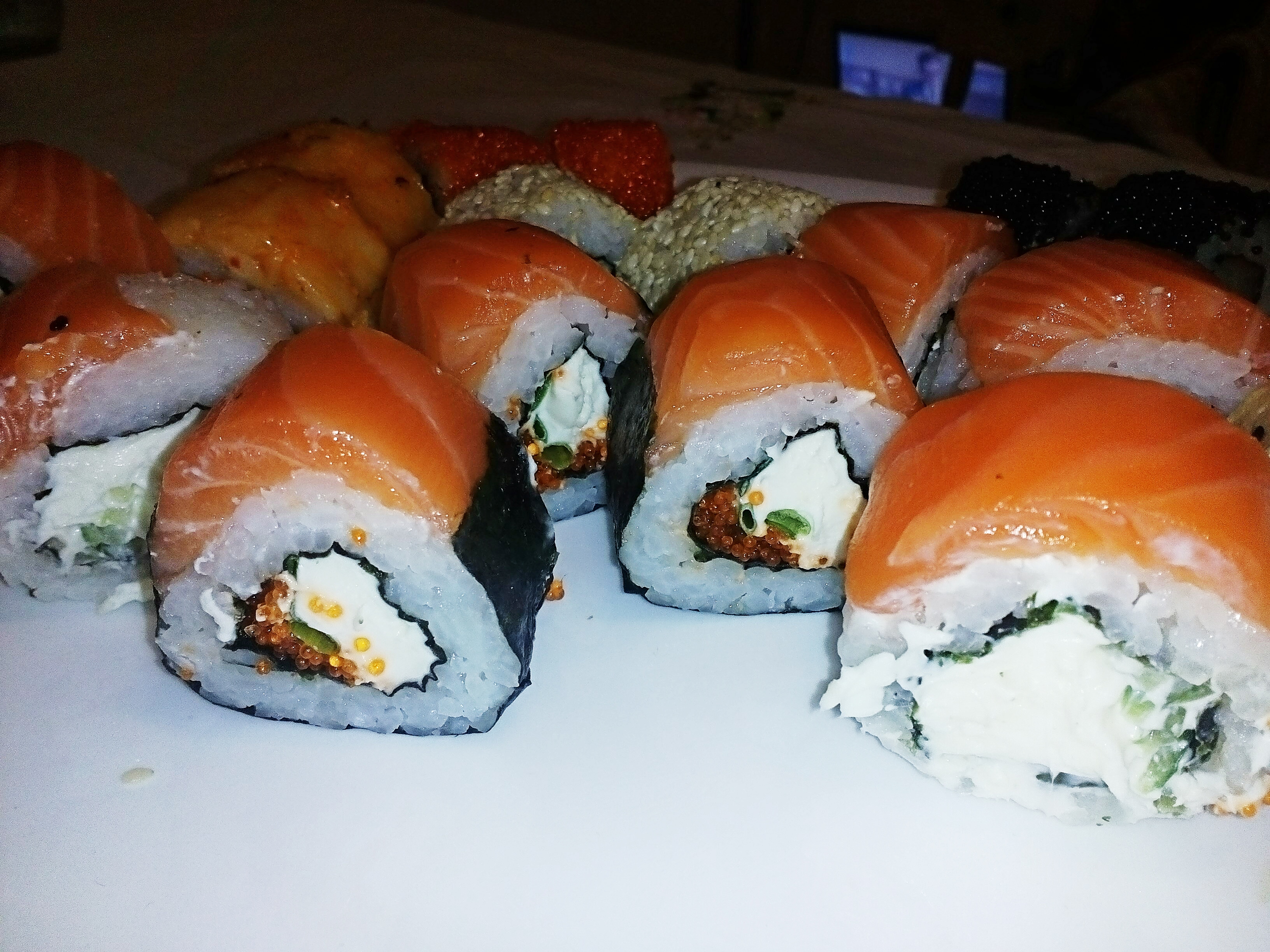 - ролл с лососем свежим сверху, сливочный сыр, авокадо, нори, рис (8 шт)