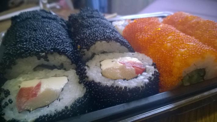 - ролл с мидиями в соусе терияке, свежий огурец, сливочный сыр, панировка икра летучей рыбы, нори, рис (8 шт)
