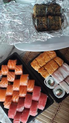 - ролл с лососем терияки, нори, рис, сливочный сыр, стружка тунца (8 шт)