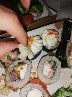 4) Подача - скудная , суши придавлены , сливочный крем сверху коробки весь и остался , сами суши все слипшиеся , как-будто они уже давно лежали