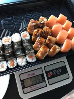 Заказывали тут постоянно, очень нравились. Но! в последние разы заметили, что суши стали намного меньше. Заказали опять и решили взвесить сет сузуши (заявлено 730г). На фото видно что сет весит 635 грамм - 50 (коробка) = 585 грамм. Где остальное? Вот делали же нормально, зачем скатываться и обманывать... Сегодня уже заказали у другой компании