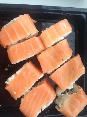 - ролл с лососем свежим сверху, сливочный сыр, авокадо, нори, рис (8 шт)