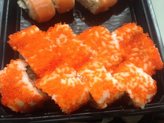 - ролл с лососем, майонез, свежий огурец, панировка икра летучей рыбы (8 шт)