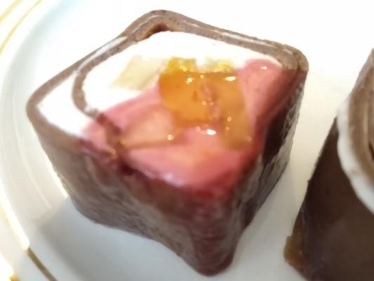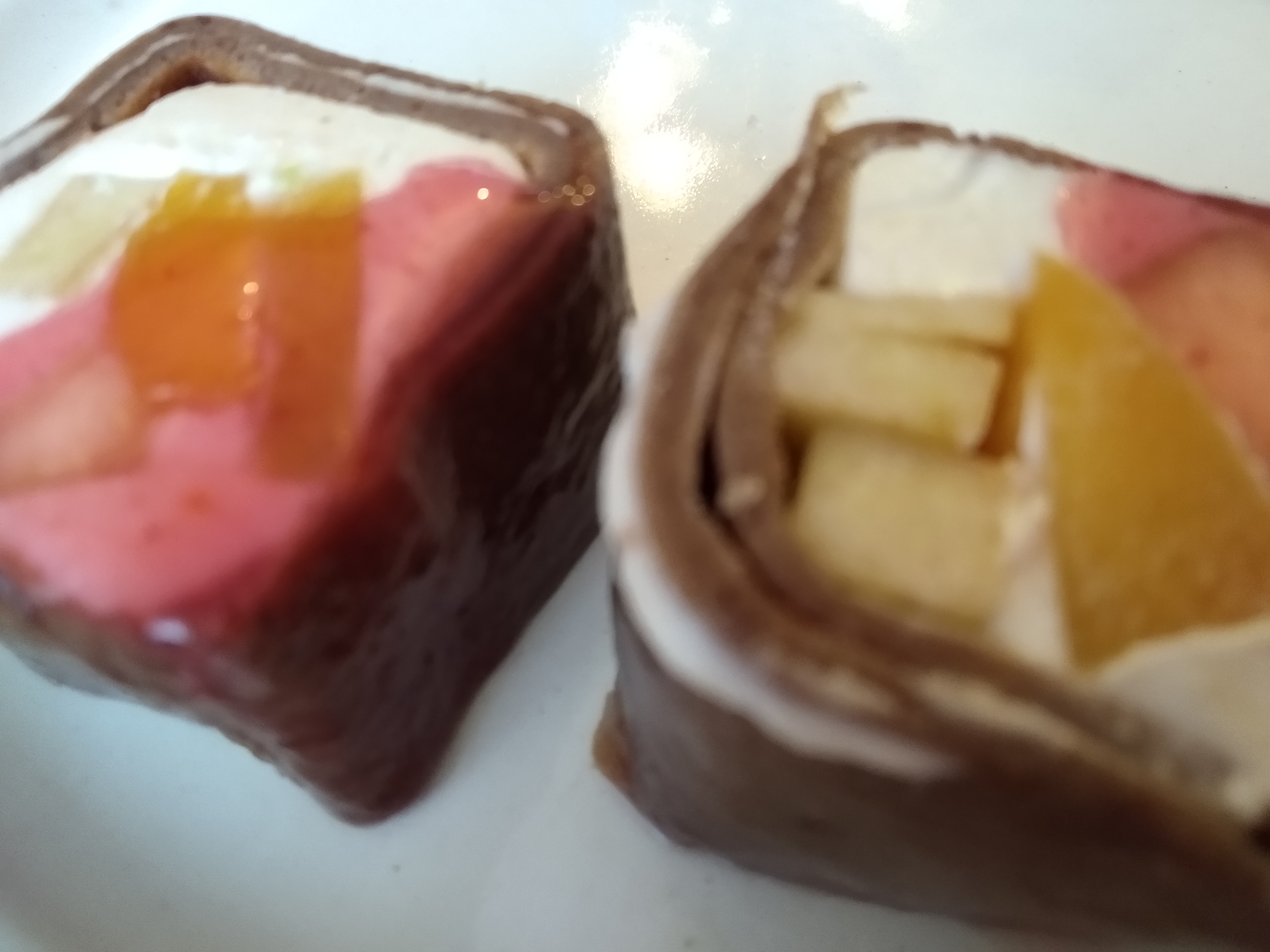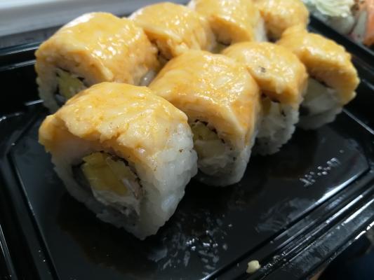 - ролл со сливочным сыром, яблоко, манго, окунь, сыр твердый со спайси соусом, рис, нори (8 шт)