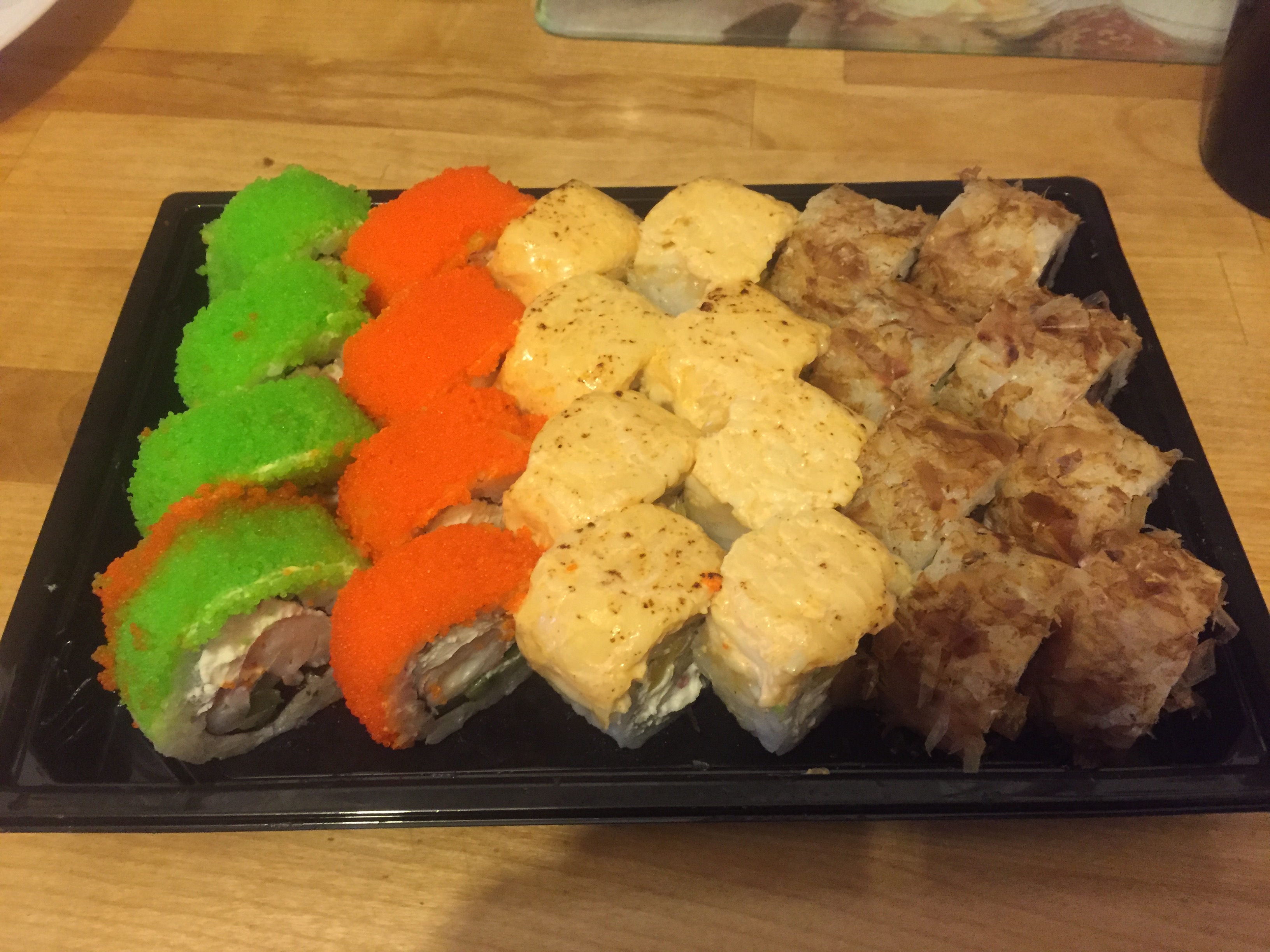 - ролл с лососем, майонез, свежий огурец, панировка икра летучей рыбы (8 шт)