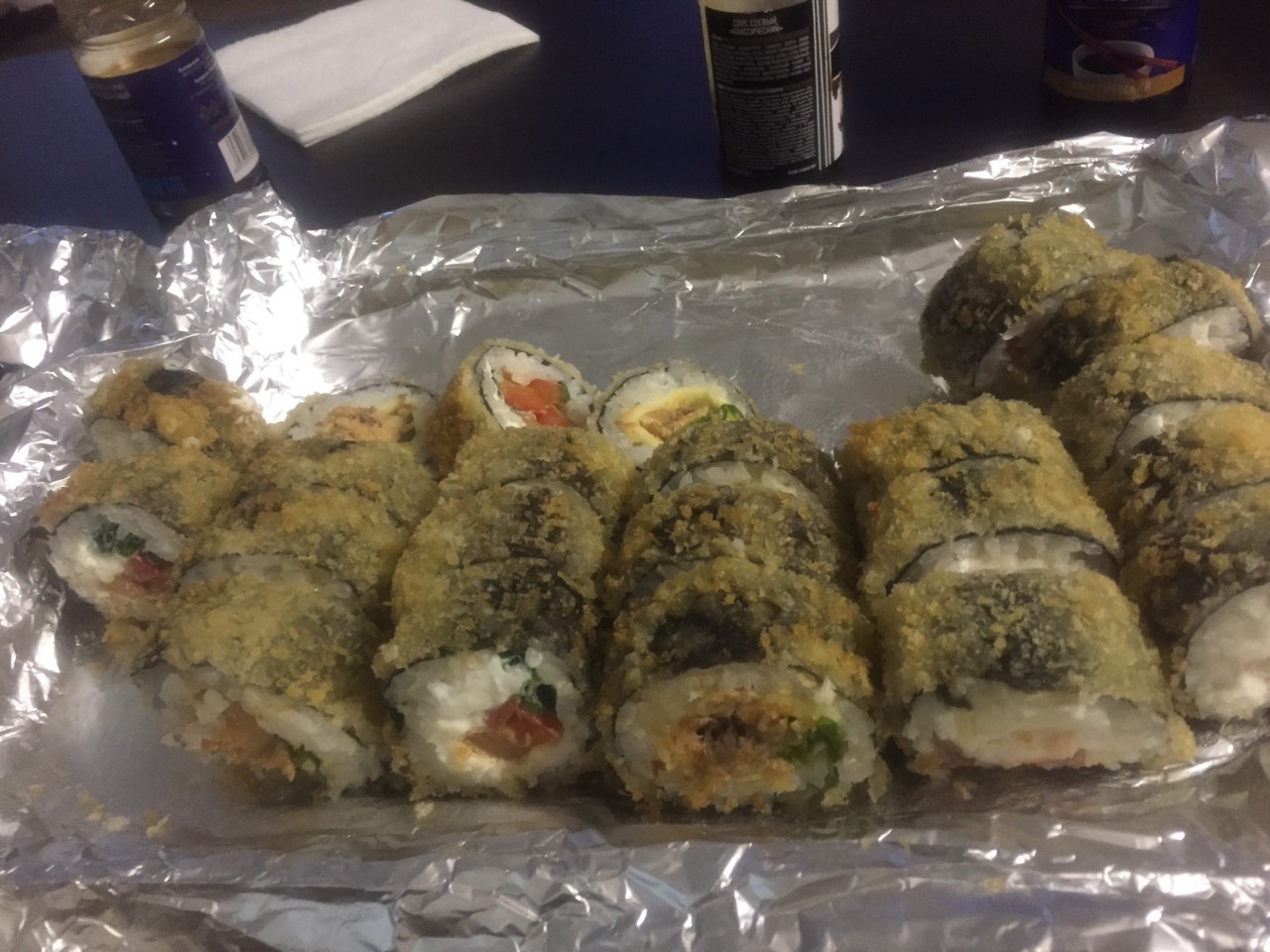 - ролл с лососем терияки, сыр чеддер, сухари темпурные, нори, рис, спайси соус (8 шт)