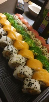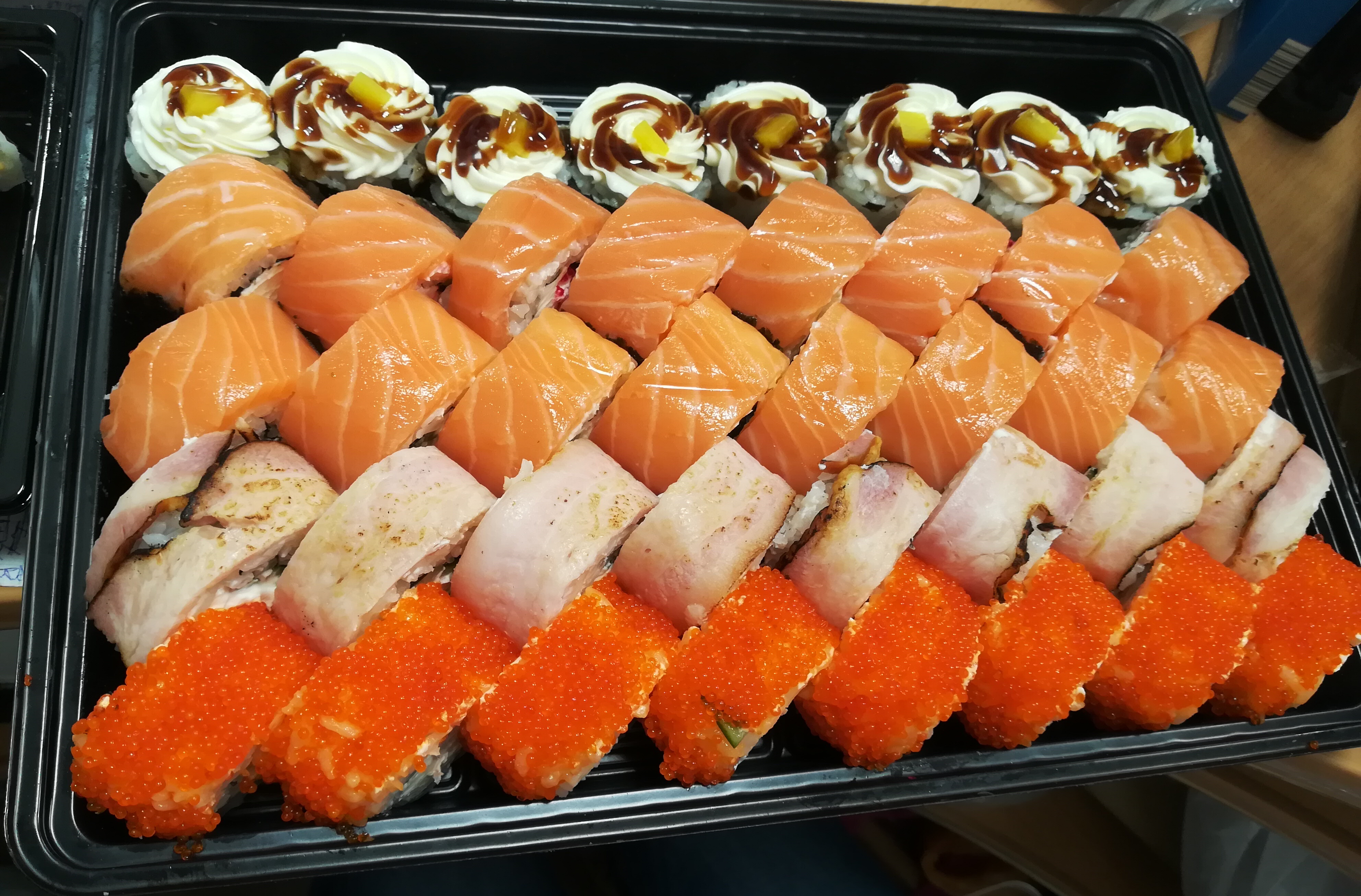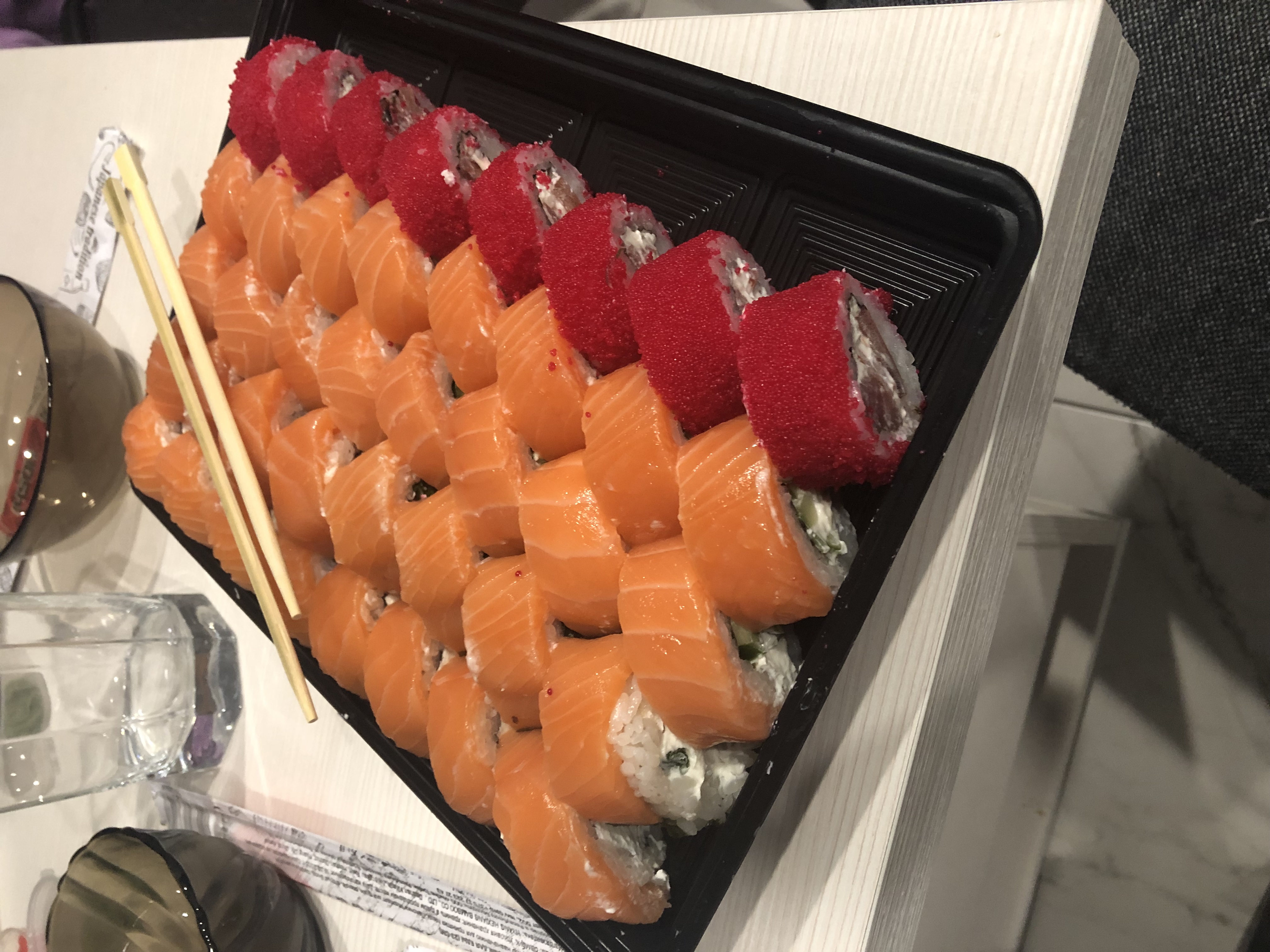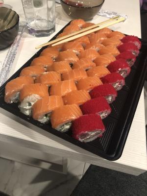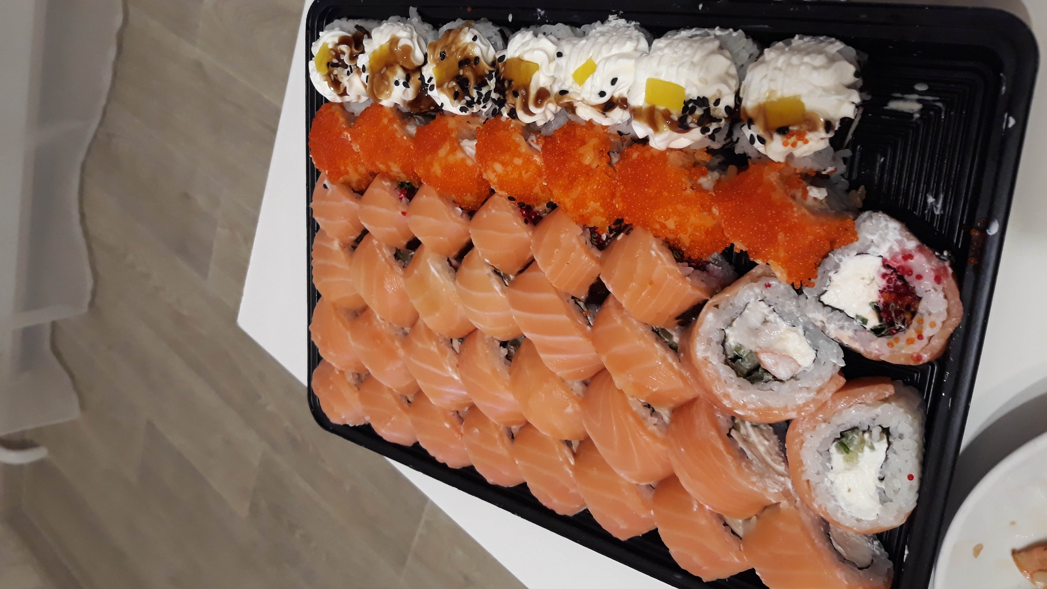 - ролл с лососем свежим сверху, сливочный сыр, авокадо, нори, рис (8 шт)